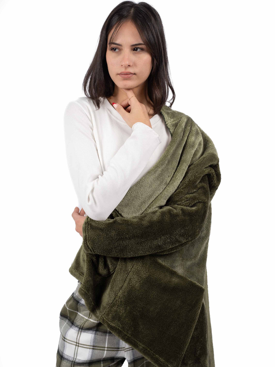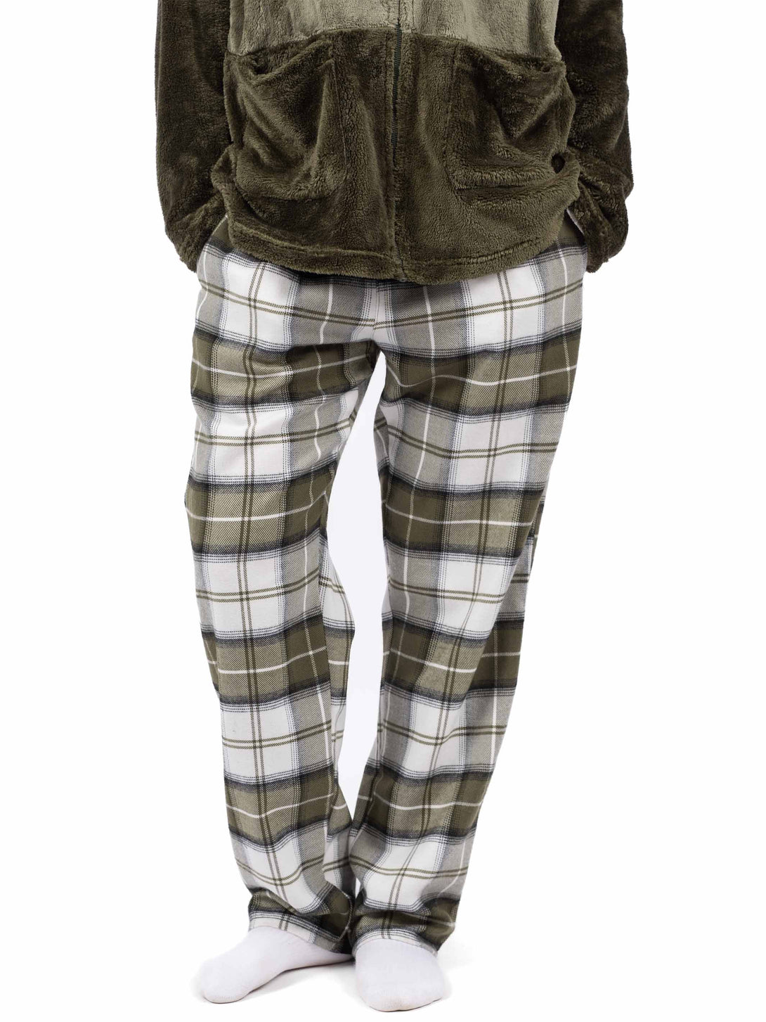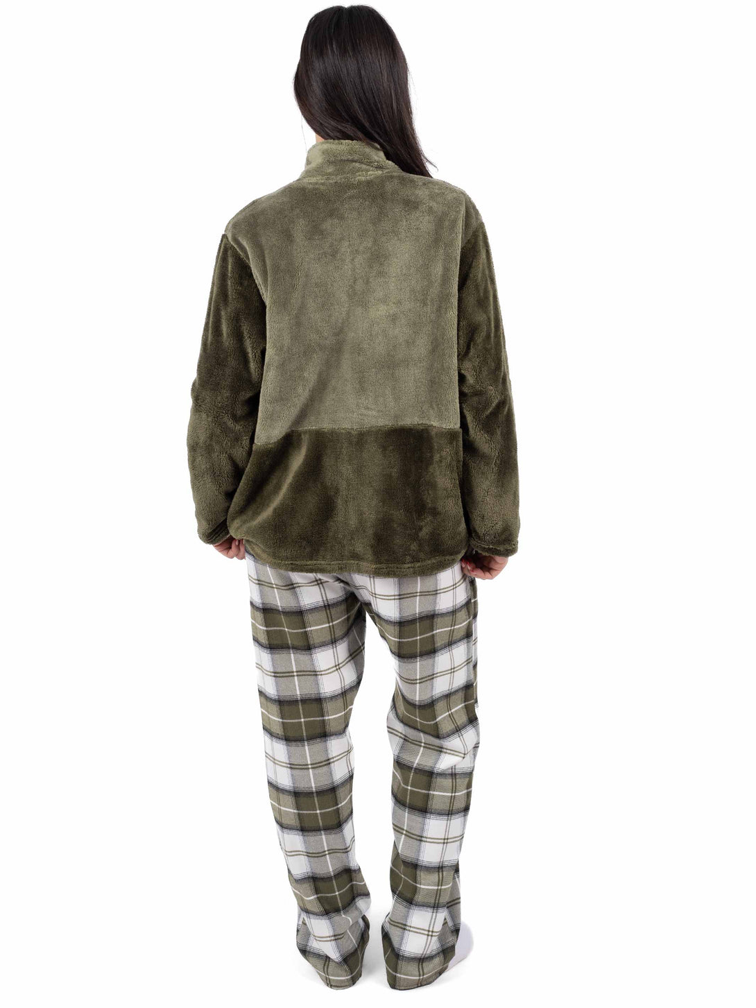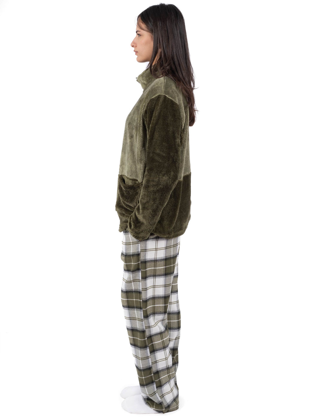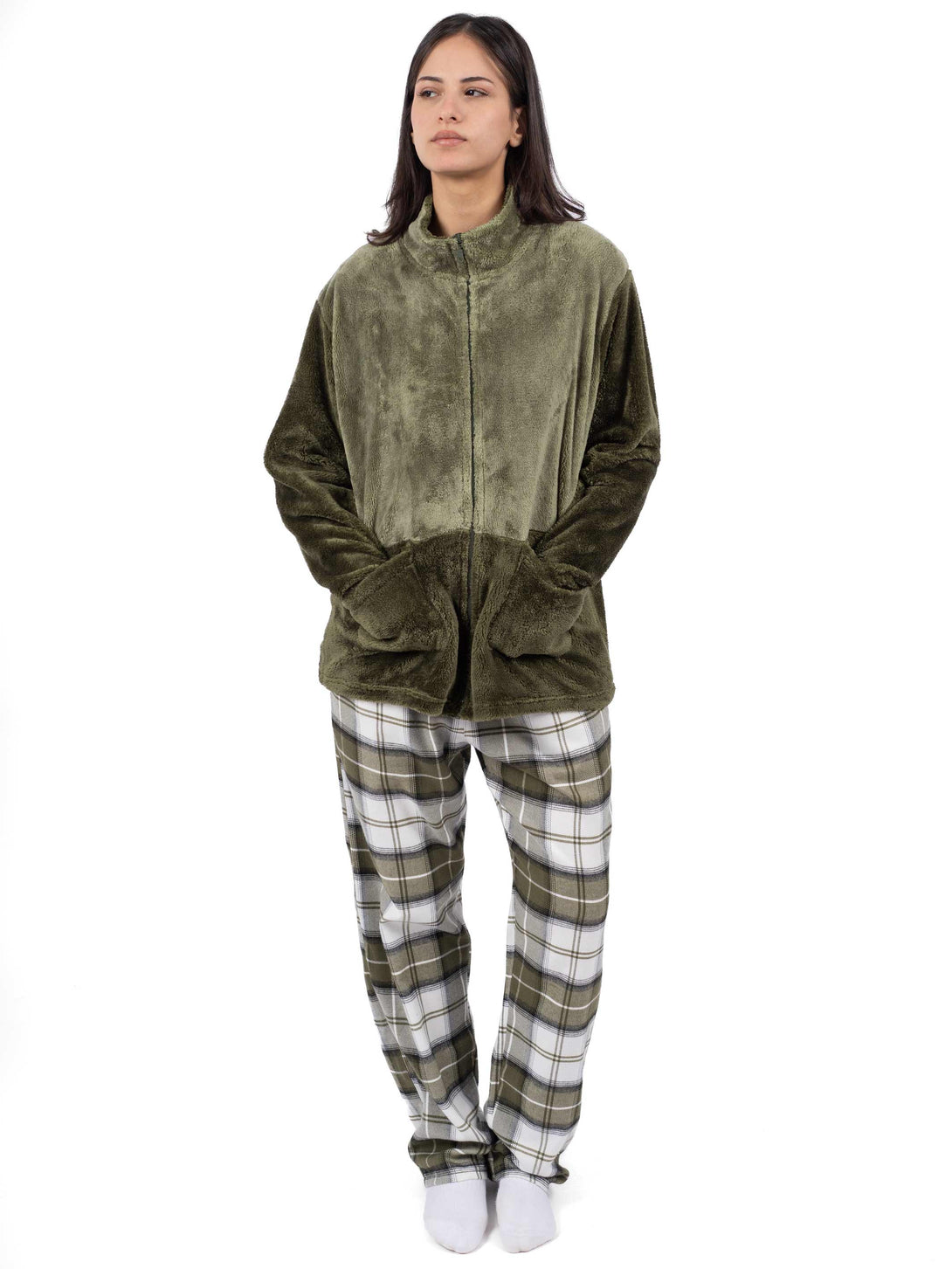 A three pieces pyjama set consist of a fluffy Furry fleece zip up jacket, ribbed long sleeve top and checkered pants with two side pockets.
