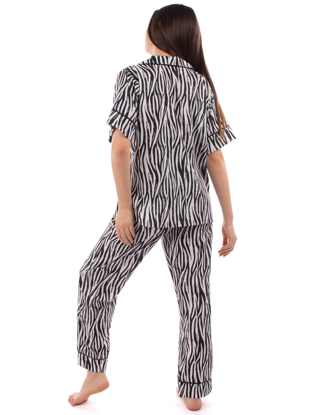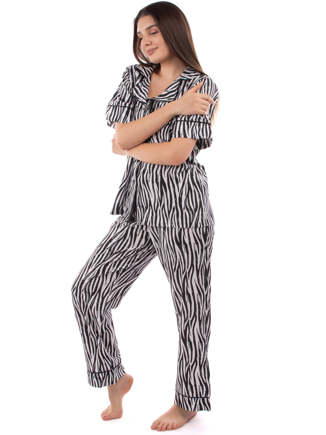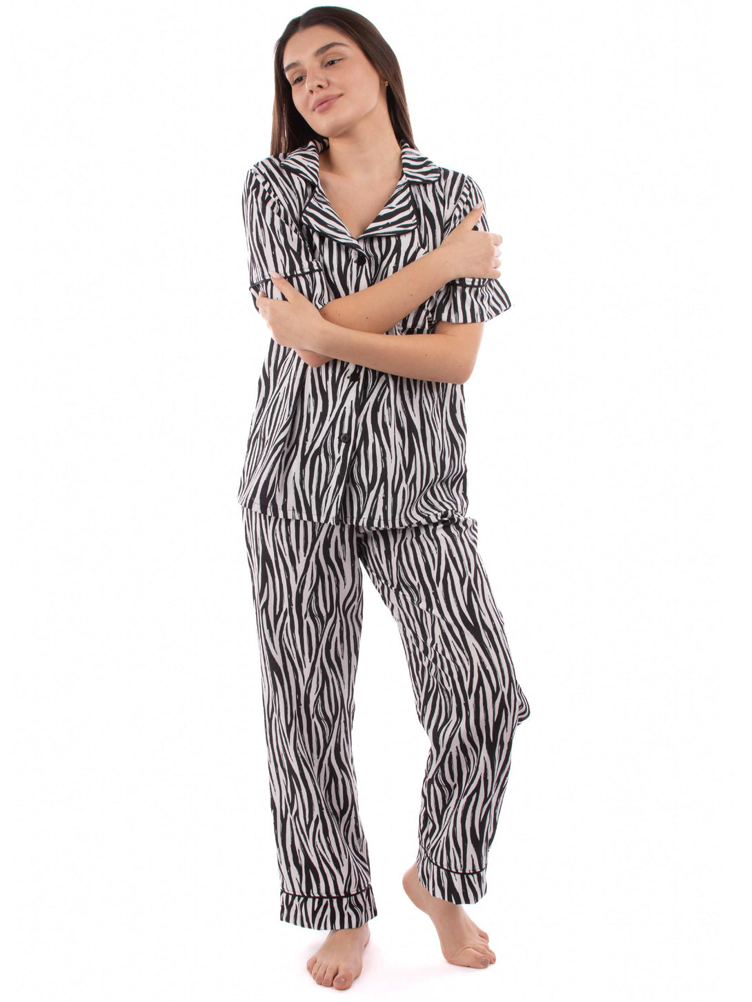 Pyjama Set, a Shirt with V-neckline and buttons down the front, chest pocket. Bottoms with an elasticated waist and straight legs.