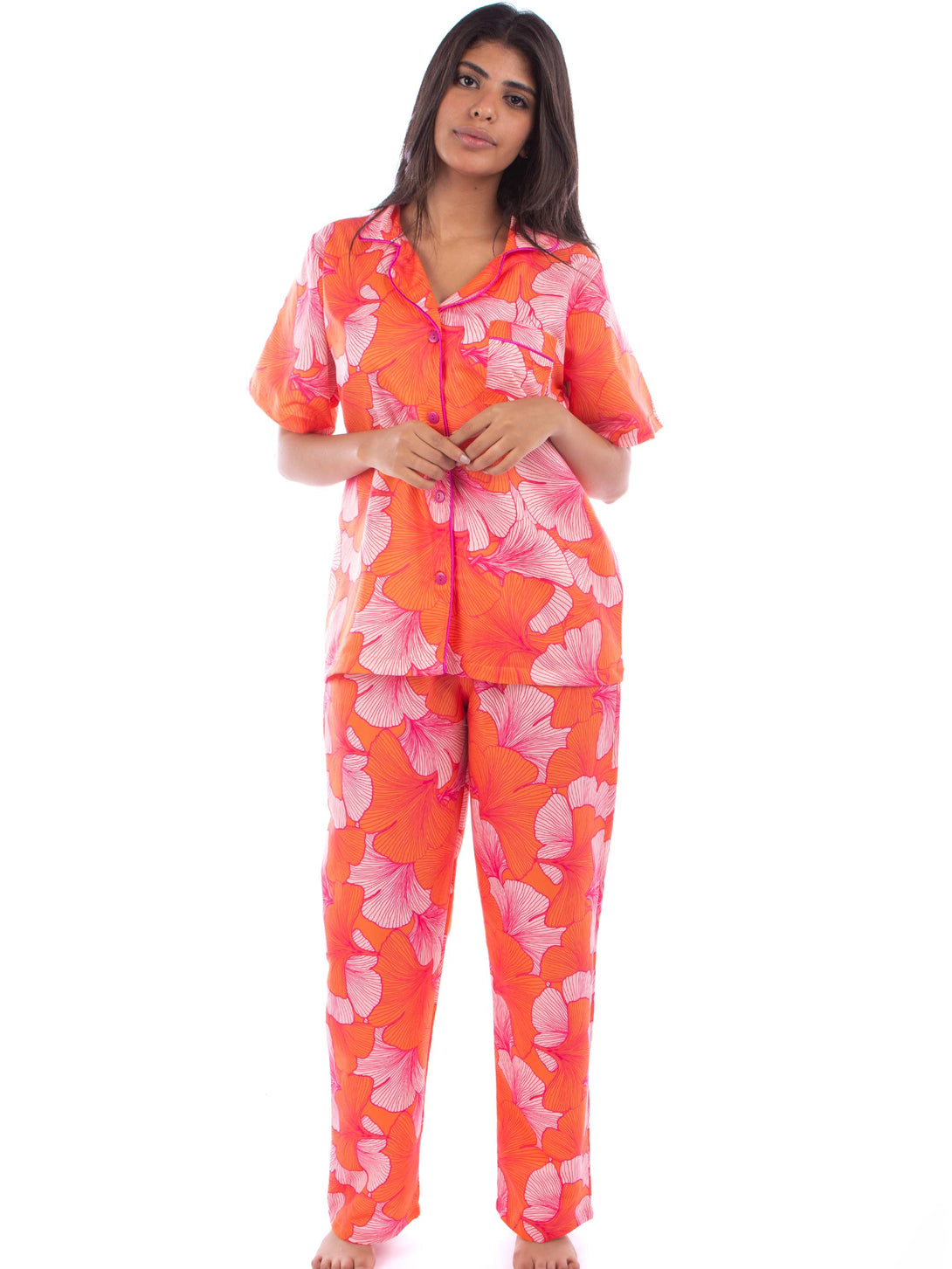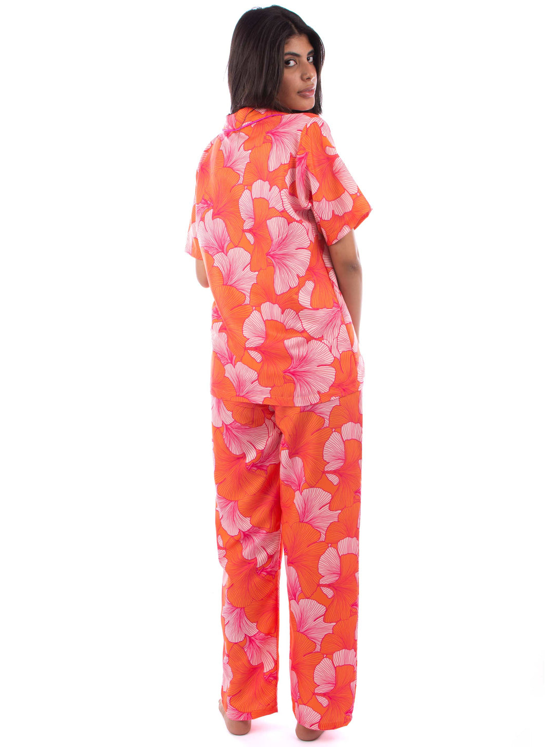 Pyjama Set, a Shirt with V-neckline and buttons down the front, chest pocket. Bottoms with an elasticated waist and straight legs.
