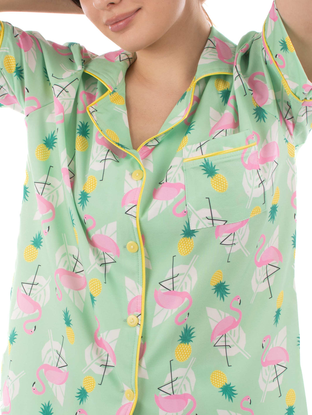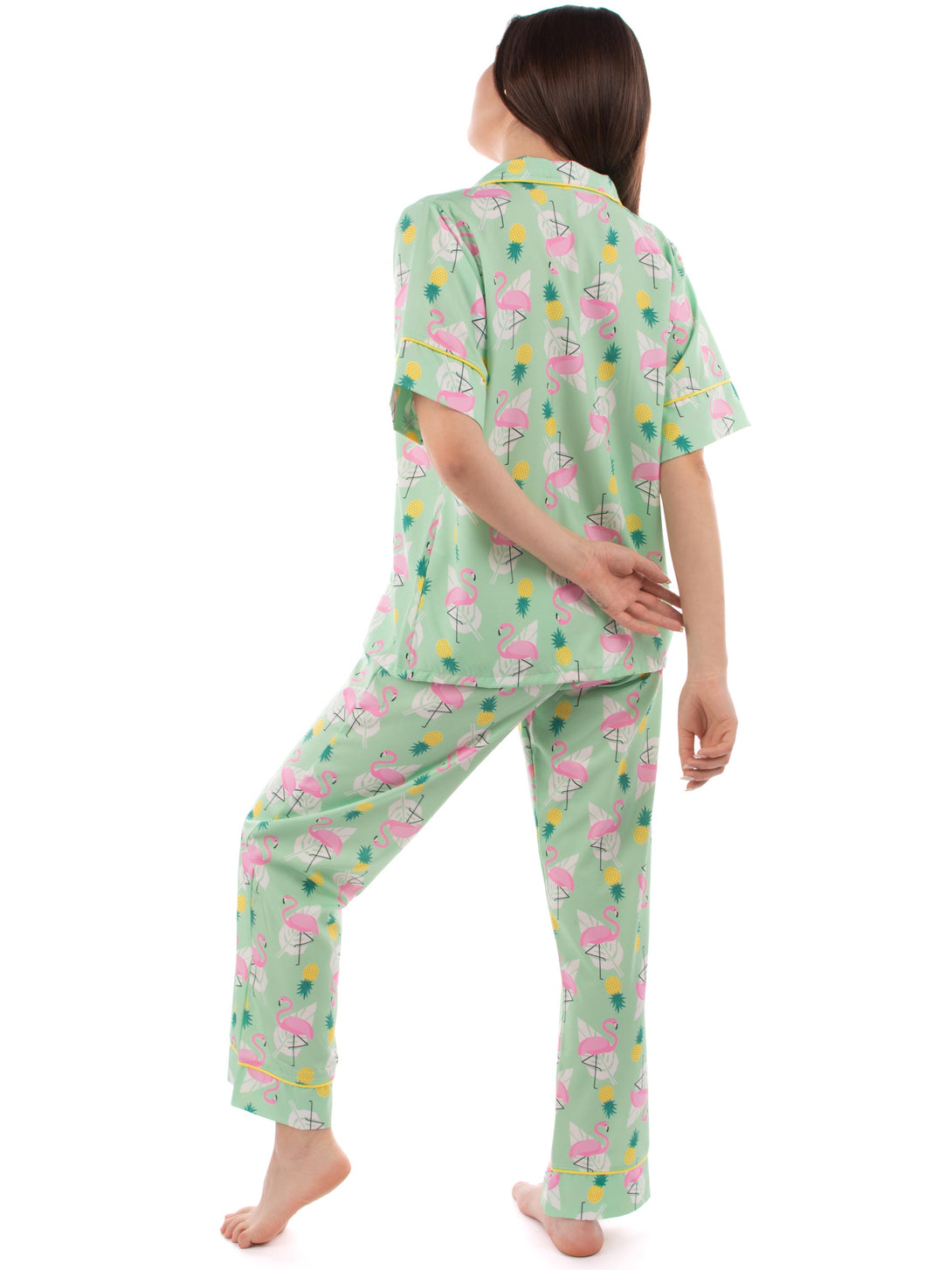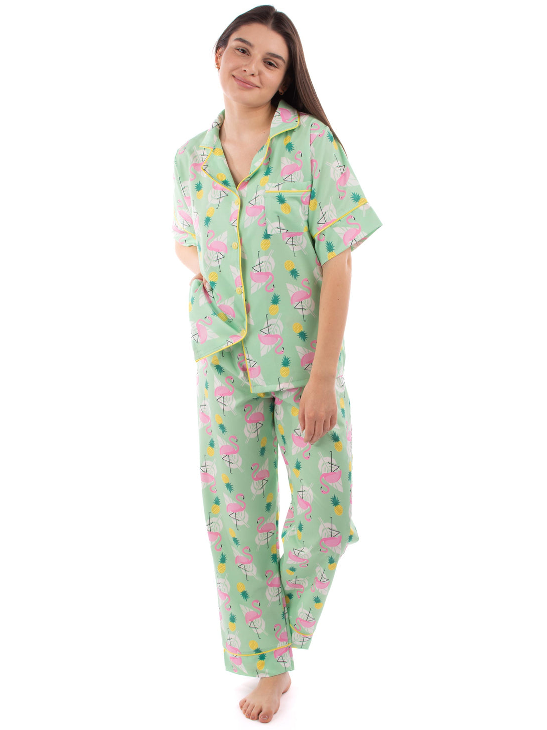 Pyjama Set, a Shirt with V-neckline and buttons down the front, chest pocket. Bottoms with an elasticated waist and straight legs.