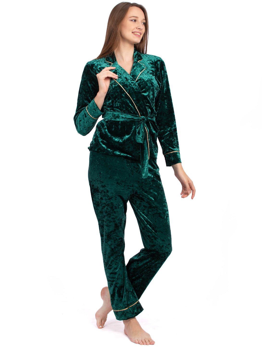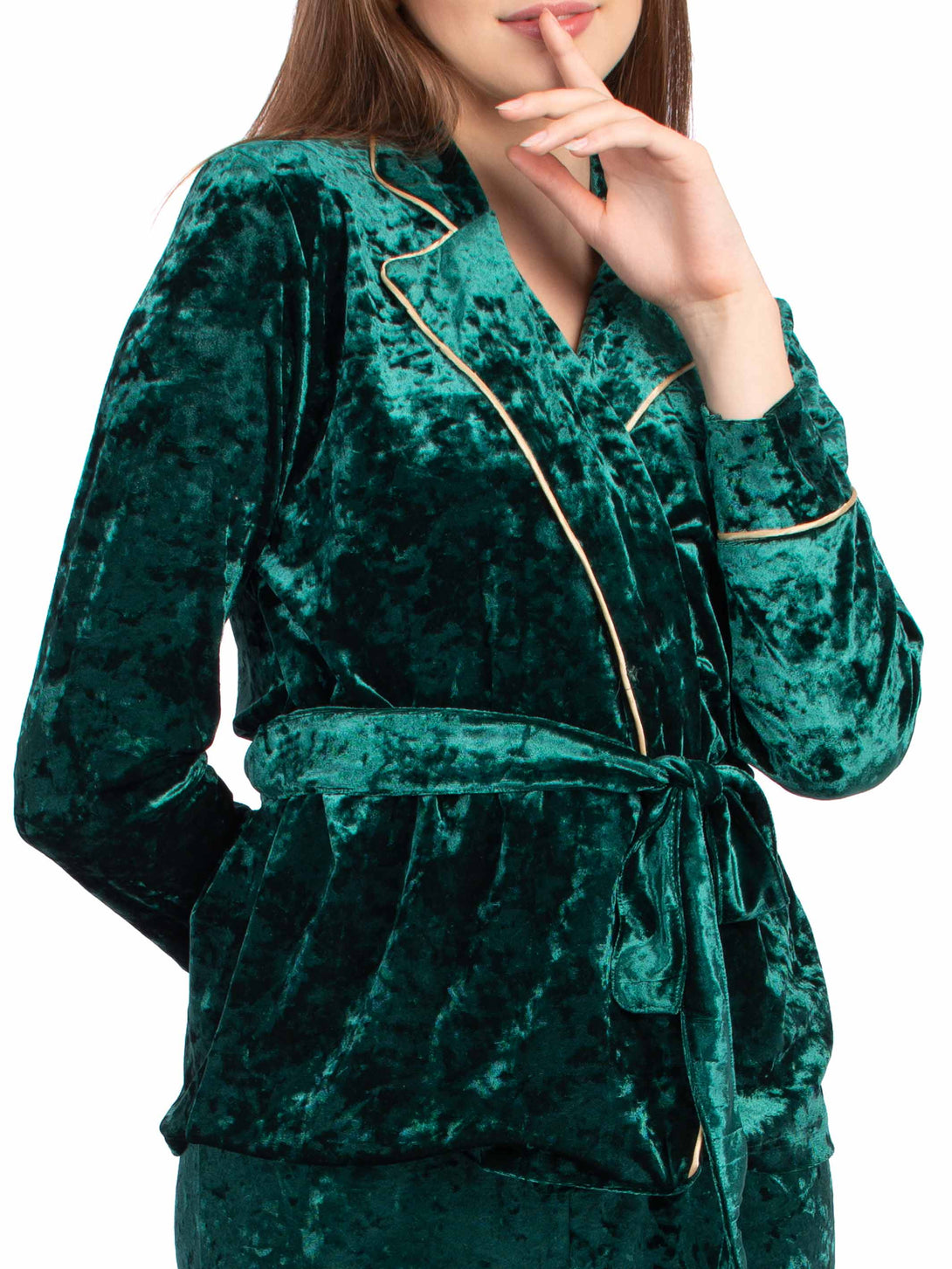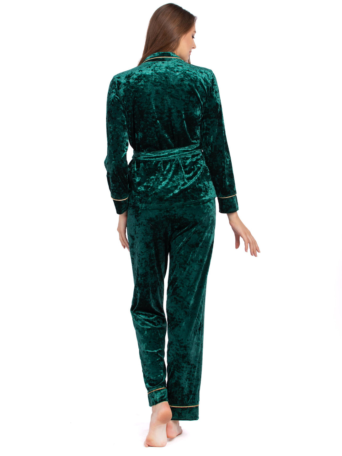 Double-breasted velvet set, Jacket and a tie belt at the waist. Bottoms with an elasticated waist and straight legs.