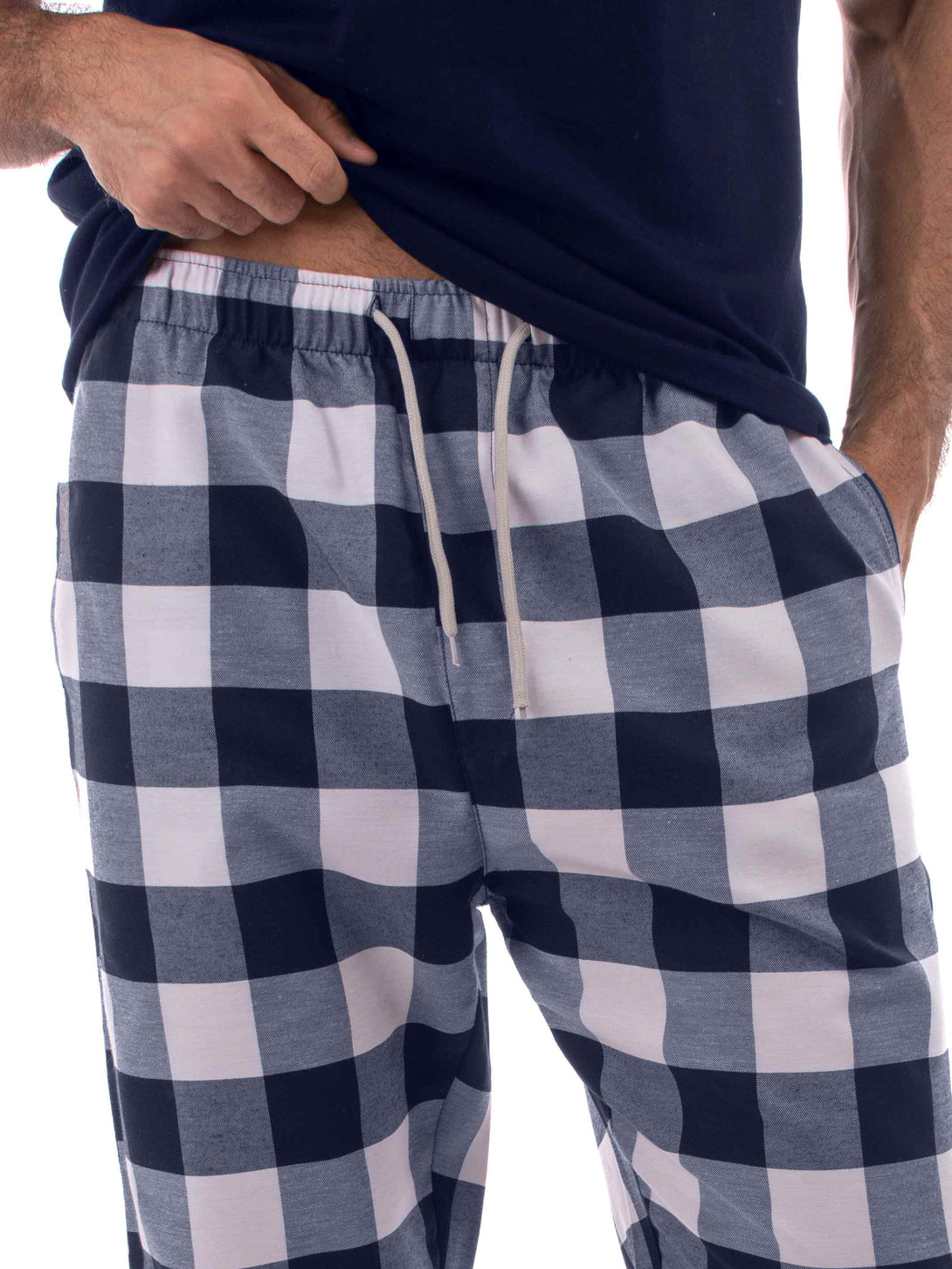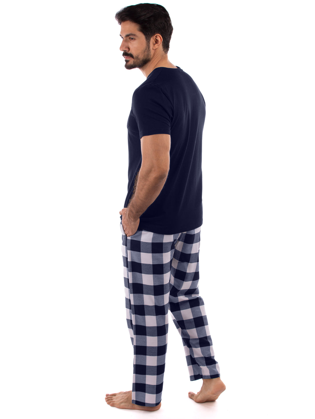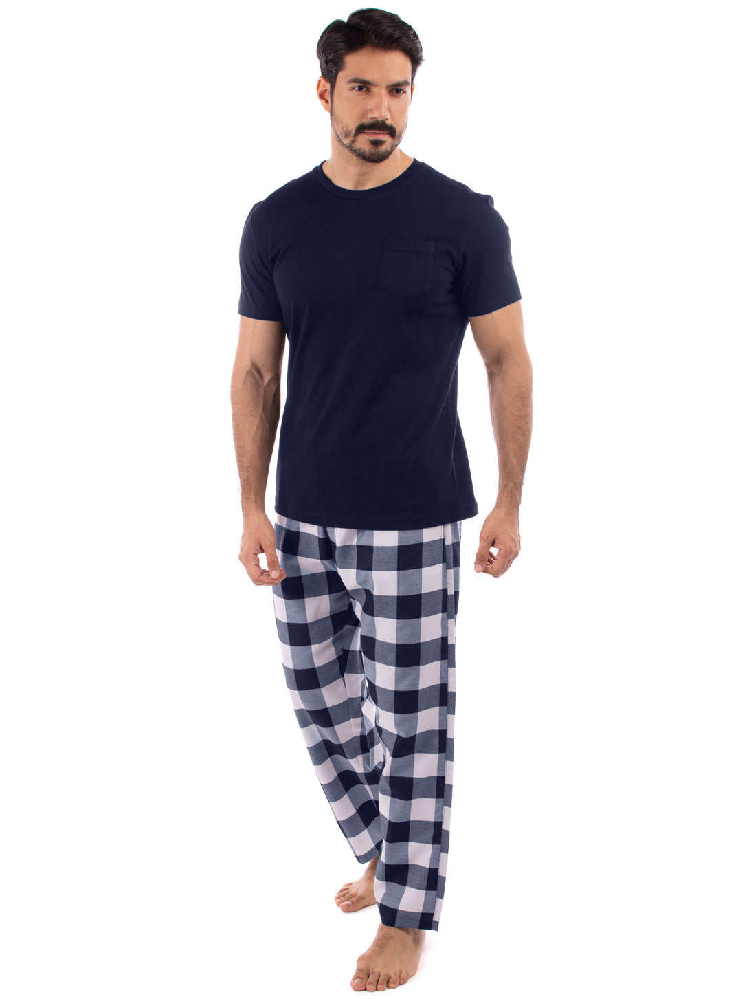 Pyjama set, a round neckline T-shirt with chest pocket. Checkered comfortable straight cut pants, elastic at the waist with two side pockets