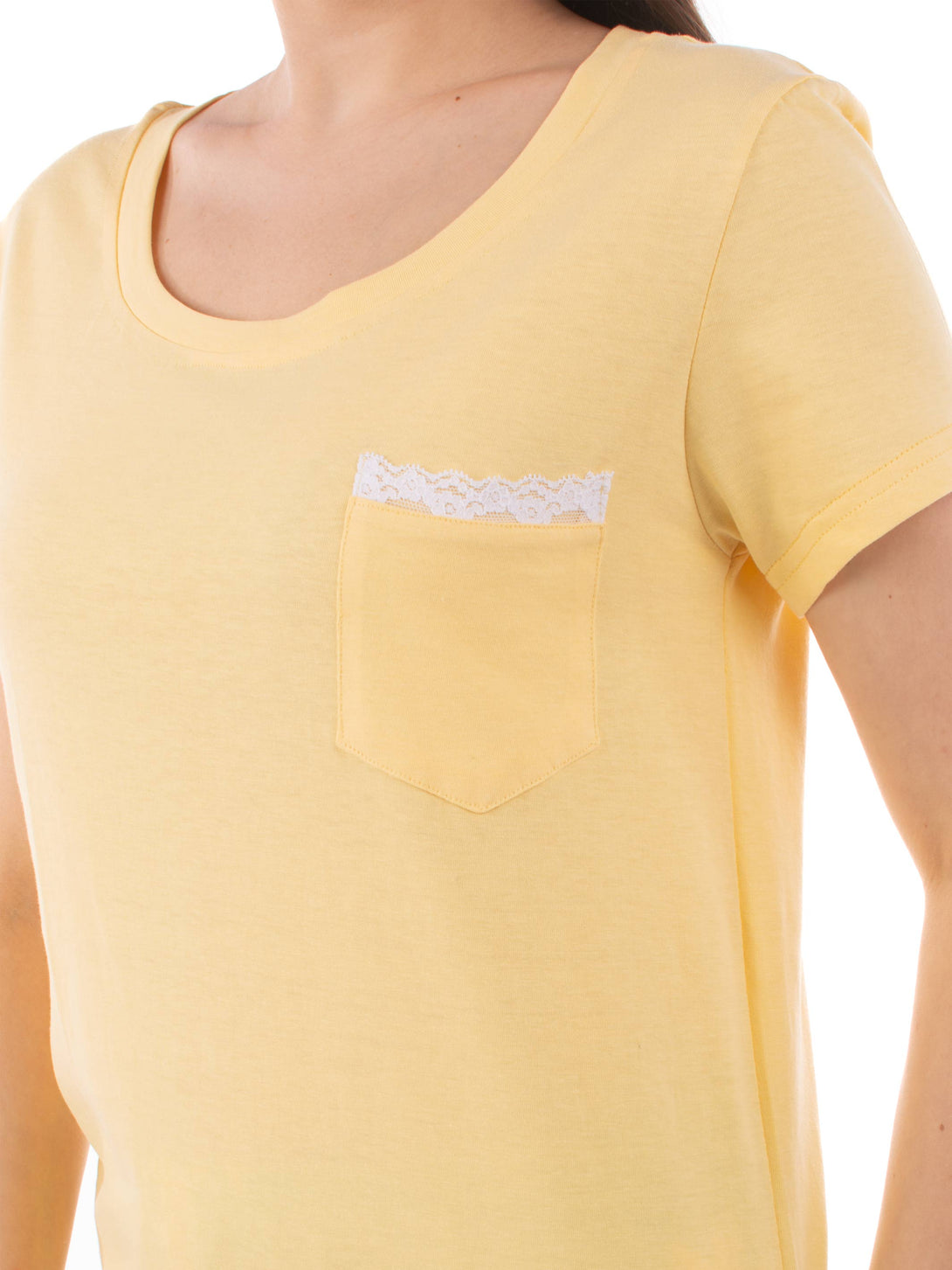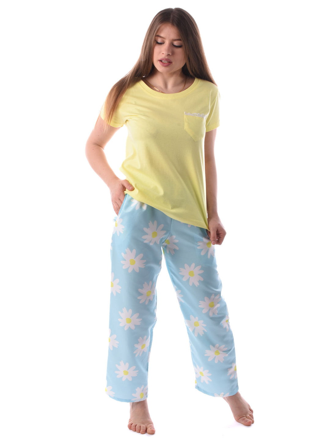 Pyjama set, T-shirt with a round neckline, chest pocket with small embroidered lace detail and short sleeves. Pants printed Daisy flowers elastic at the waist with two side pockets and straight cut legs.