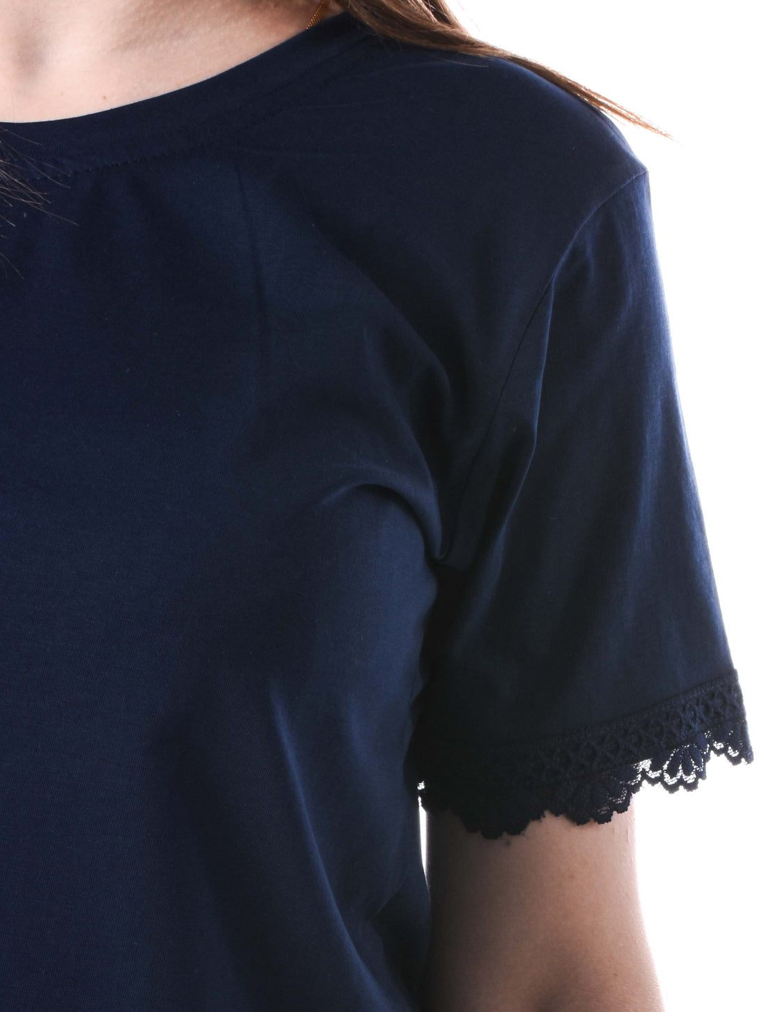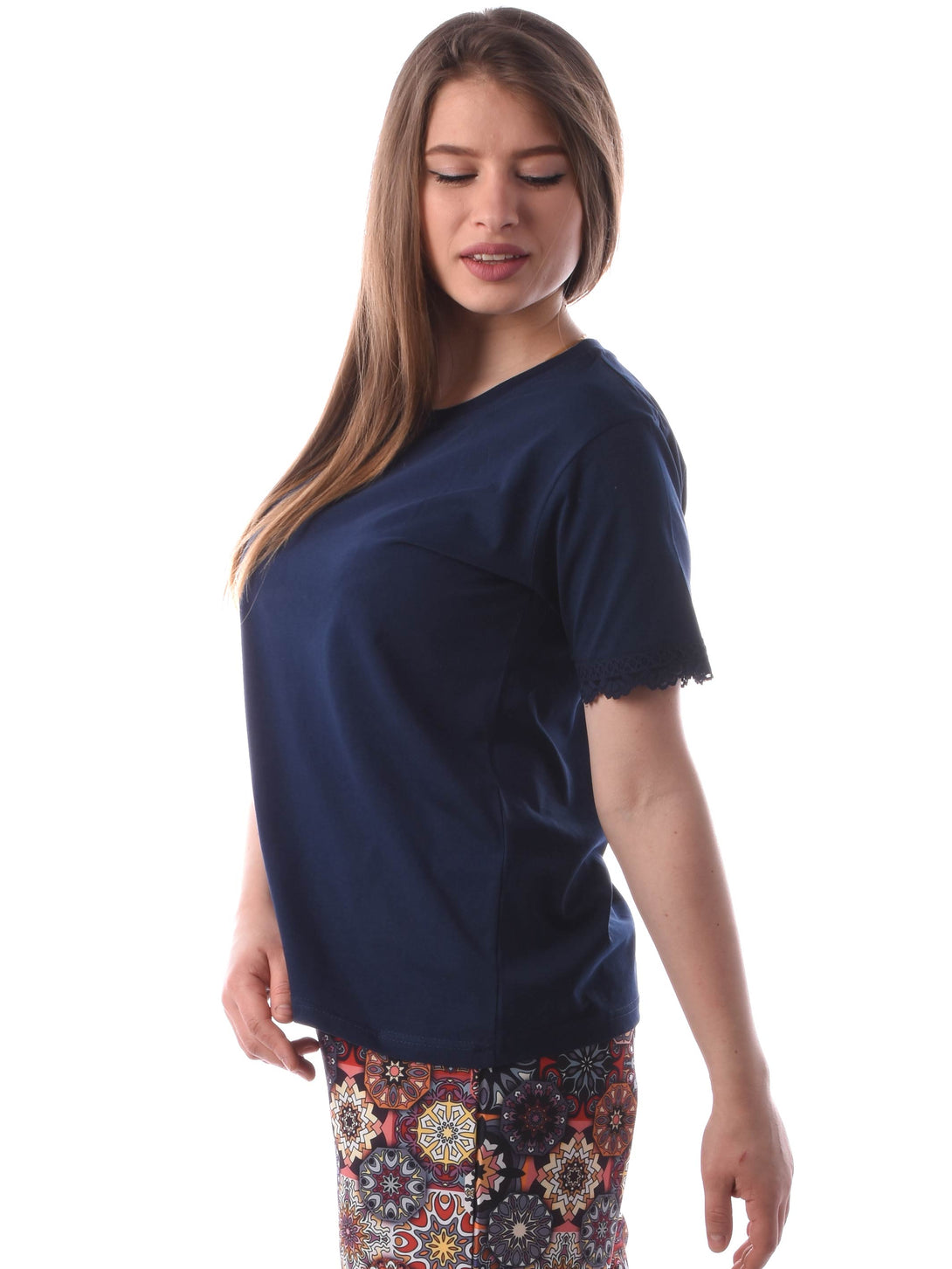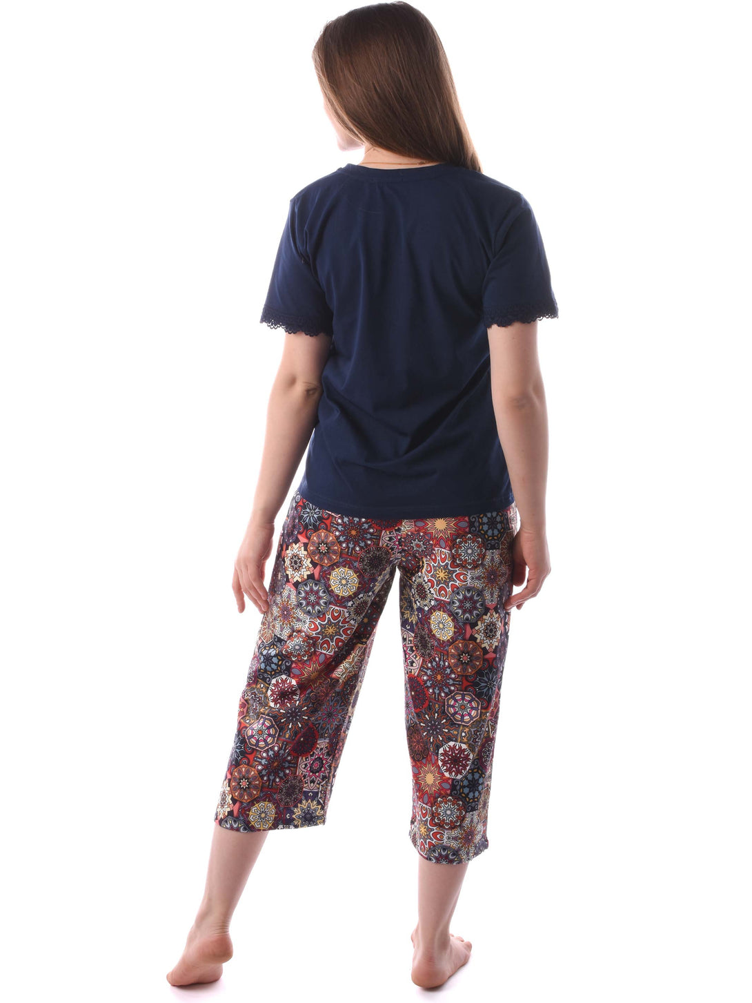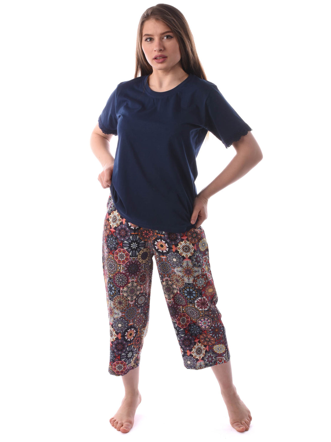 Pyjama set, Cotton T-shirt with a round neckline, embroidered lace detail on tip of the sleeves. Bermuda printed Retro pattern, elastic at the waist and wide cut legs.