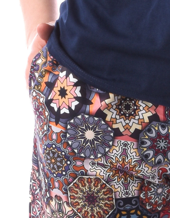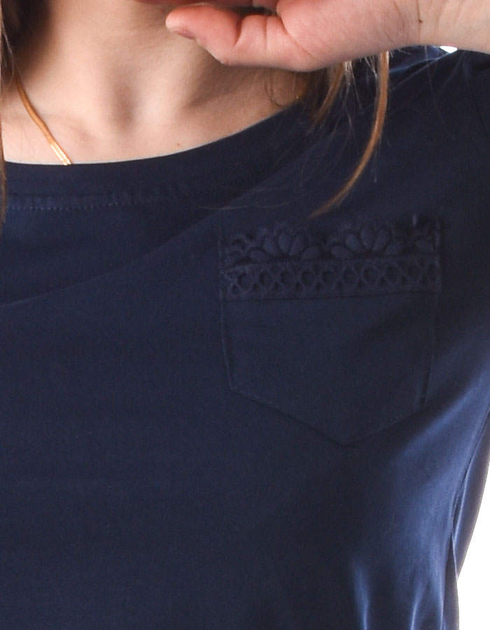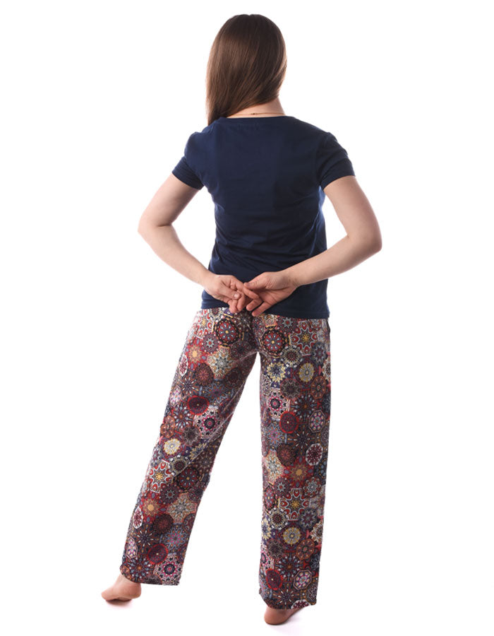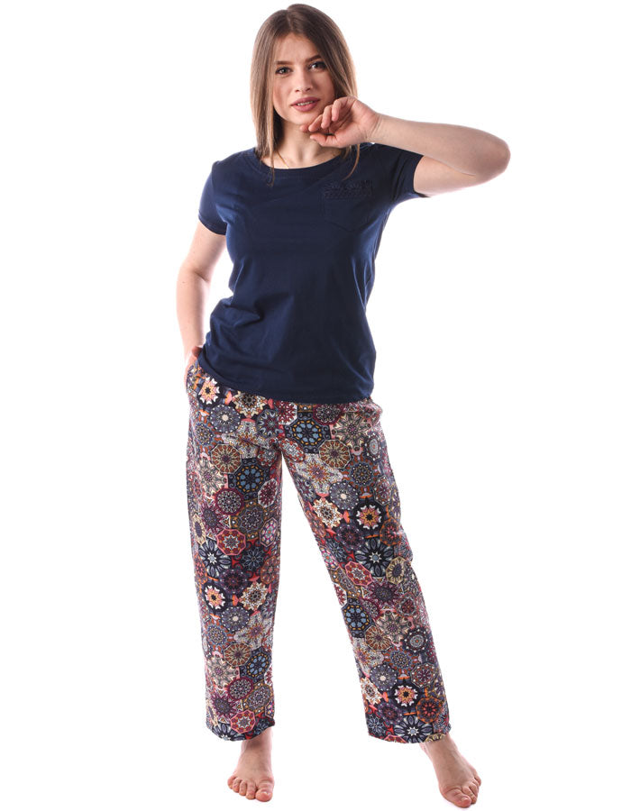 Pyjama set, T-shirt with a round neckline, chest pocket with small embroidered lace detail and short sleeves. Pants with Retro pattern, elastic at the waist with two side pockets and straight cut legs.
