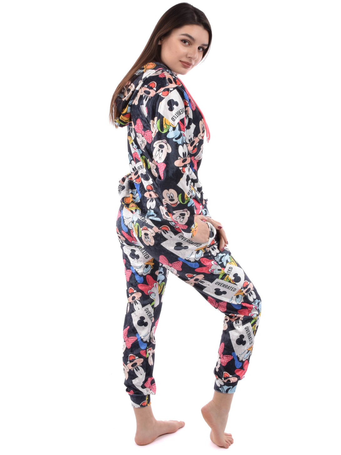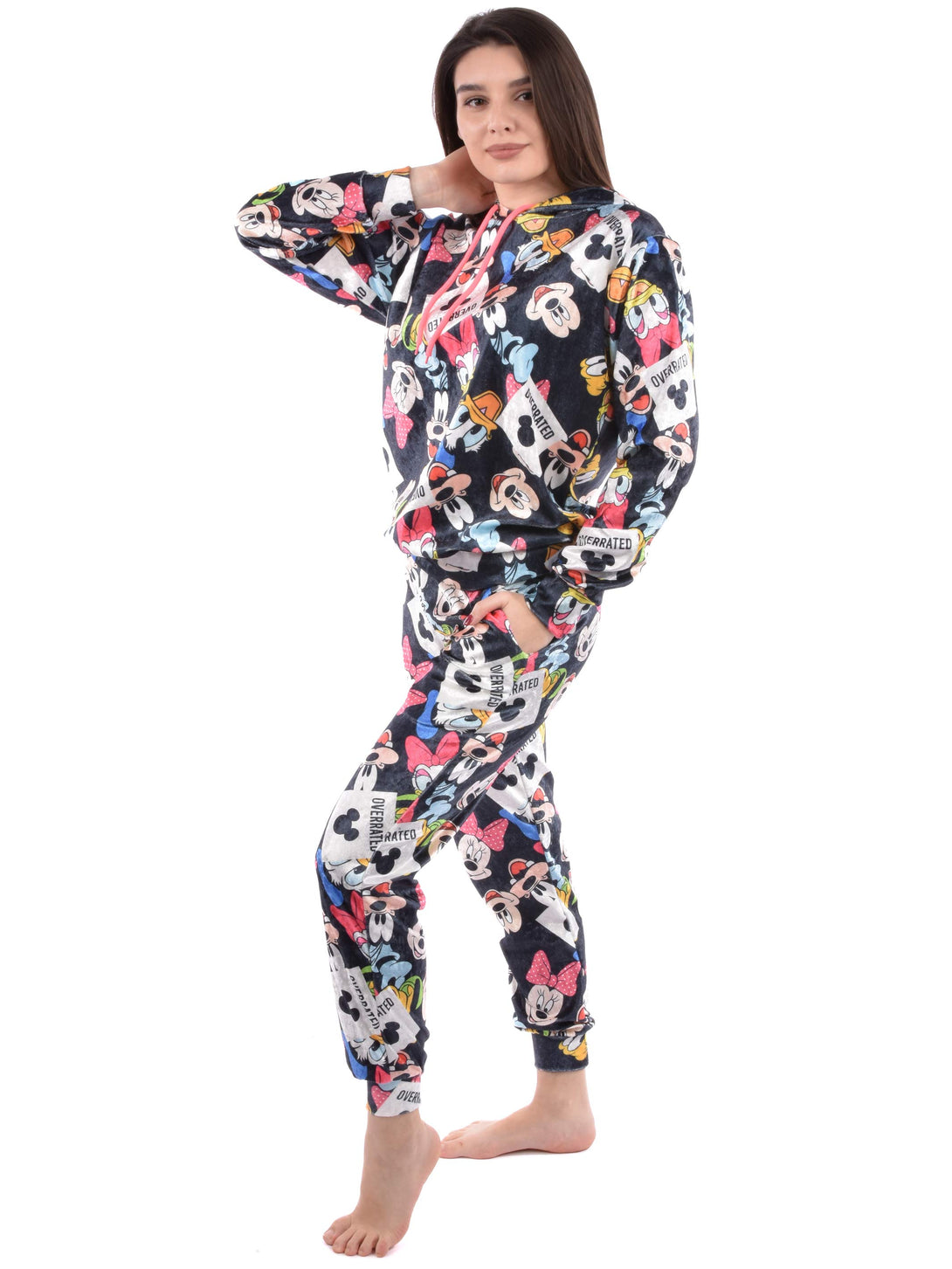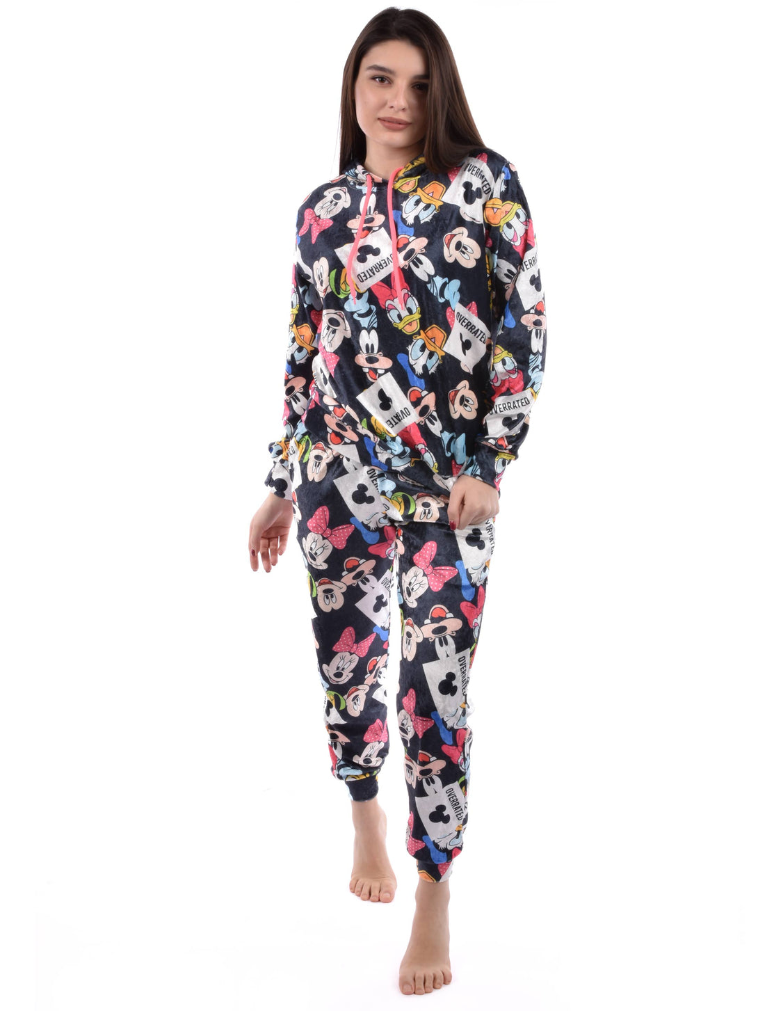 Set in Velvet with all over Disney patterns , Hoodie with a Pink tie, long sleeves, and cuffs around the edges . Joggers with two side pockets, and edging cuffs .