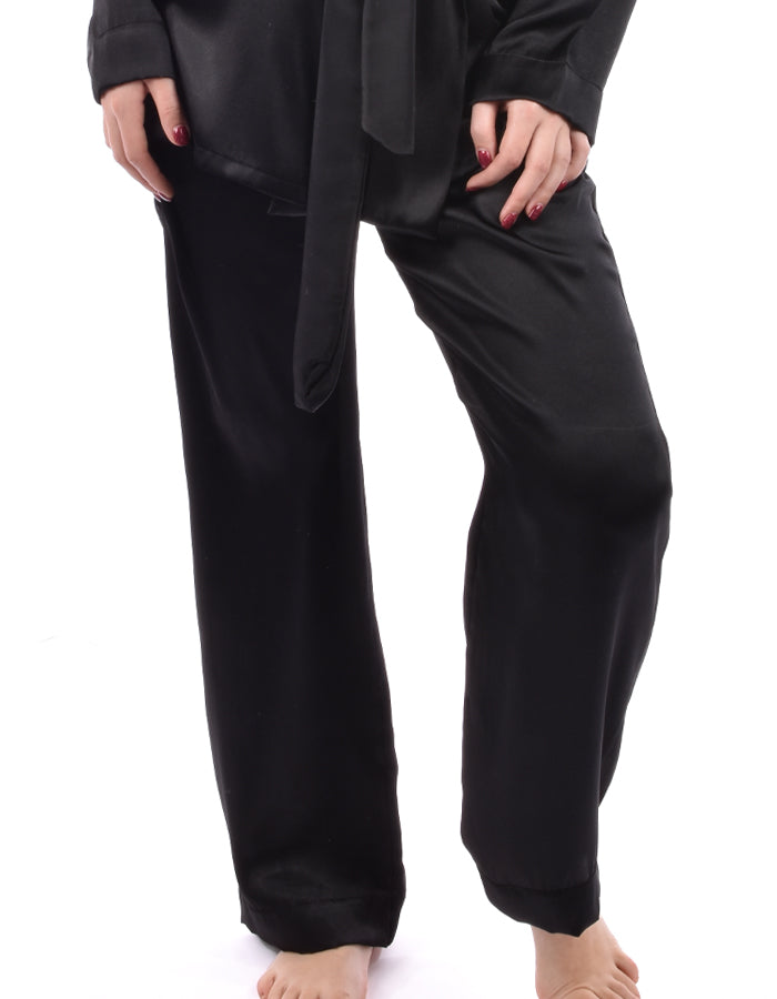 Double-breasted Satin set, Jacket and a tie belt at the waist. Bottoms with an elasticated waist and straight legs.