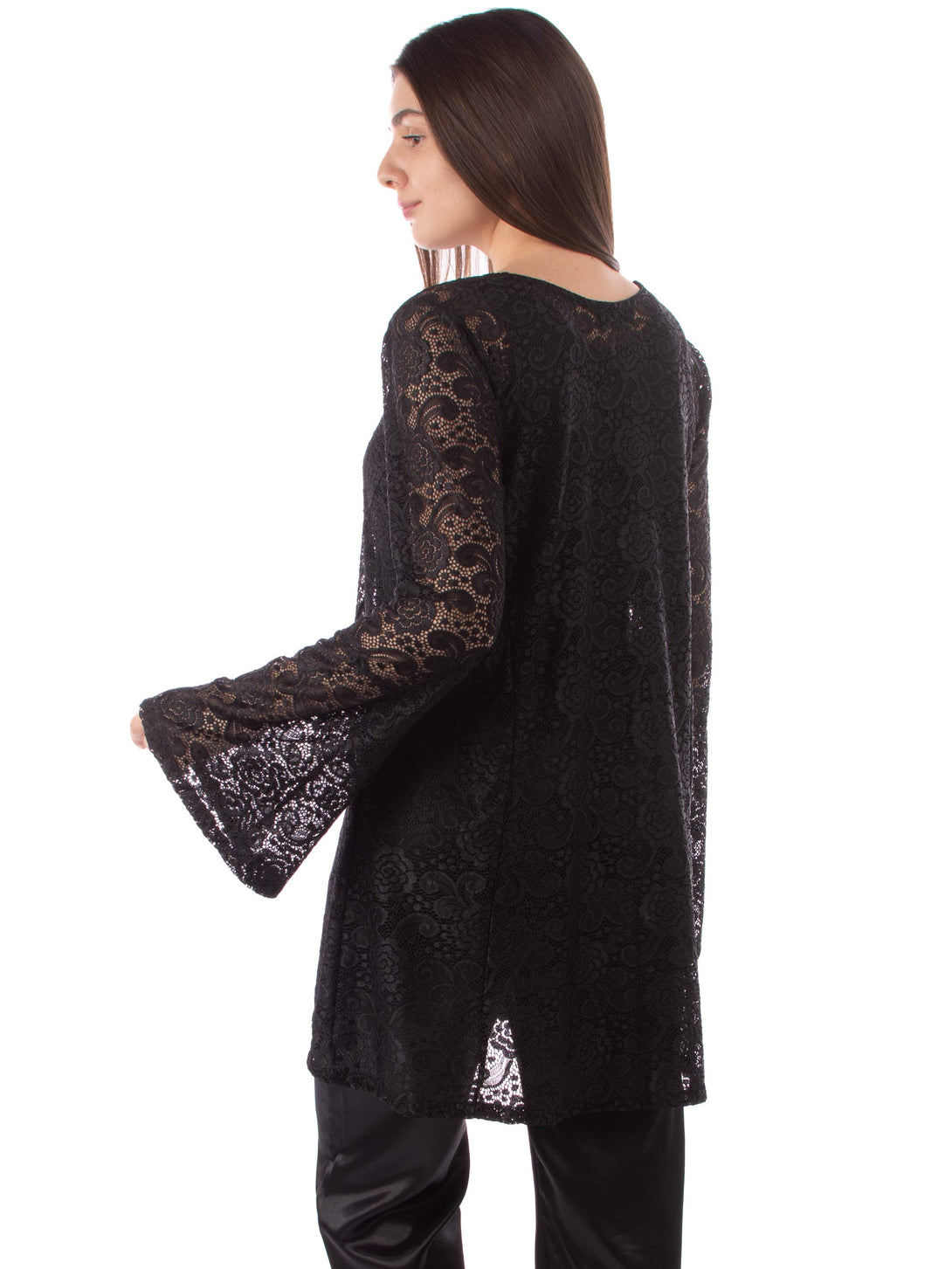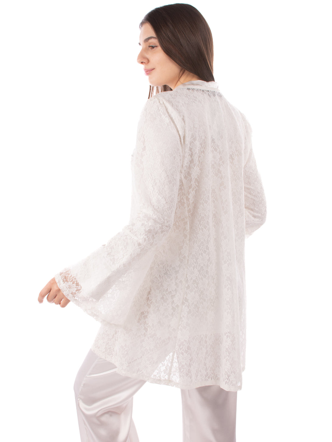 Short floral lace robe with a satin belt, long sleeves with lace-trimmed sleeves and hem.