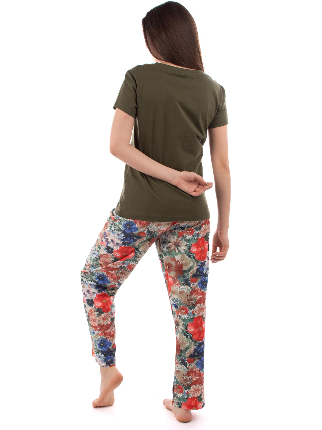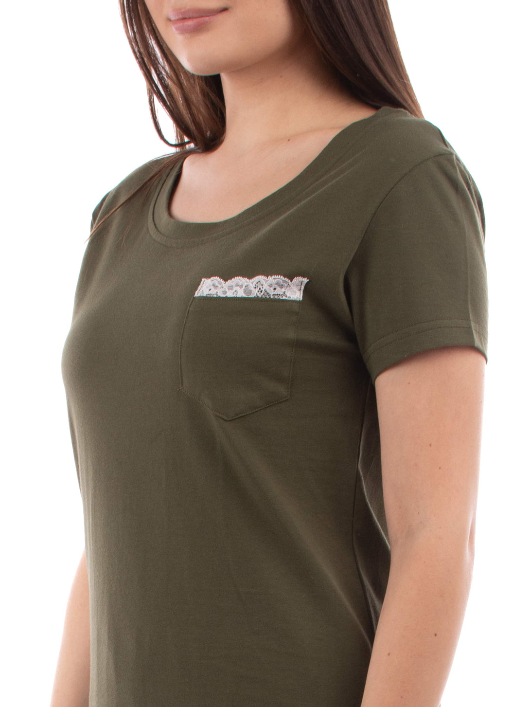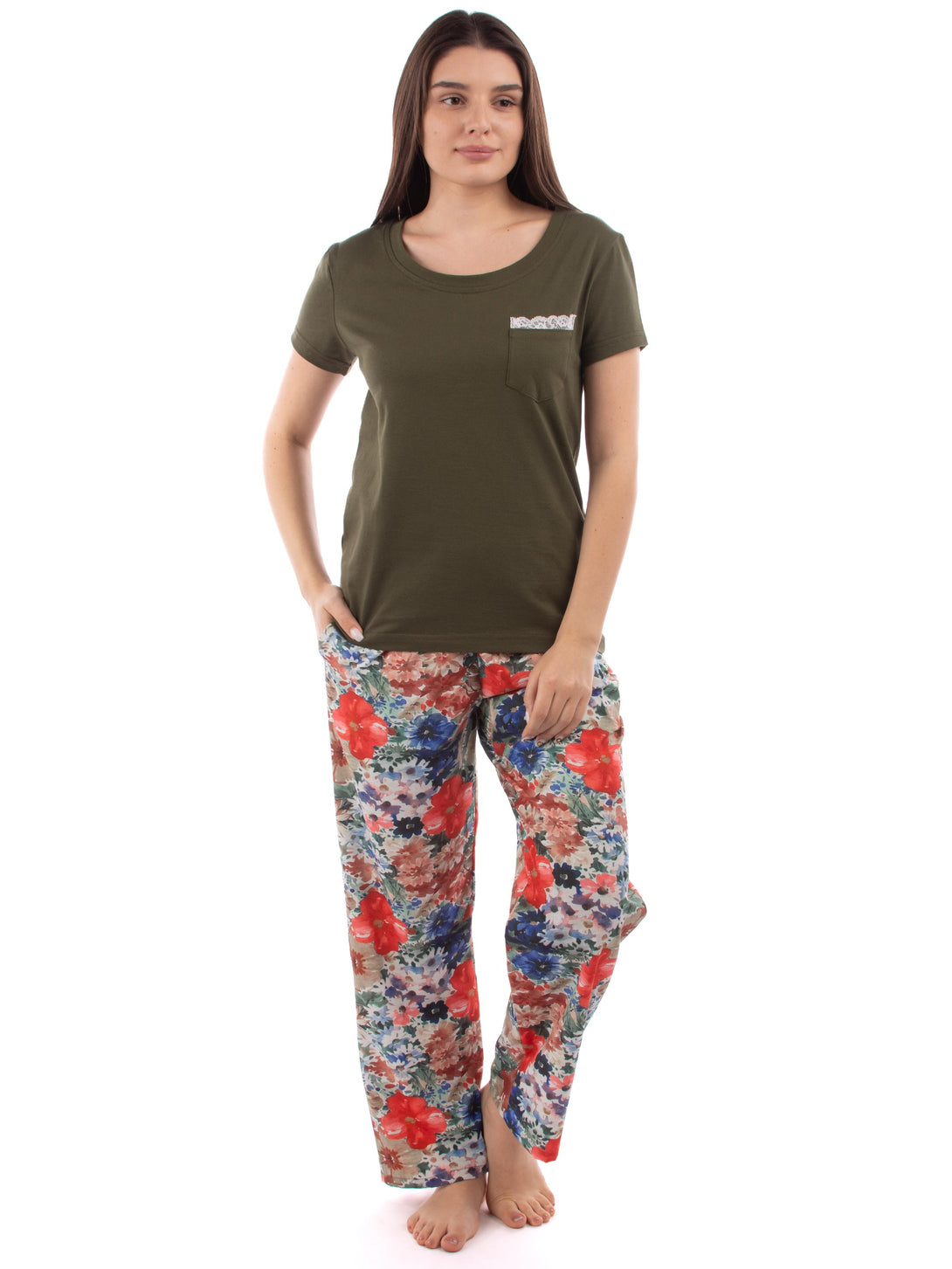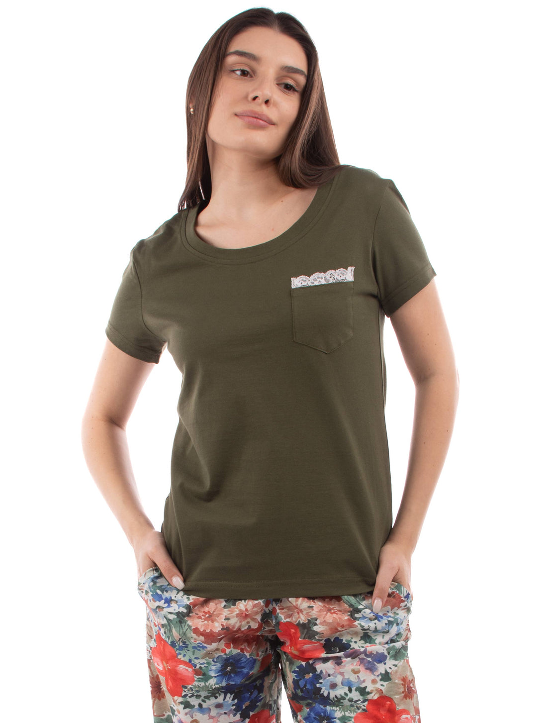 Pyjama set . Cotton T-shirt with a round neckline, chest pocket with lace and short sleeves. Soft trousers with covered elasticated at the waist and straight wide legs.