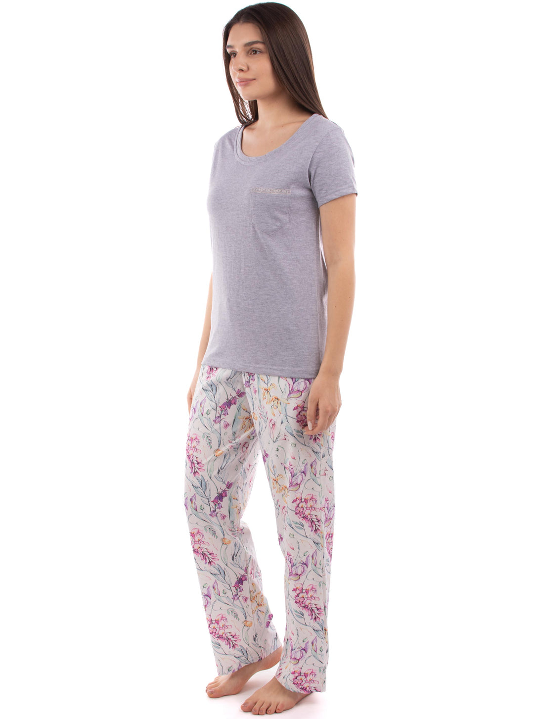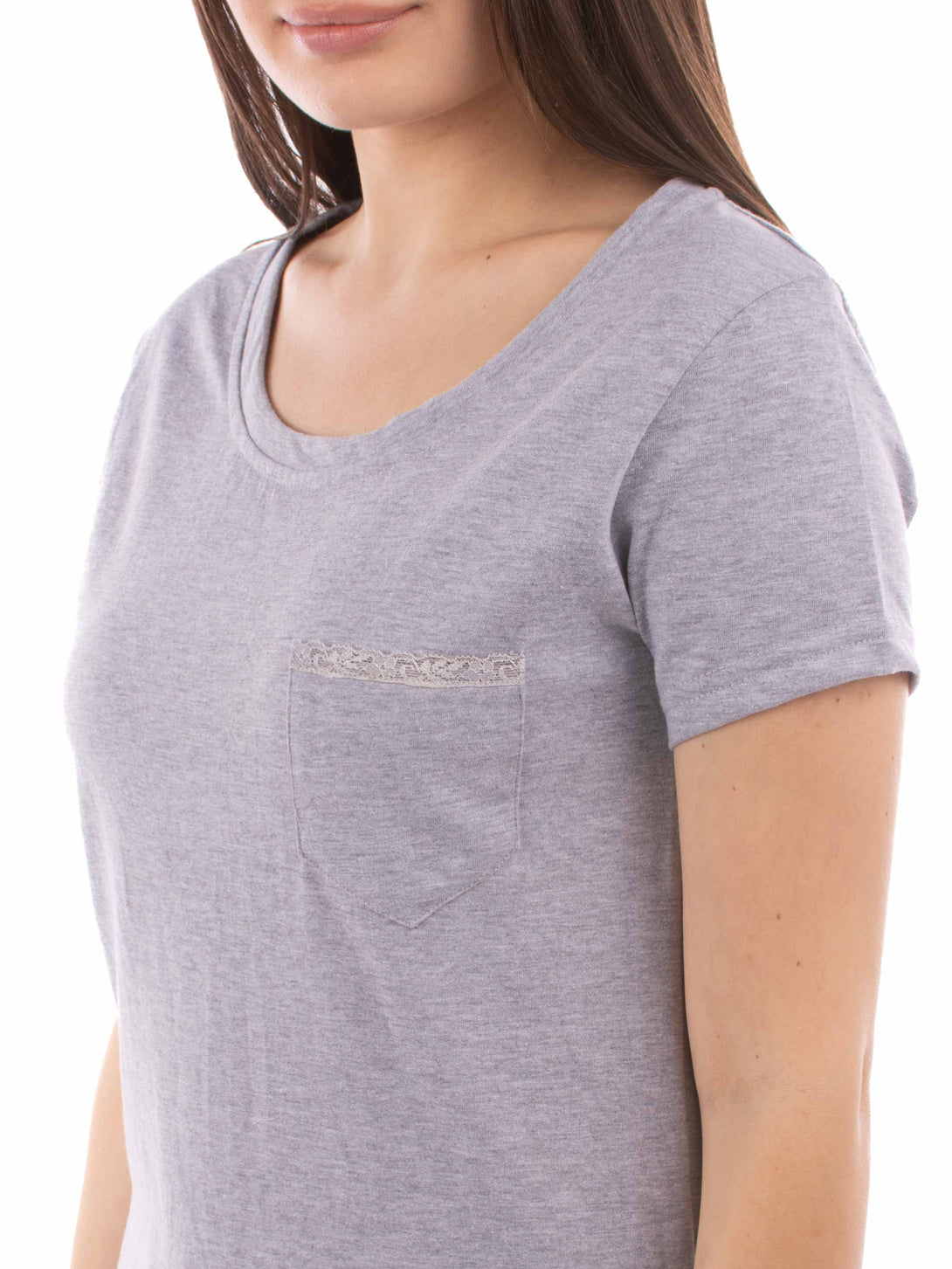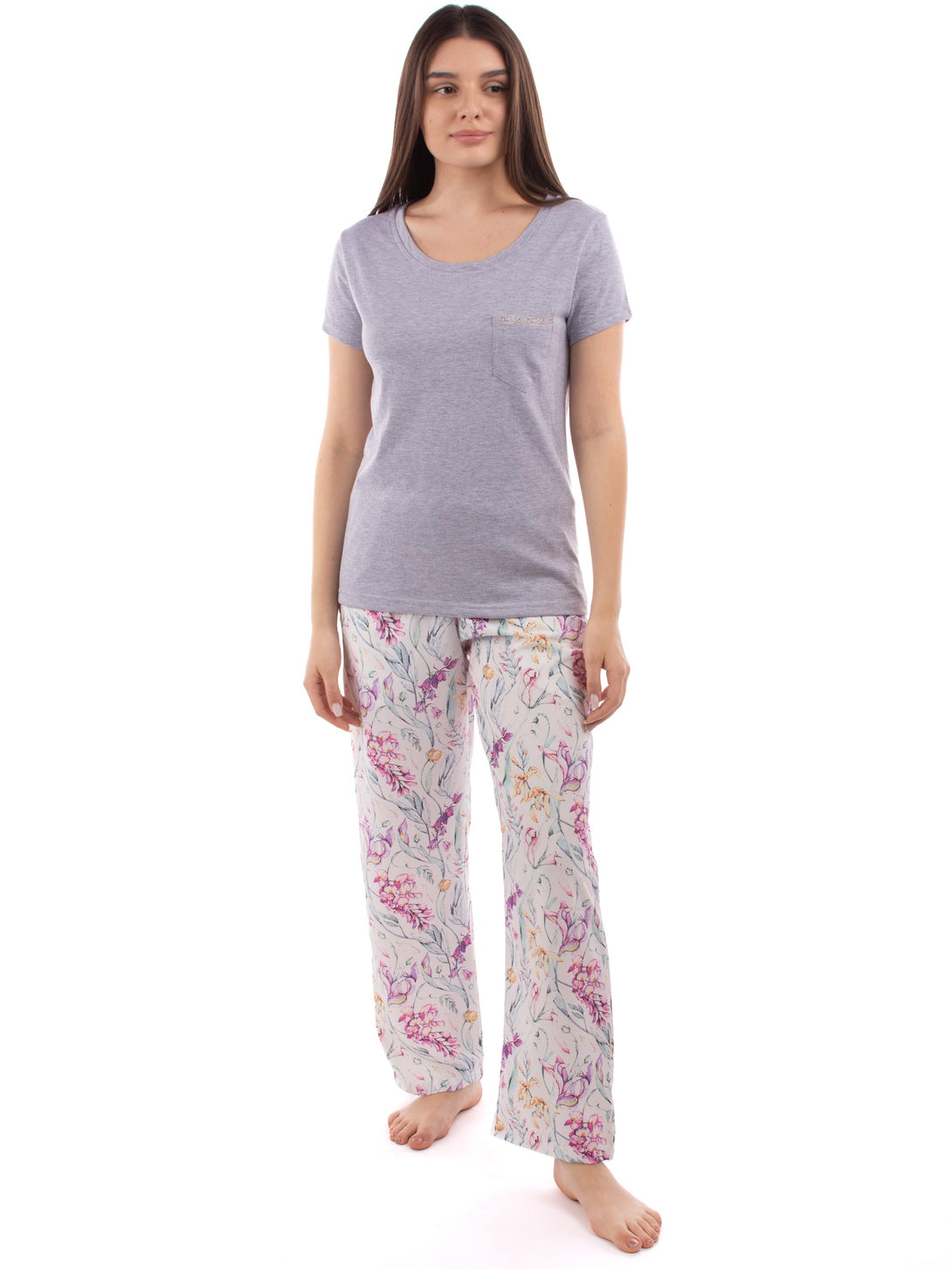 Pyjama with a T-shirt top and bottoms. T-shirt with a round neckline, chest pocket with lace and short sleeves. Soft trousers with covered elasticated at the waist and straight wide legs.