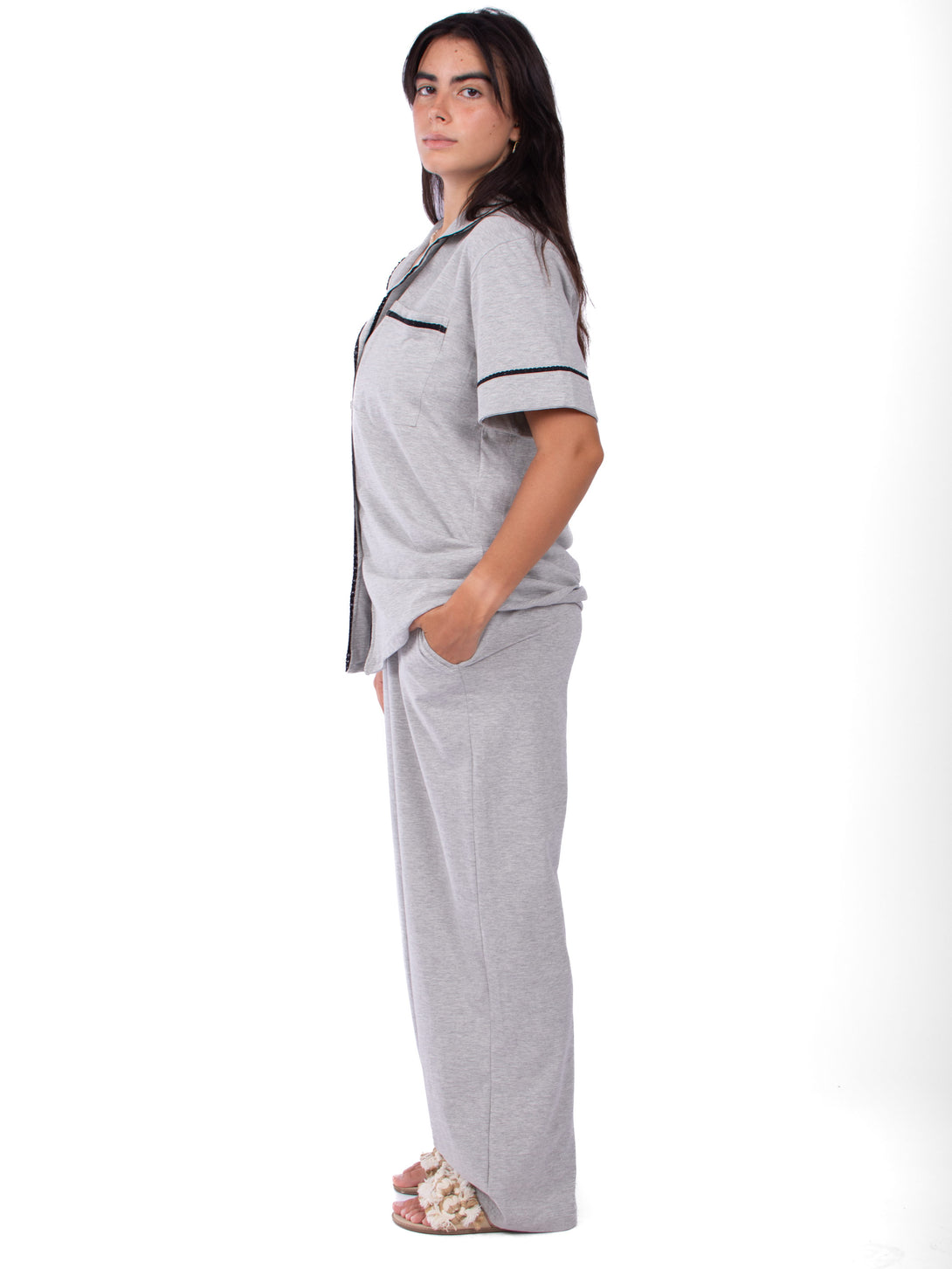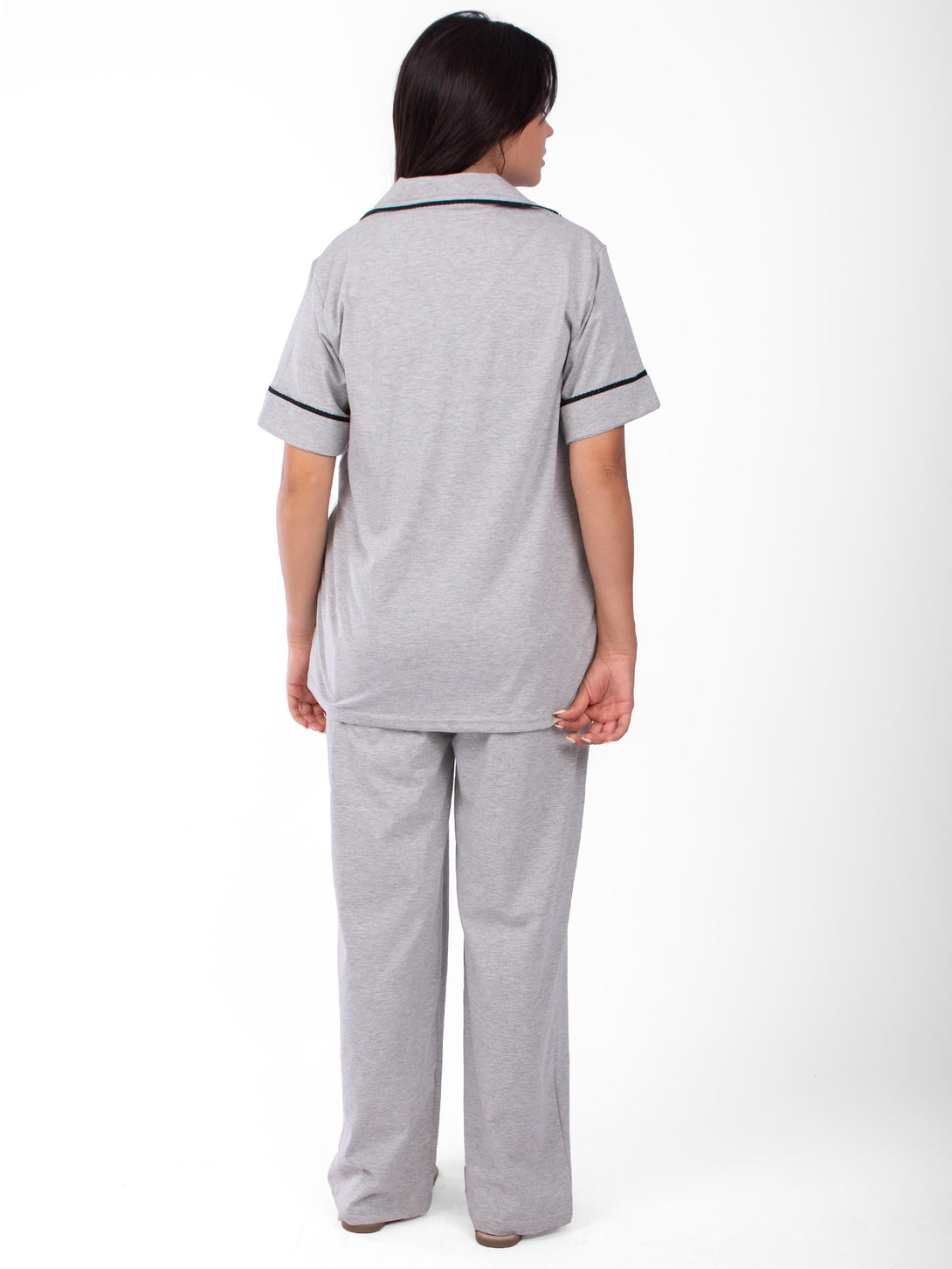 Pyjama Set, a Shirt with V-neckline and buttons down the front, chest pocket. Bottoms with an elasticated waist and straight legs.