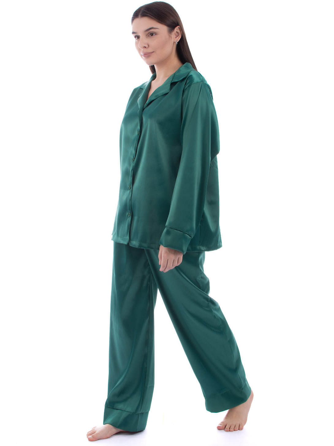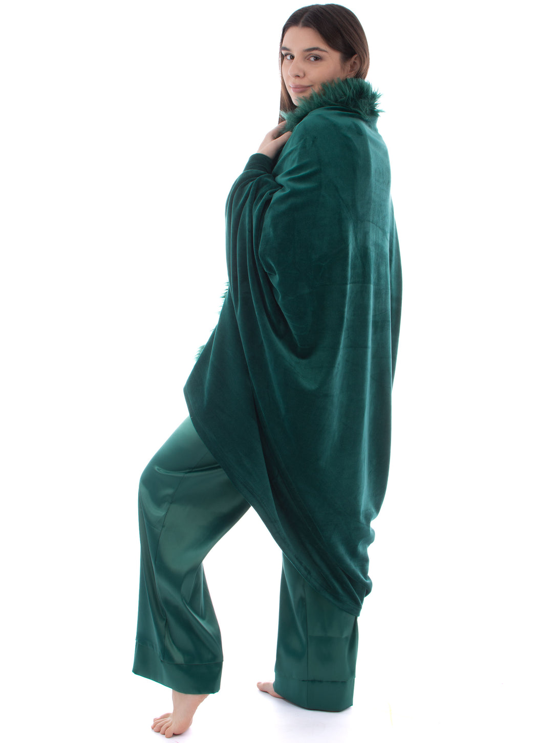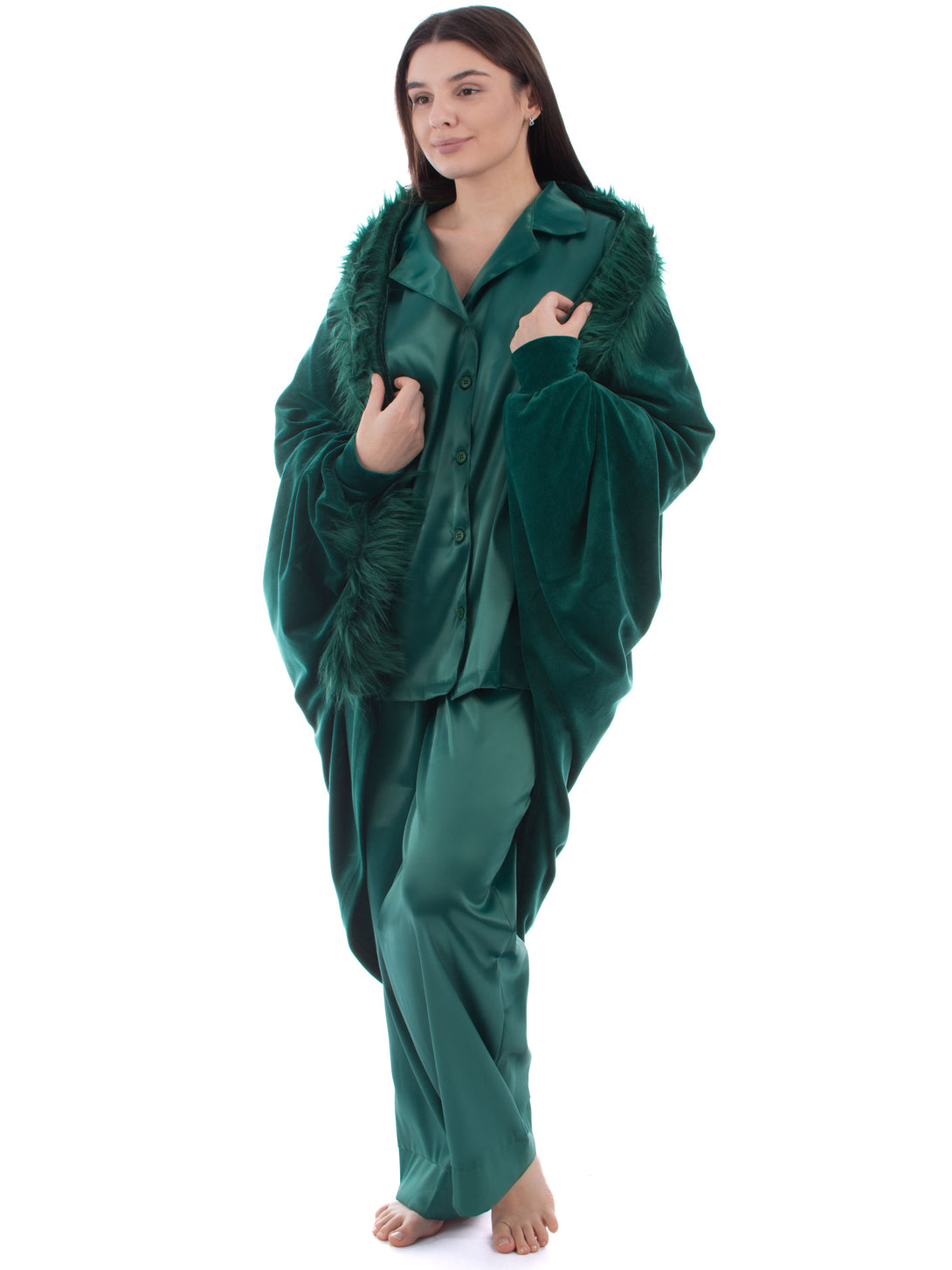 Satin Pyjama Set, a Shirt with V-neckline and buttons down the front, Bottoms with an elasticated waist and straight legs with a unique classy Velvet Cape/coat bat sleeves.