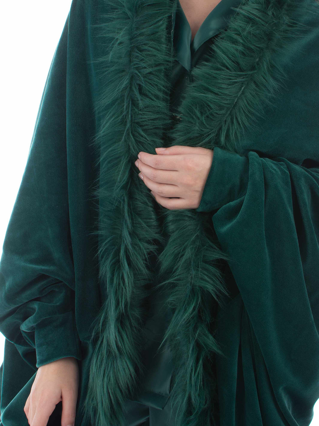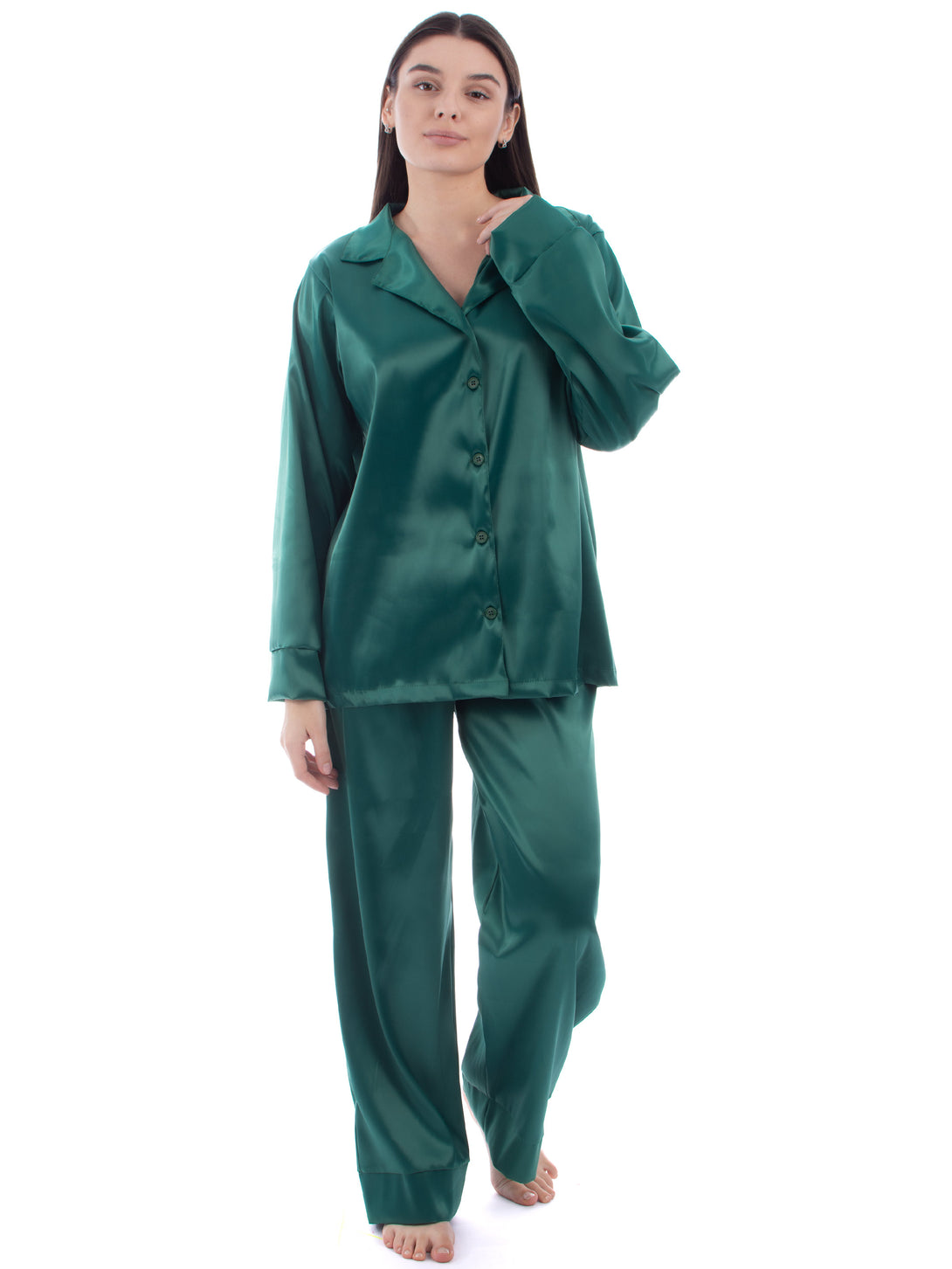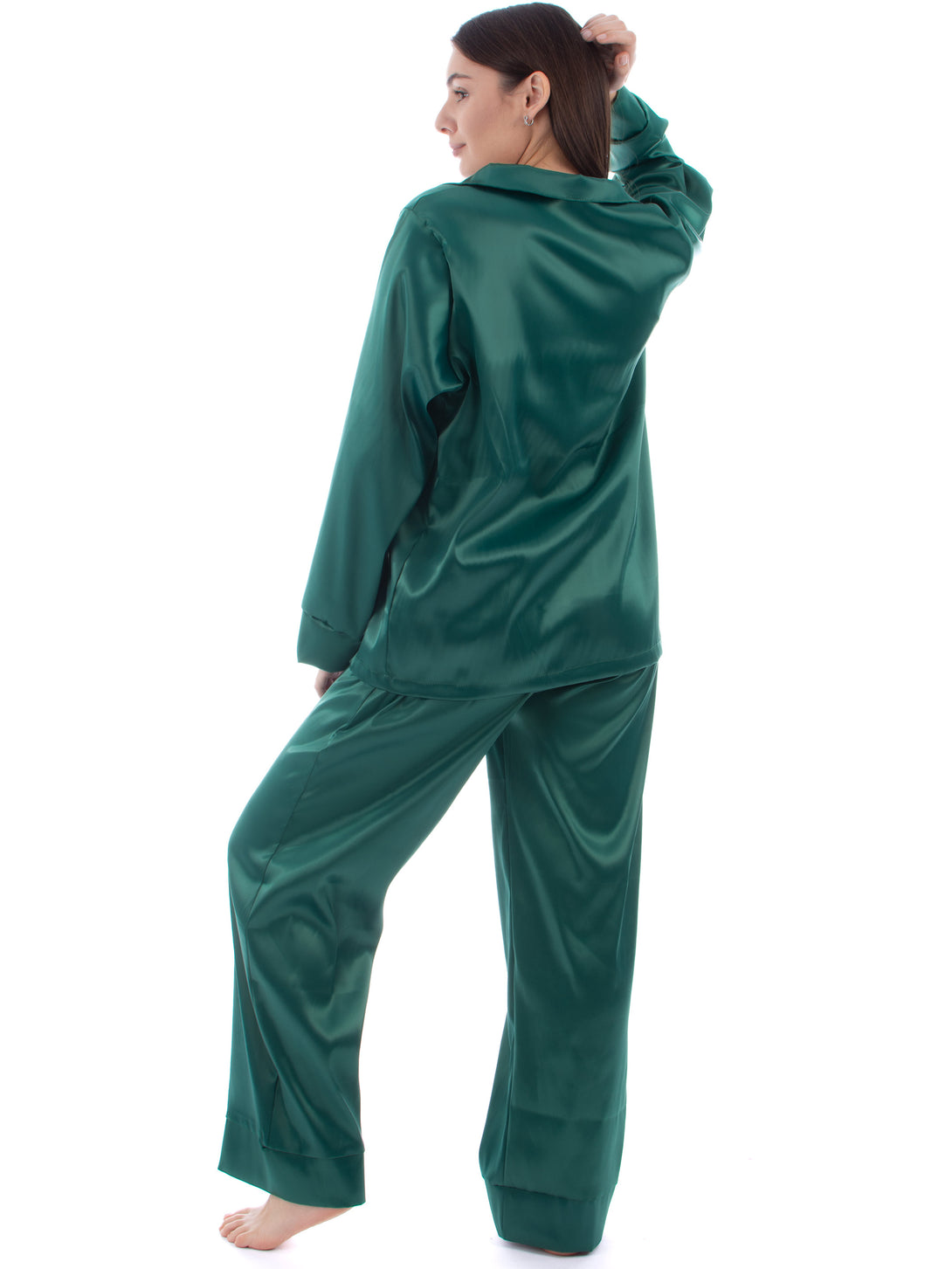 Satin Pyjama Set, a Shirt with V-neckline and buttons down the front, Bottoms with an elasticated waist and straight legs with a unique classy Velvet Cape/coat bat sleeves.