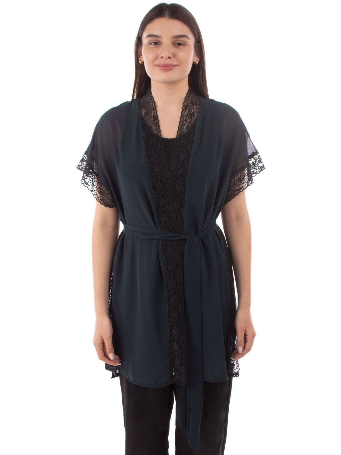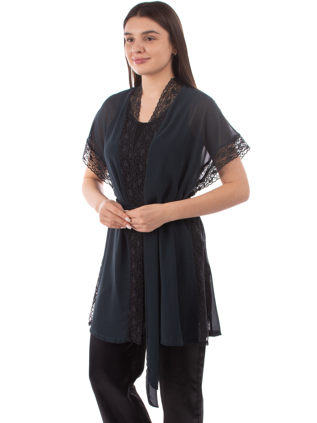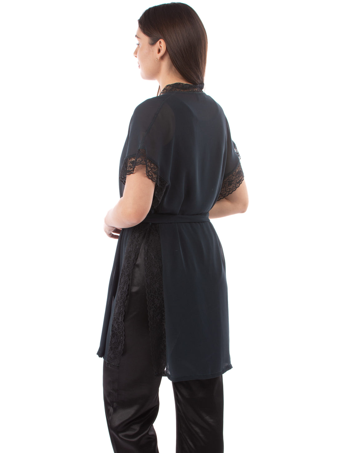 Short kimono Robe , Transparent Chiffon with Belt , and Lace on edges with big slit on both sides