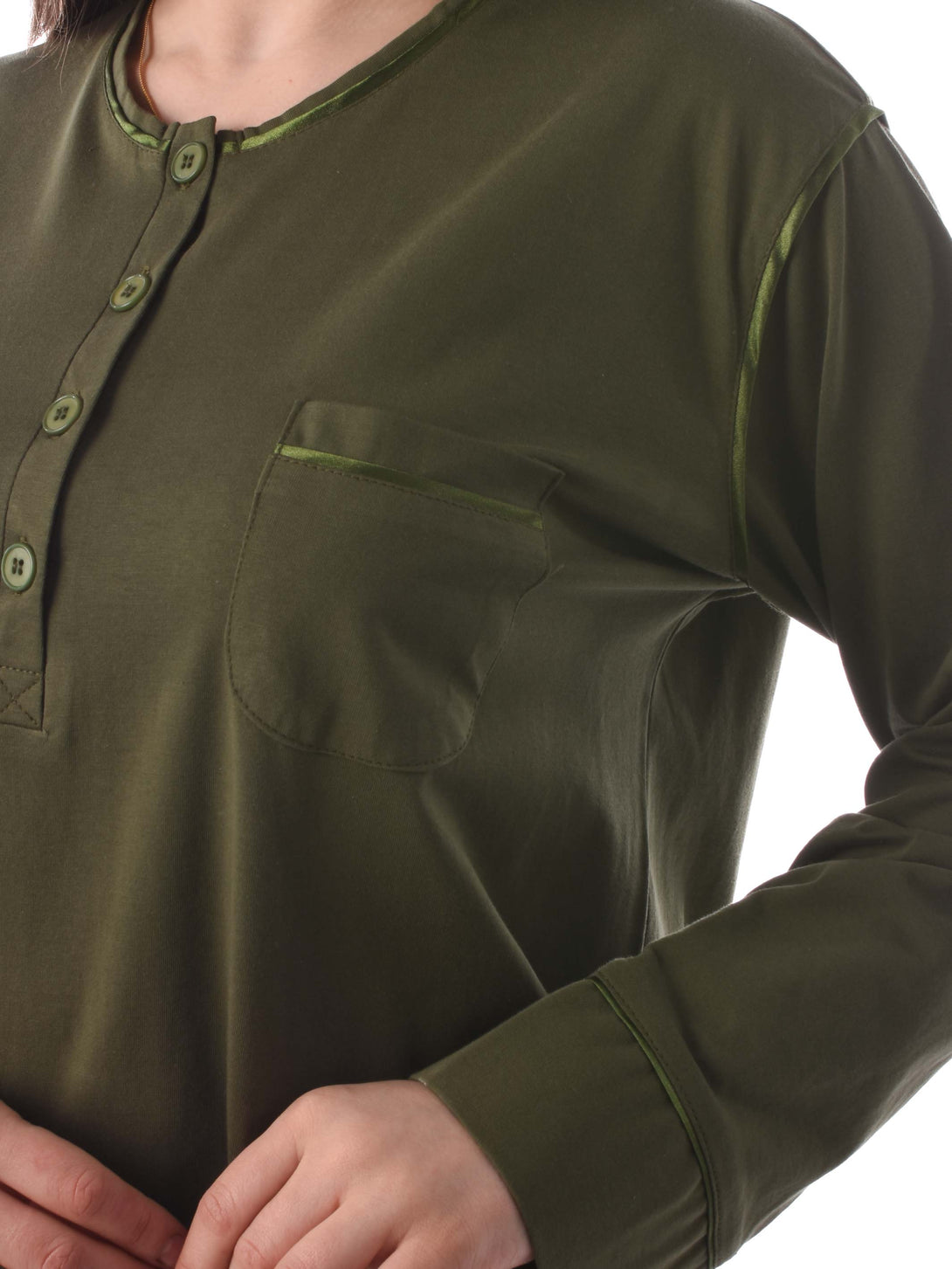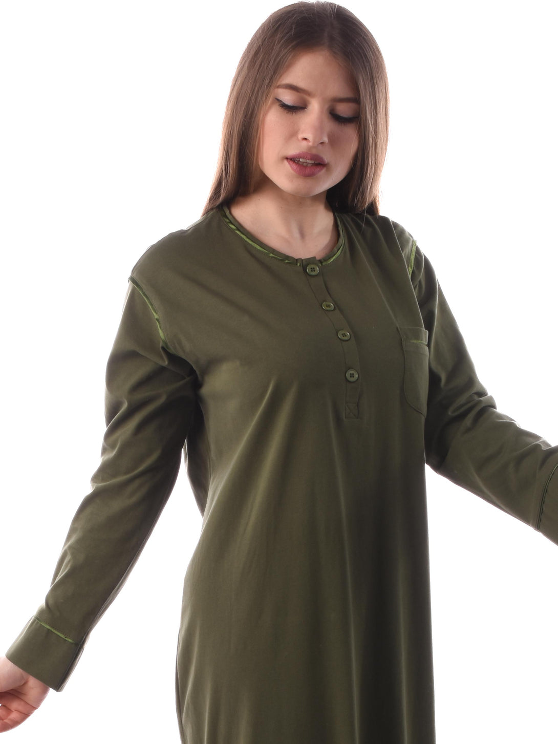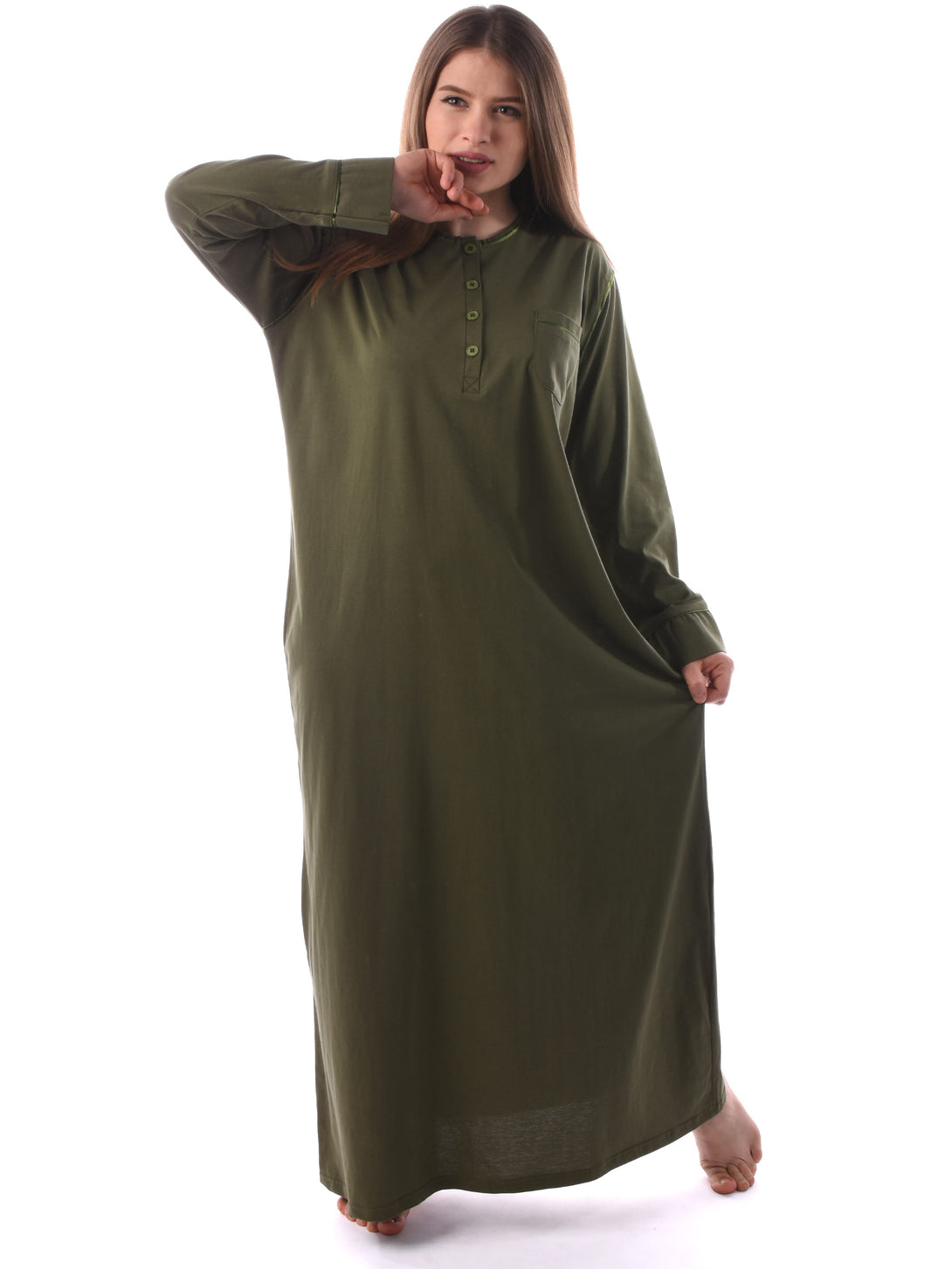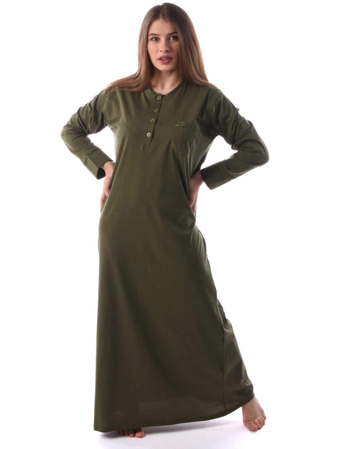 Long nightdress with round neckline and buttons at the top, dropped shoulders and long sleeves.