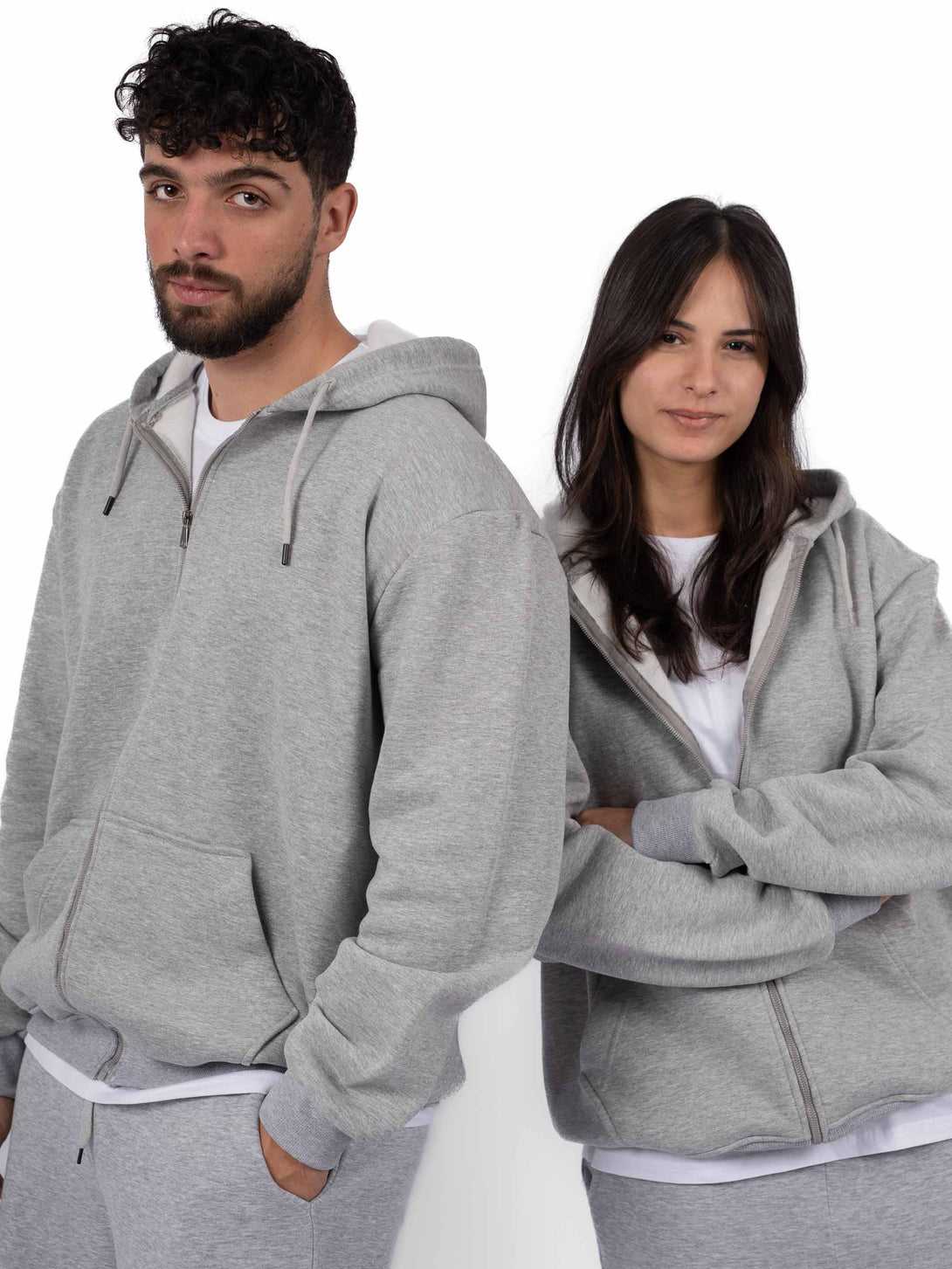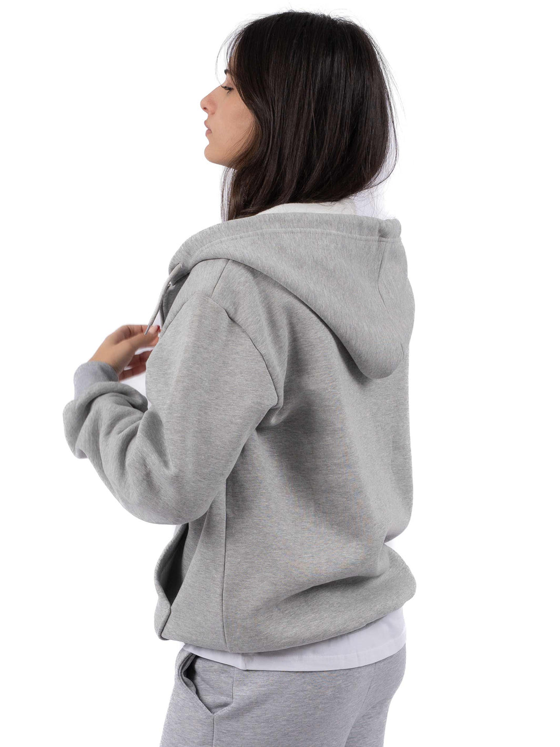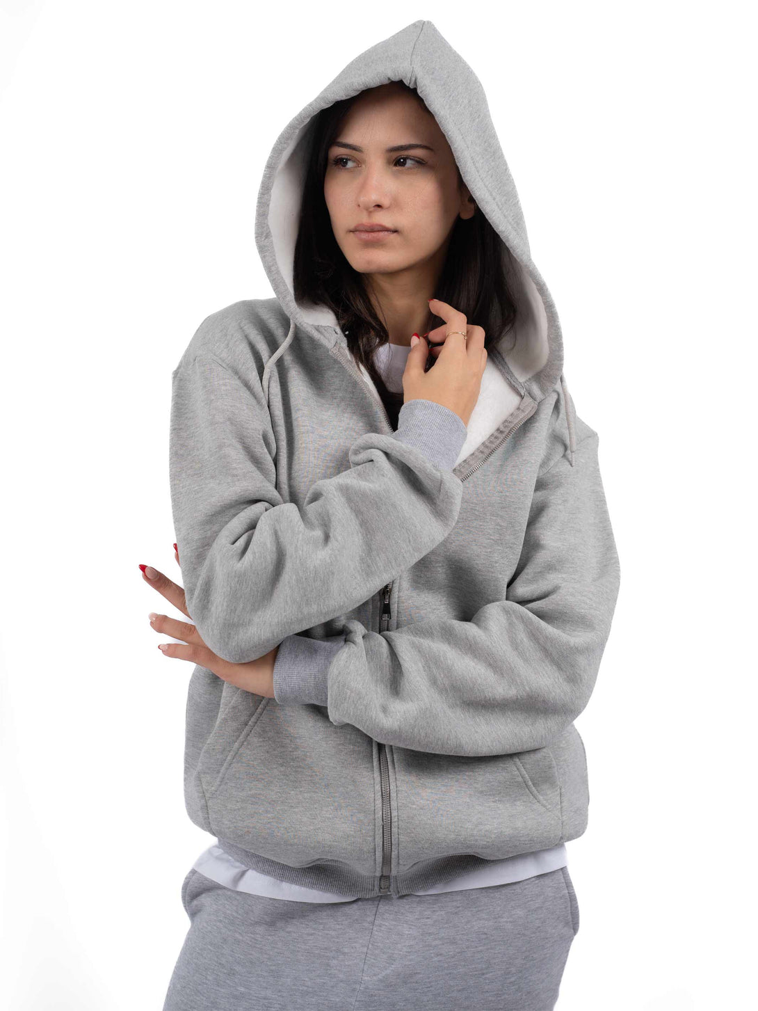 Adjustable hood and long sleeves. Front pouch pocket. Ribbed trims. Zip-up front.