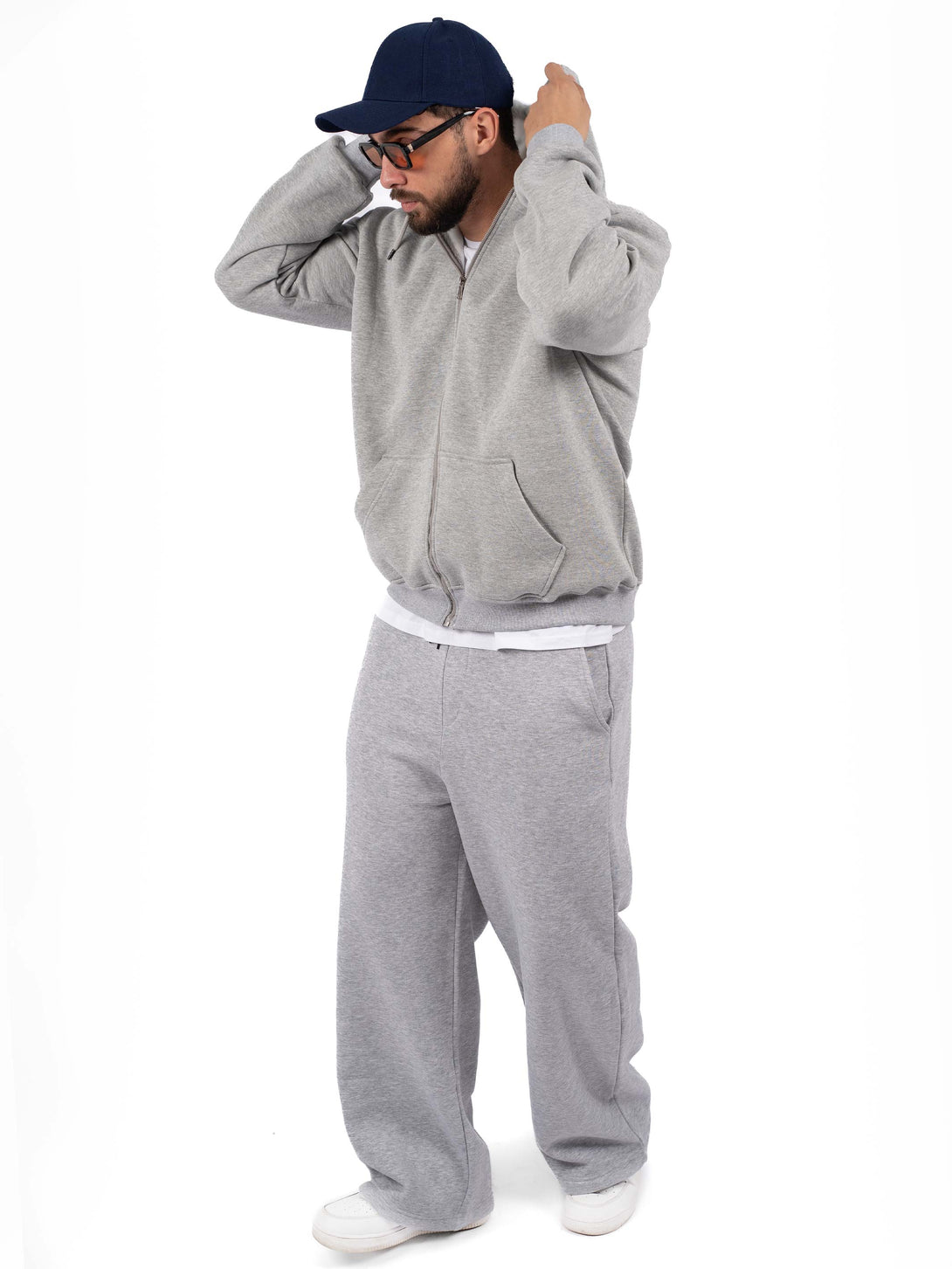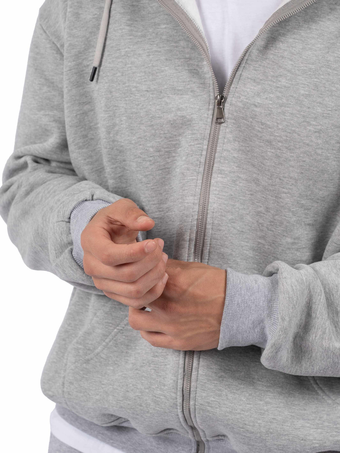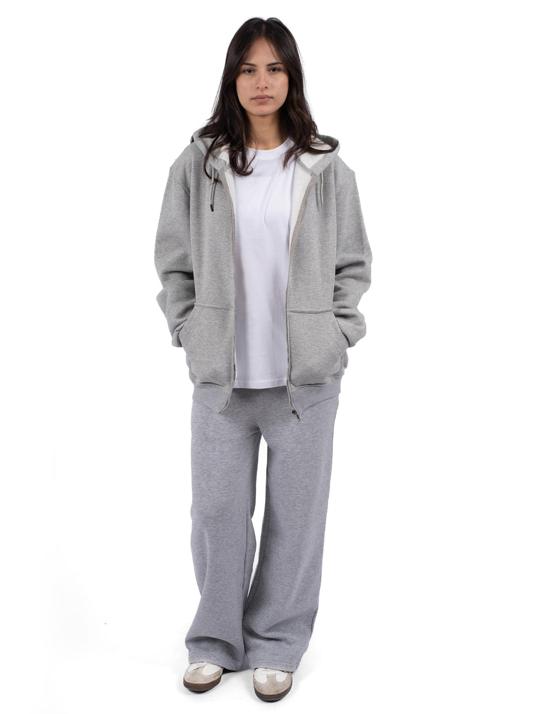 Adjustable hood and long sleeves. Front pouch pocket. Ribbed trims. Zip-up front.