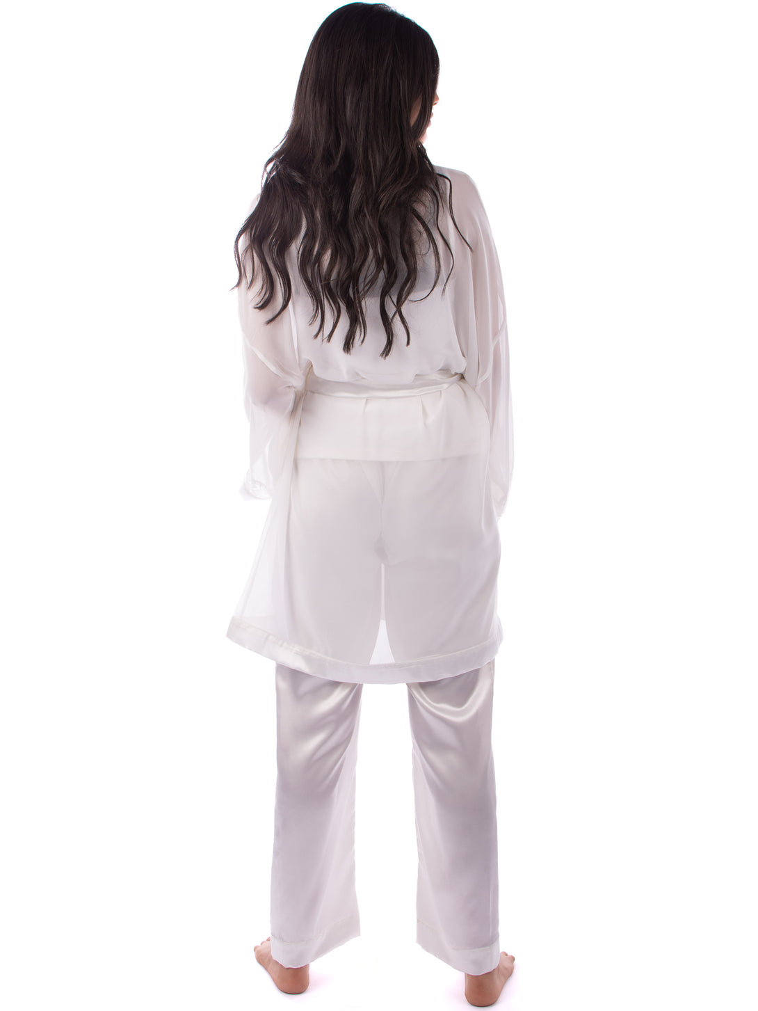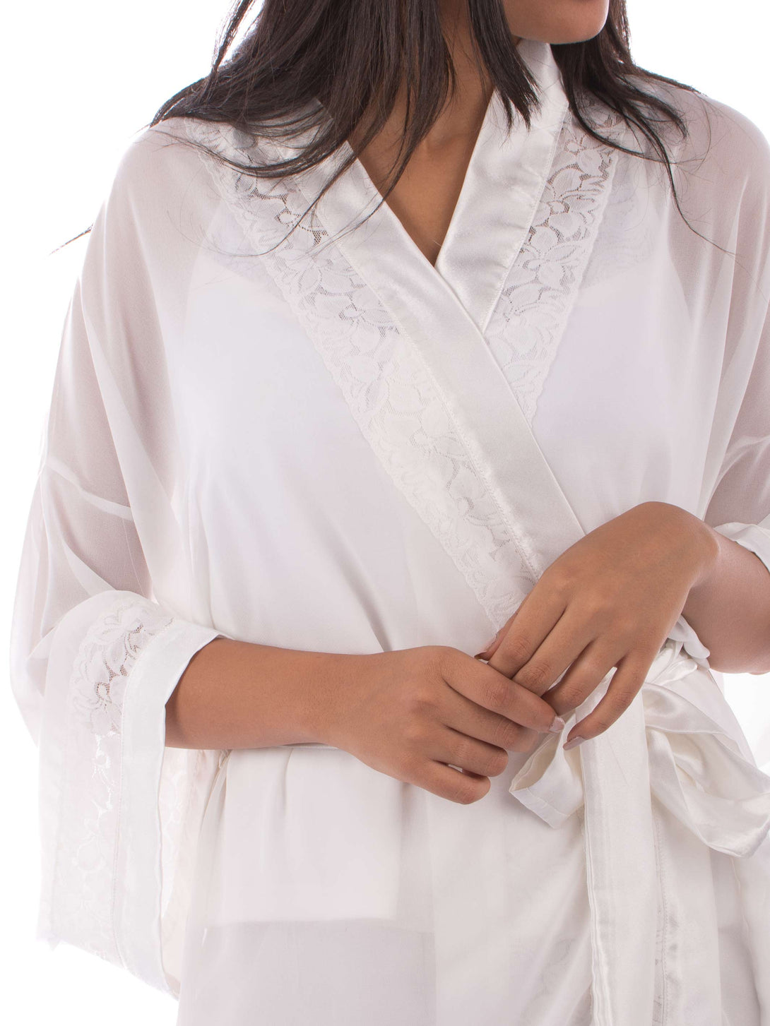 Off-white Knee length transparent chiffon robe, with satin all over the edges detailed with lace and Satin belt