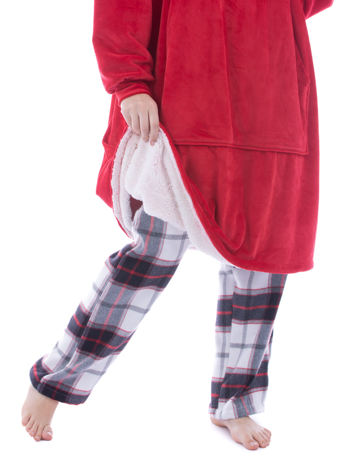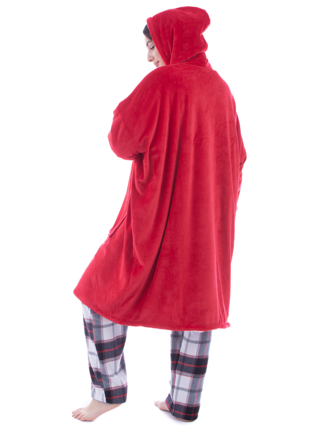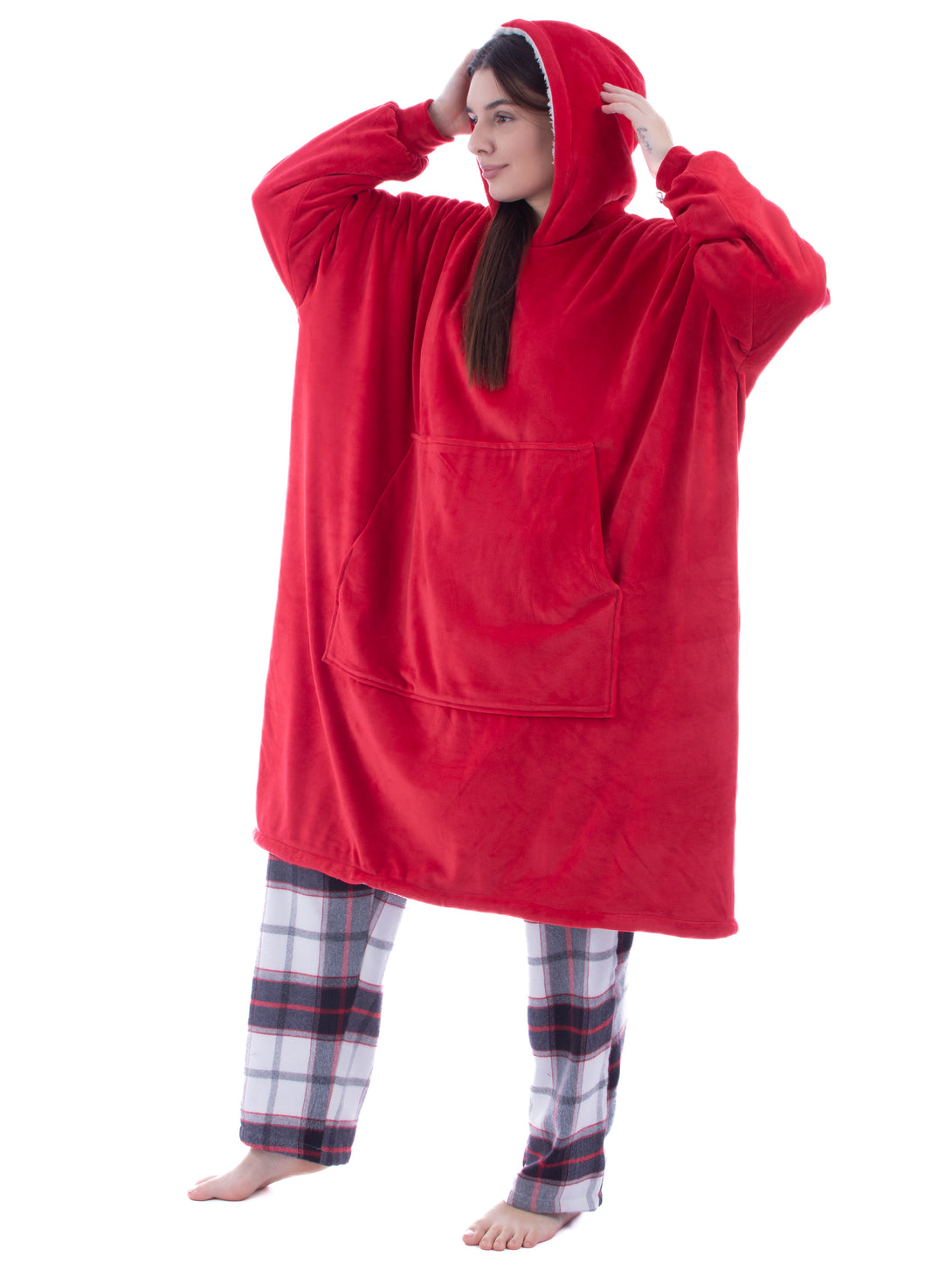 Red blanket hoodie to keep you warm and enjoy all the comfort. A fleece blanket With extra-large central pocket, super soft use inside and outside