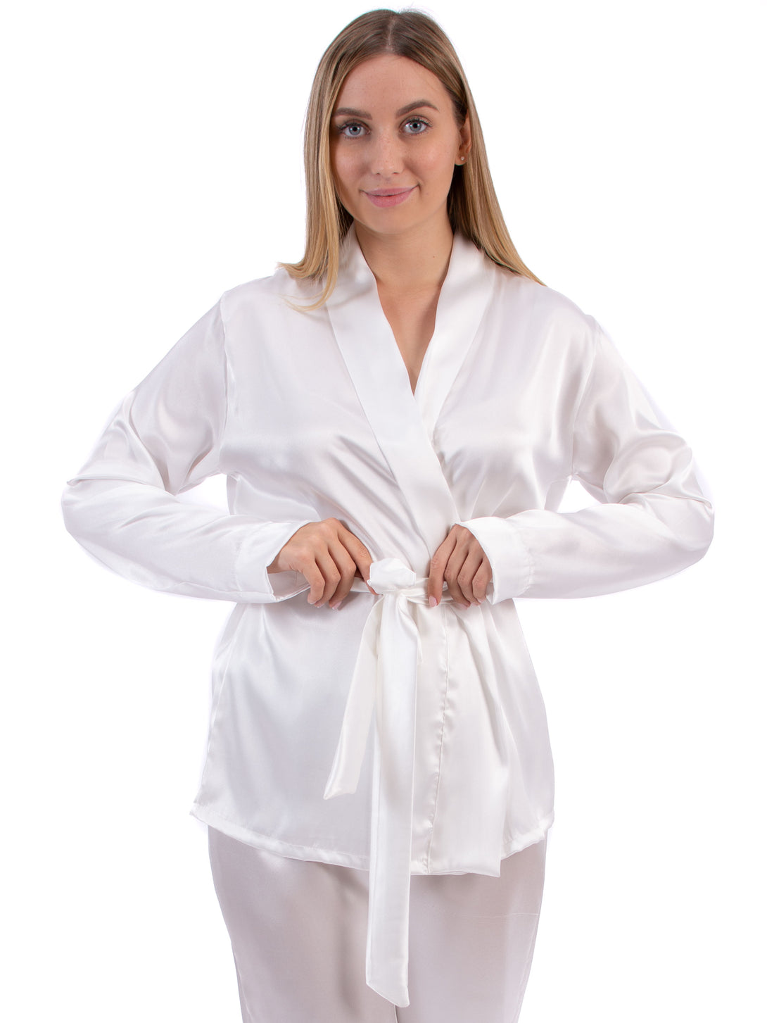 Double-breasted Satin set, Jacket and a tie belt at the waist. Bottoms with an elasticated waist and straight legs.