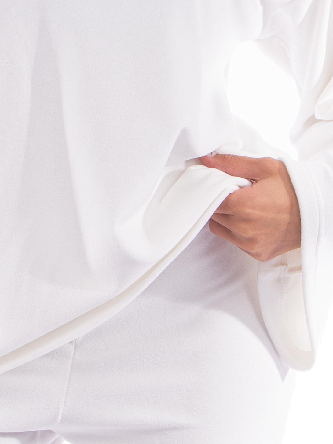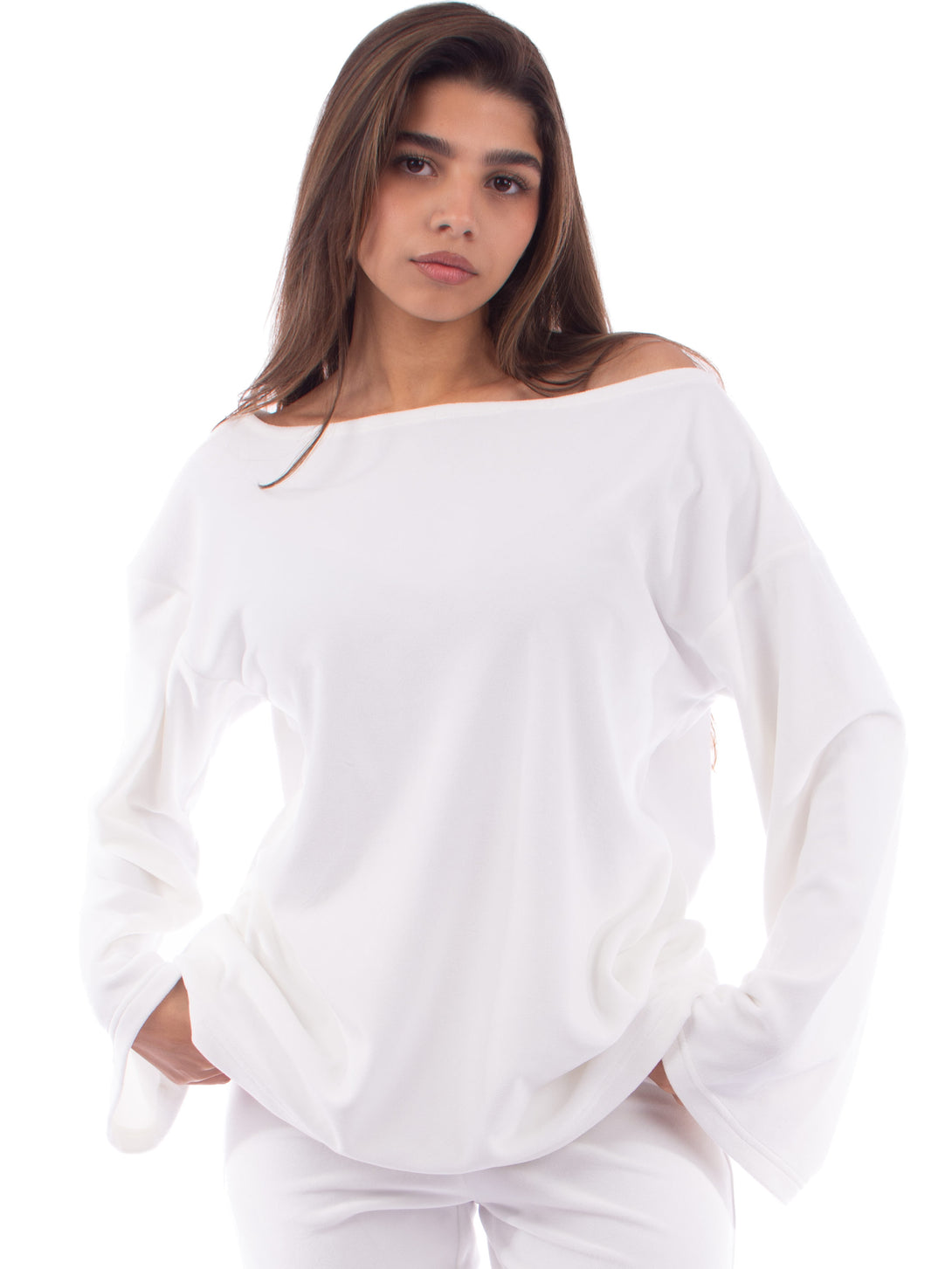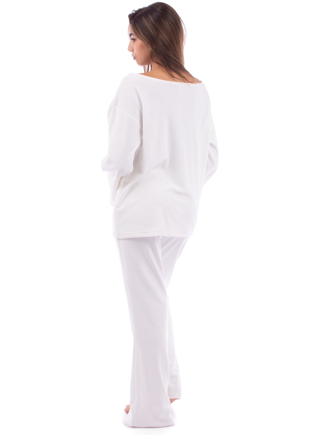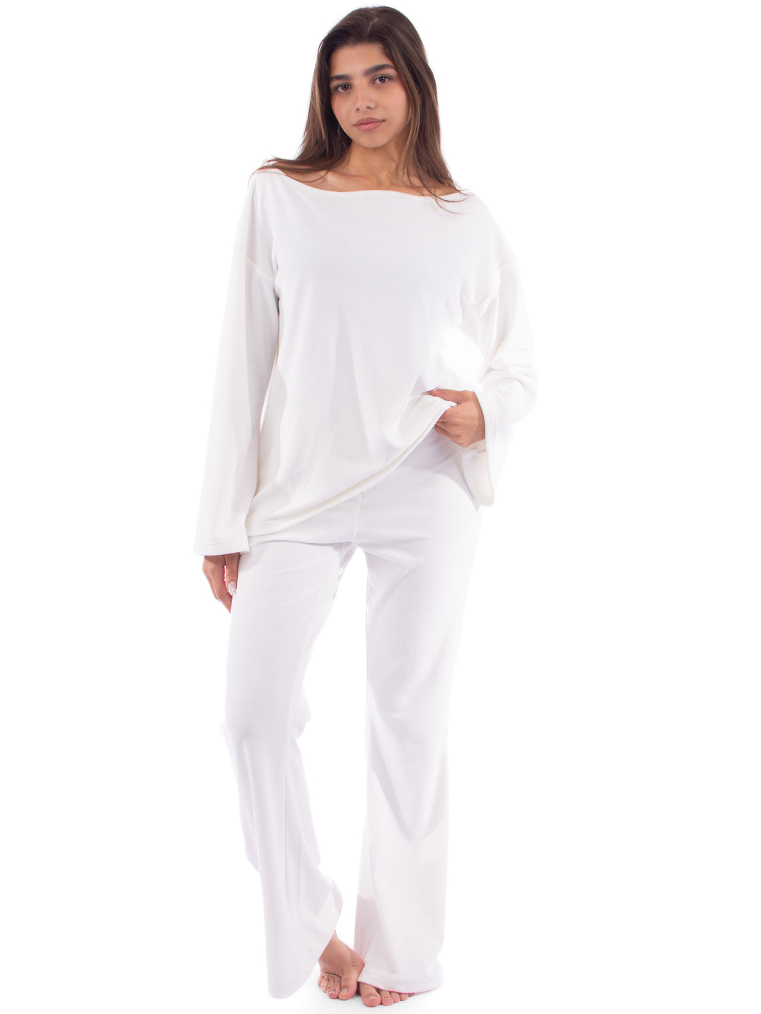 soft velvet Fleece pyjama set, Sabrina top with wide long sleeves with matching wide leg cut pants.