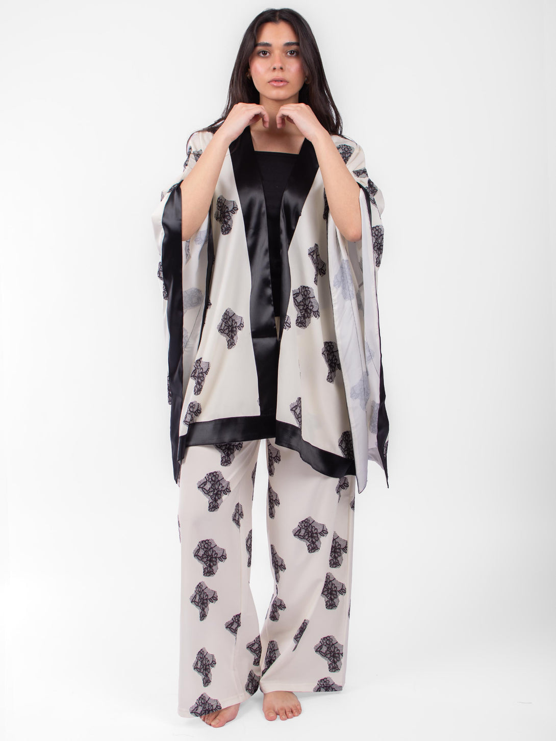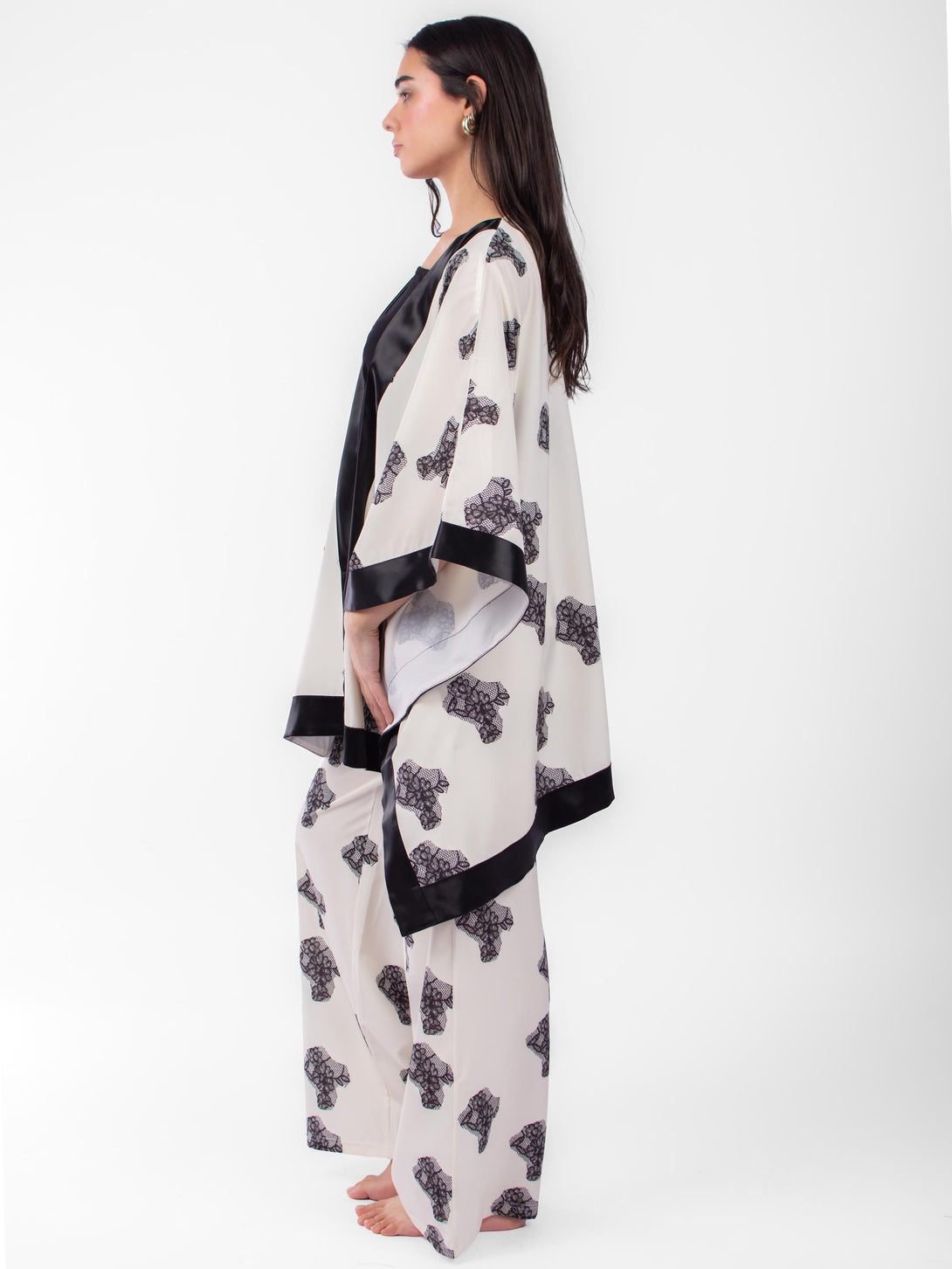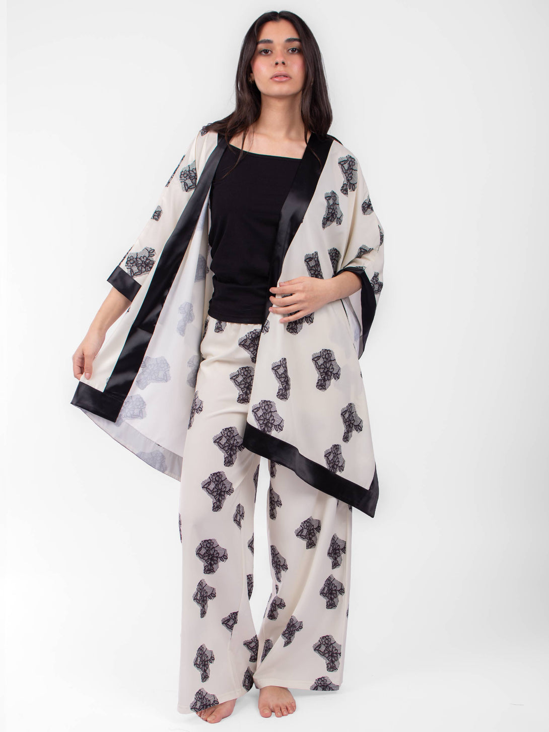 Matching Set of 3 pieces pyjama, Kimono with satin hims, with strap cotton top and straight cut pants with elastic waist.