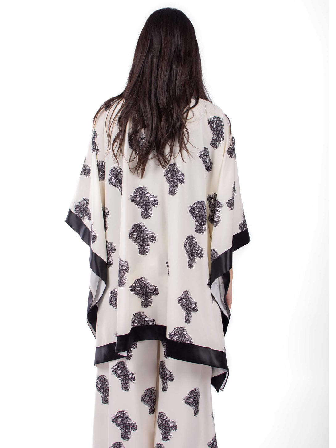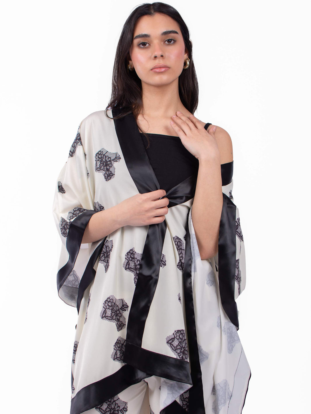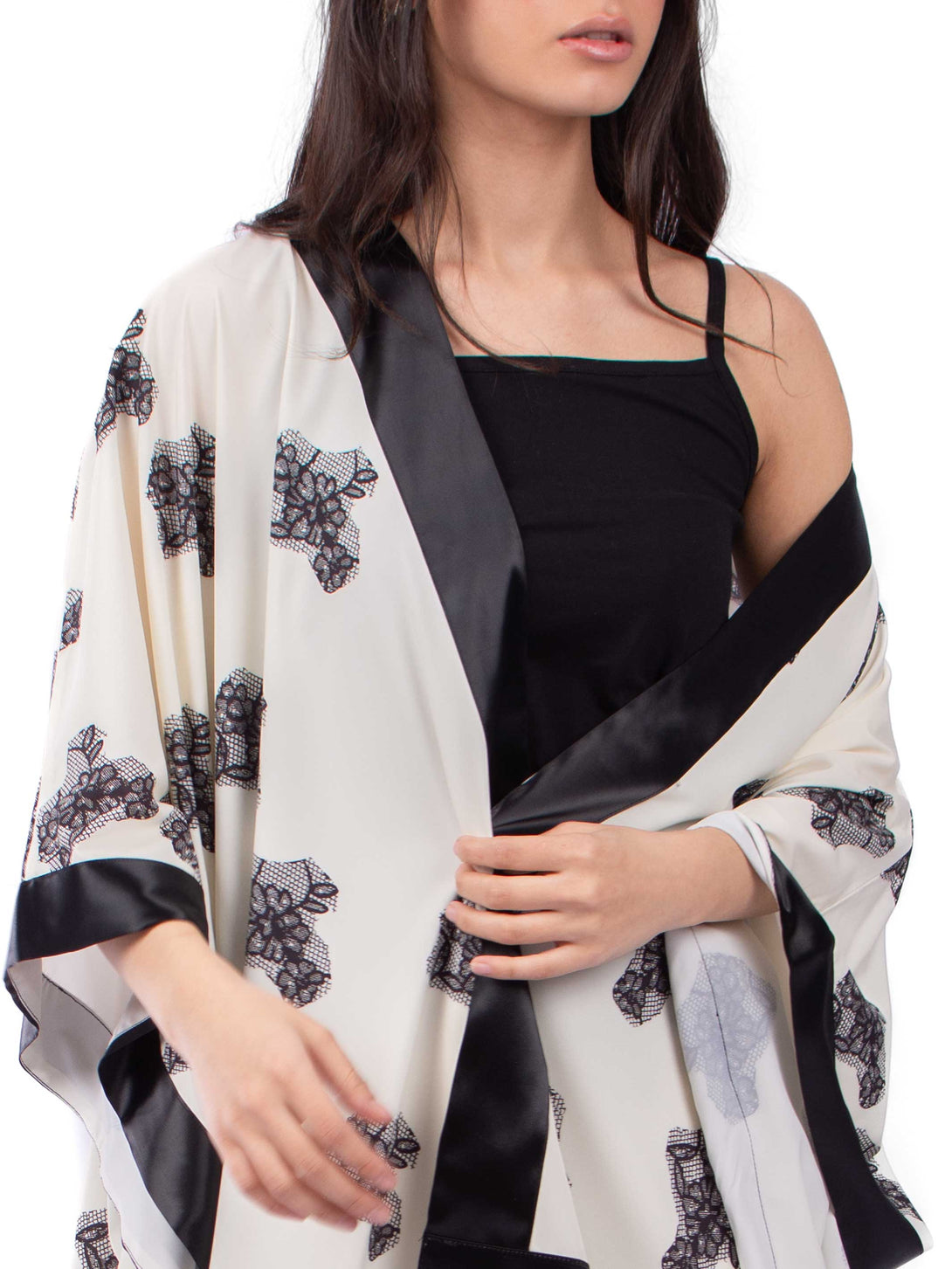 Matching Set of 3 pieces pyjama, Kimono with satin hims, with strap cotton top and straight cut pants with elastic waist.