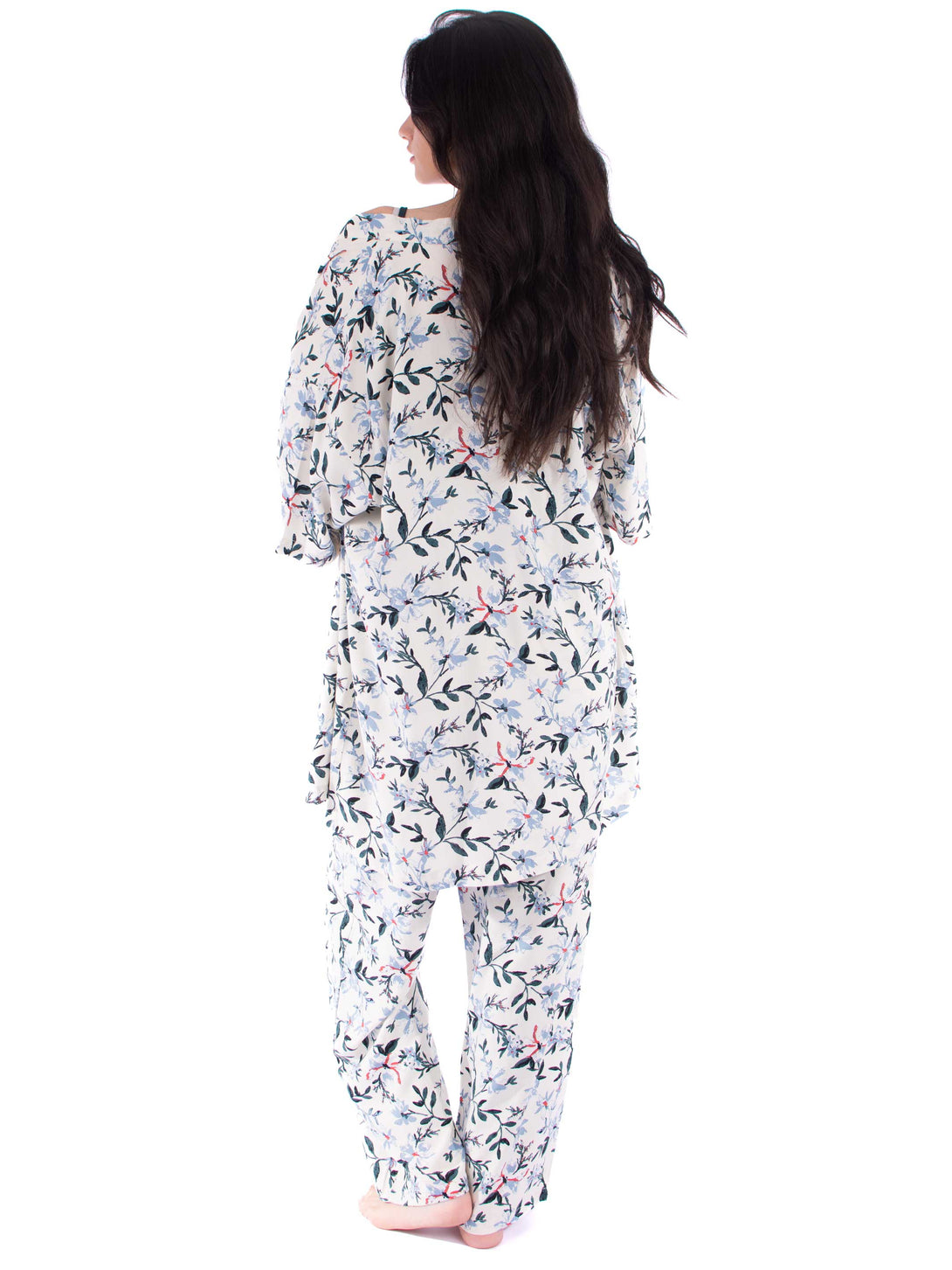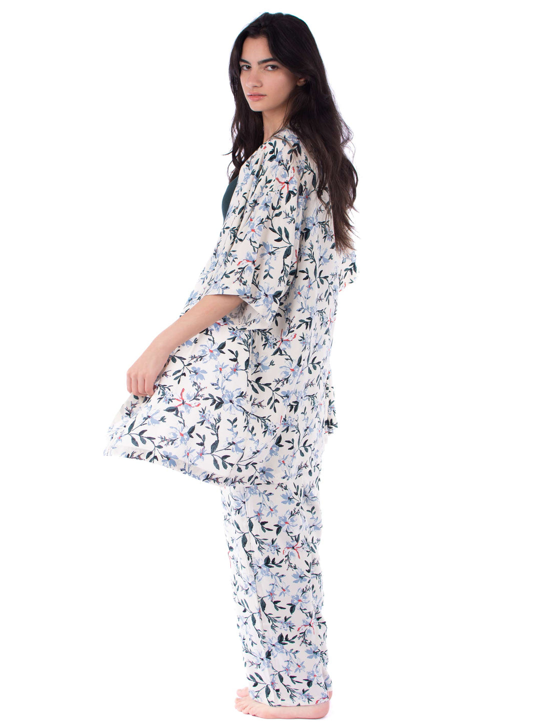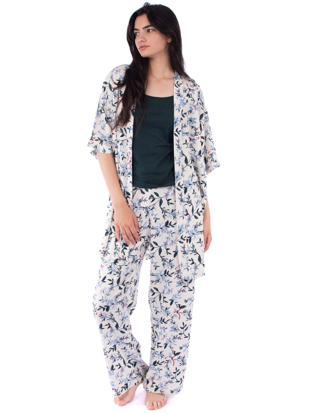 Matching Set of 3 pieces pyjama, Kimono with split him, with strap cotton top and straight cut pants with elastic waist.
