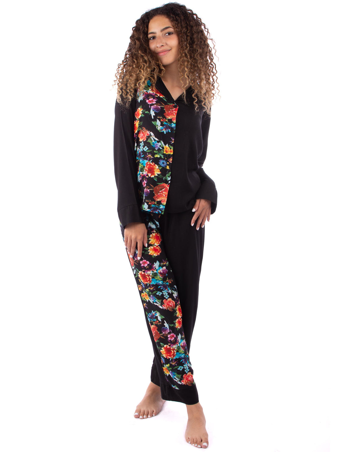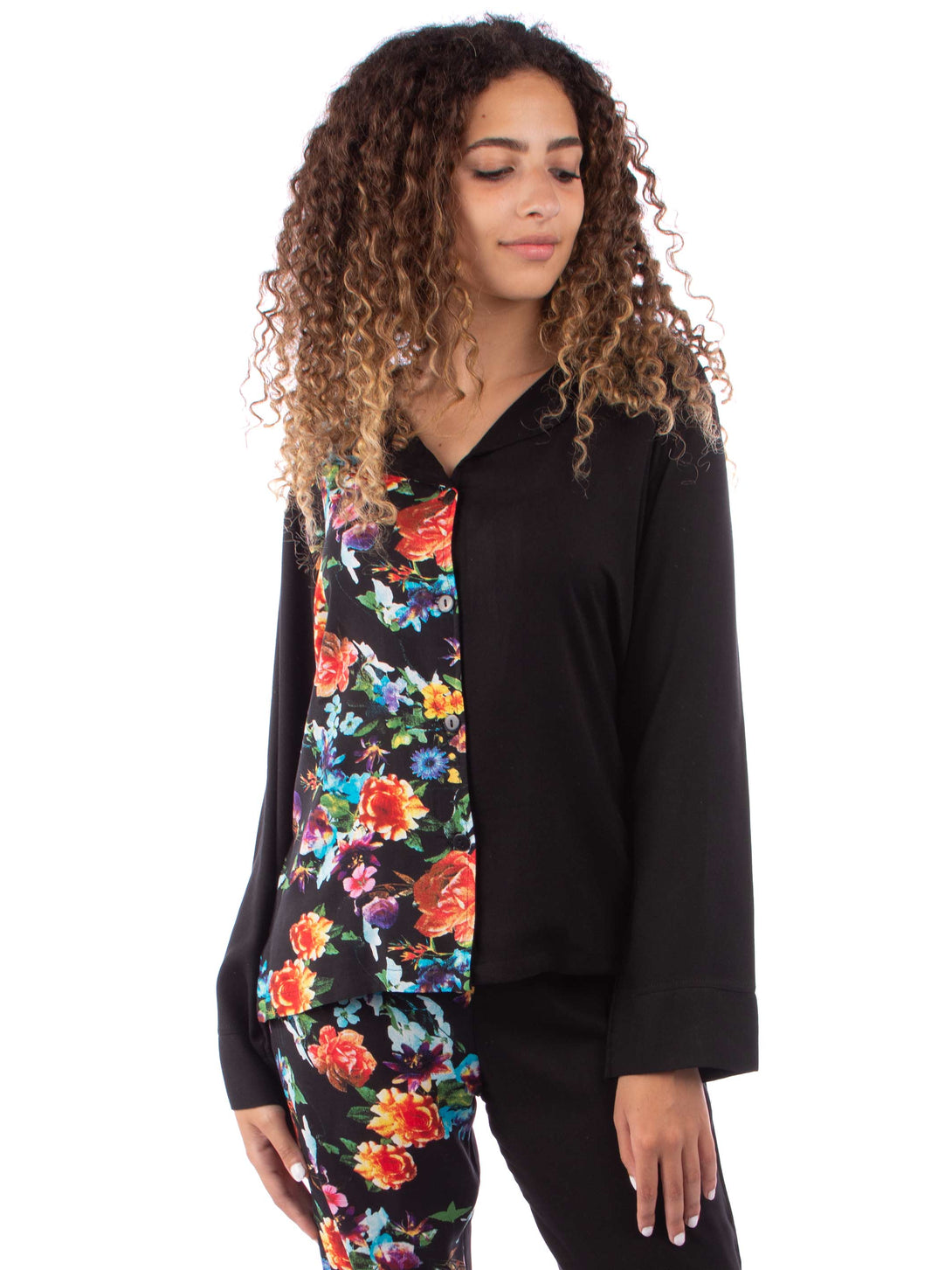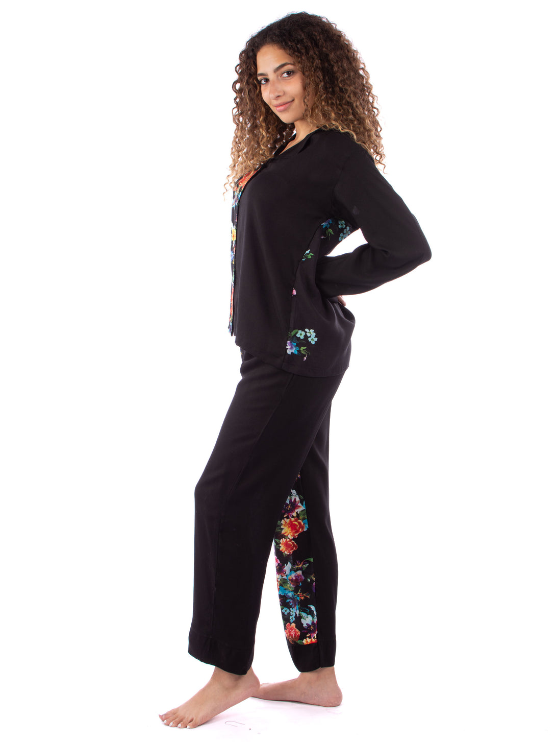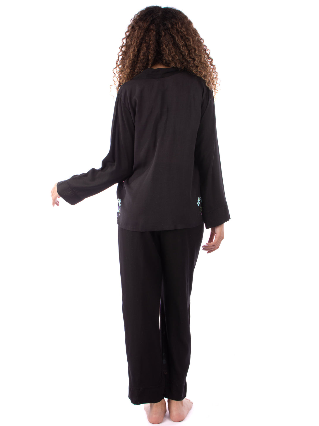 Pyjama Set, a Shirt double match with V-neckline and buttons down the front, chest pocket. Bottoms with an elasticated waist and straight legs.
