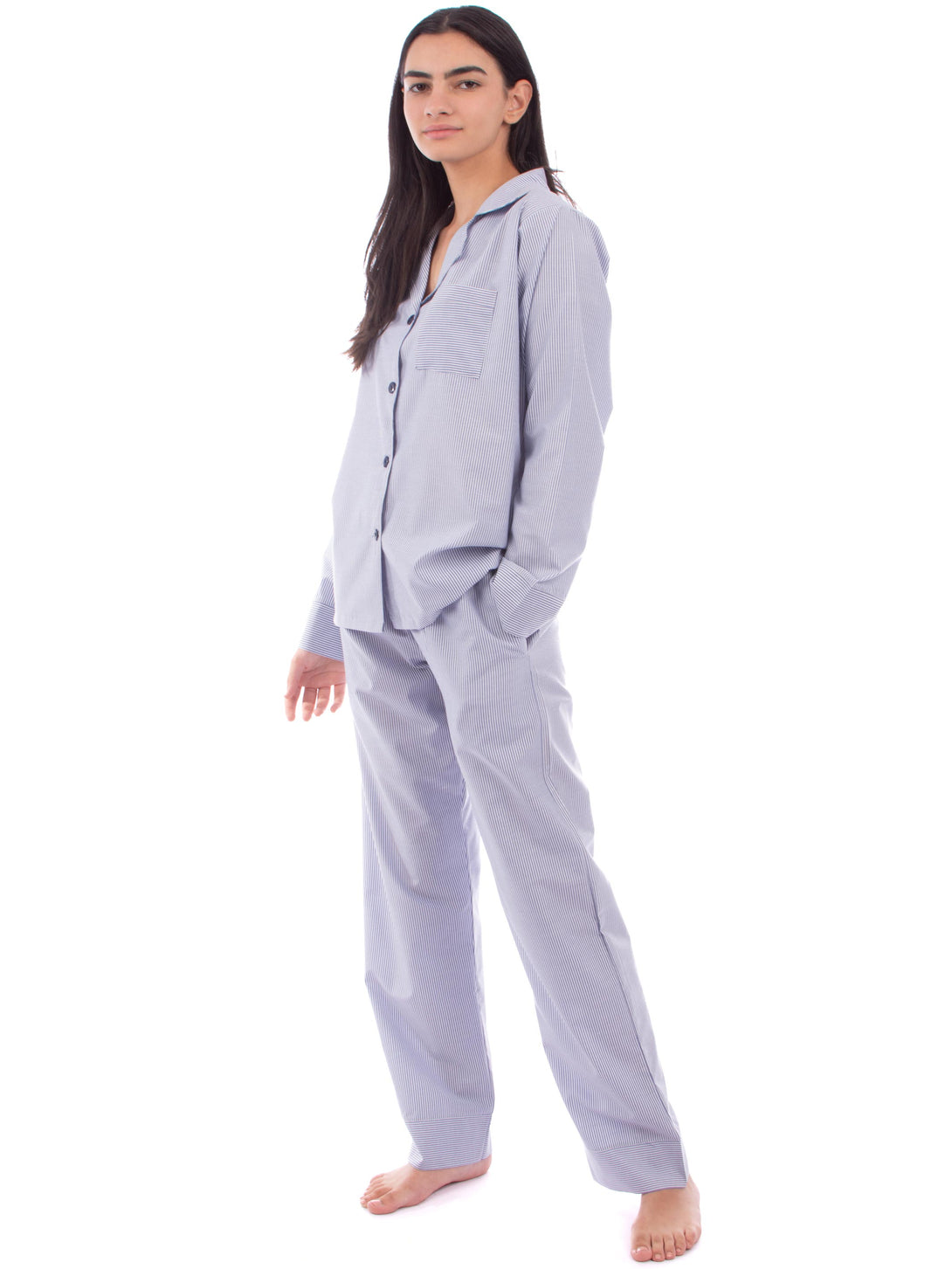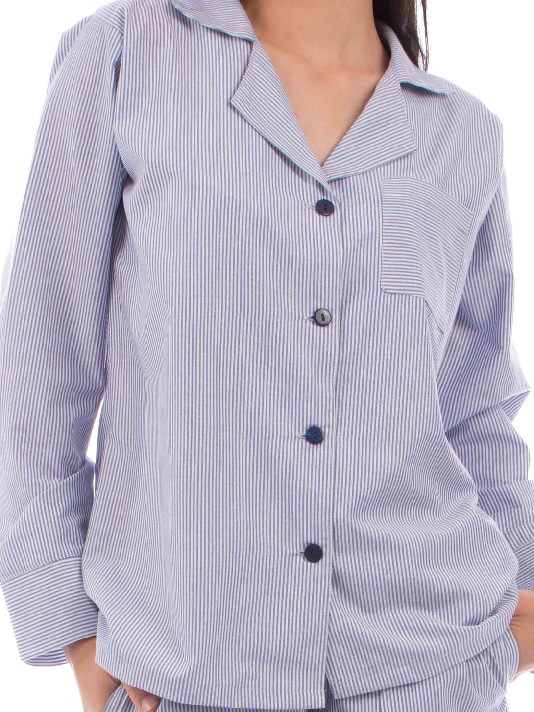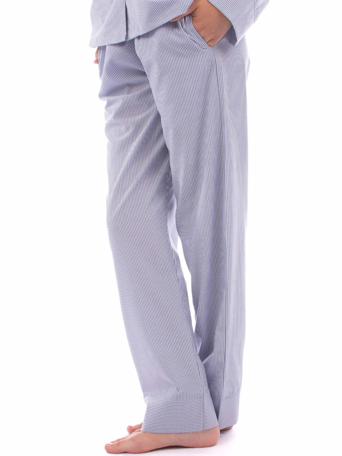 Pyjama Classic, long sleeve Shirt with V-neckline and buttons down the front , Bottoms with an elasticated waist with two side pockets, straight cut legs.
