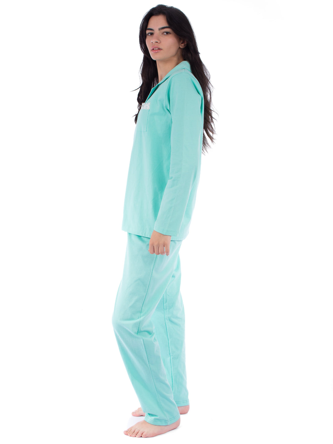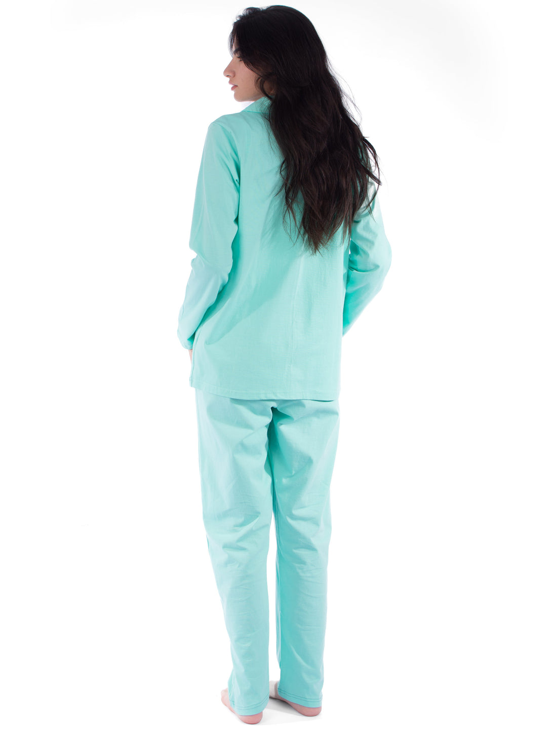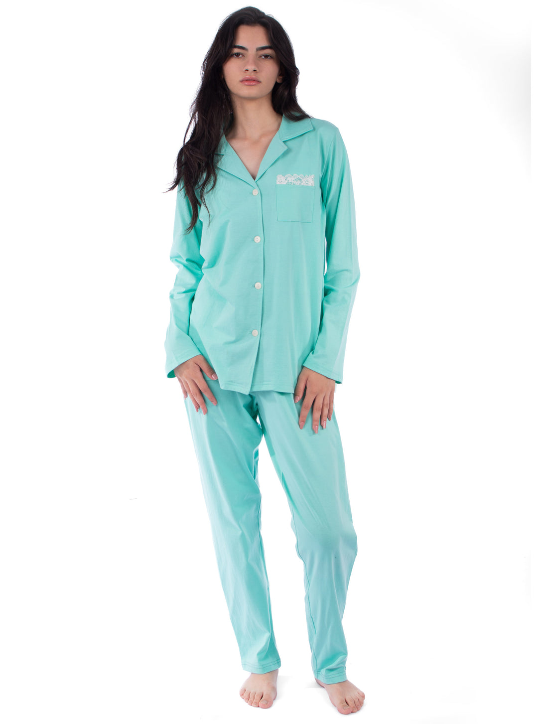 Pyjama set, Shirt with V-neckline and buttons down the front, chest pocket with small embroidered lace detail . Pants with an elasticated waist and straight legs.