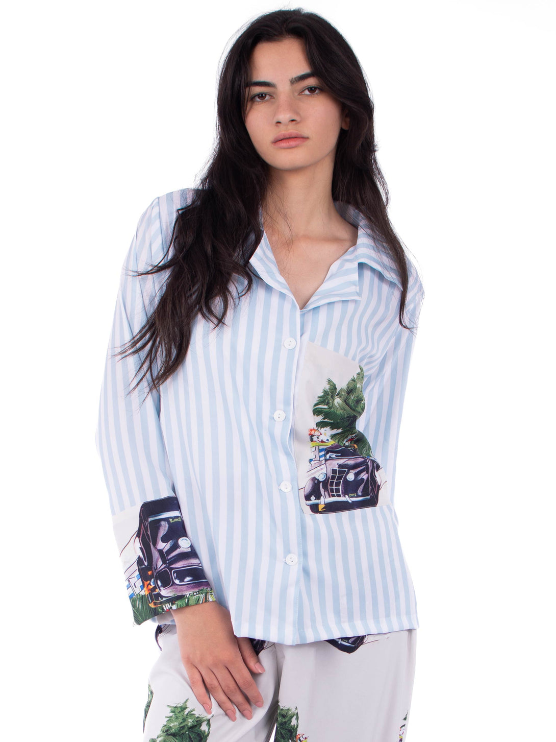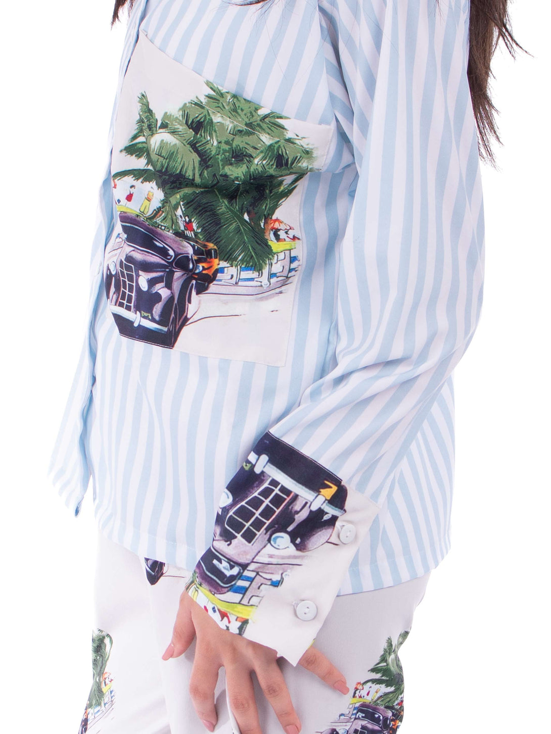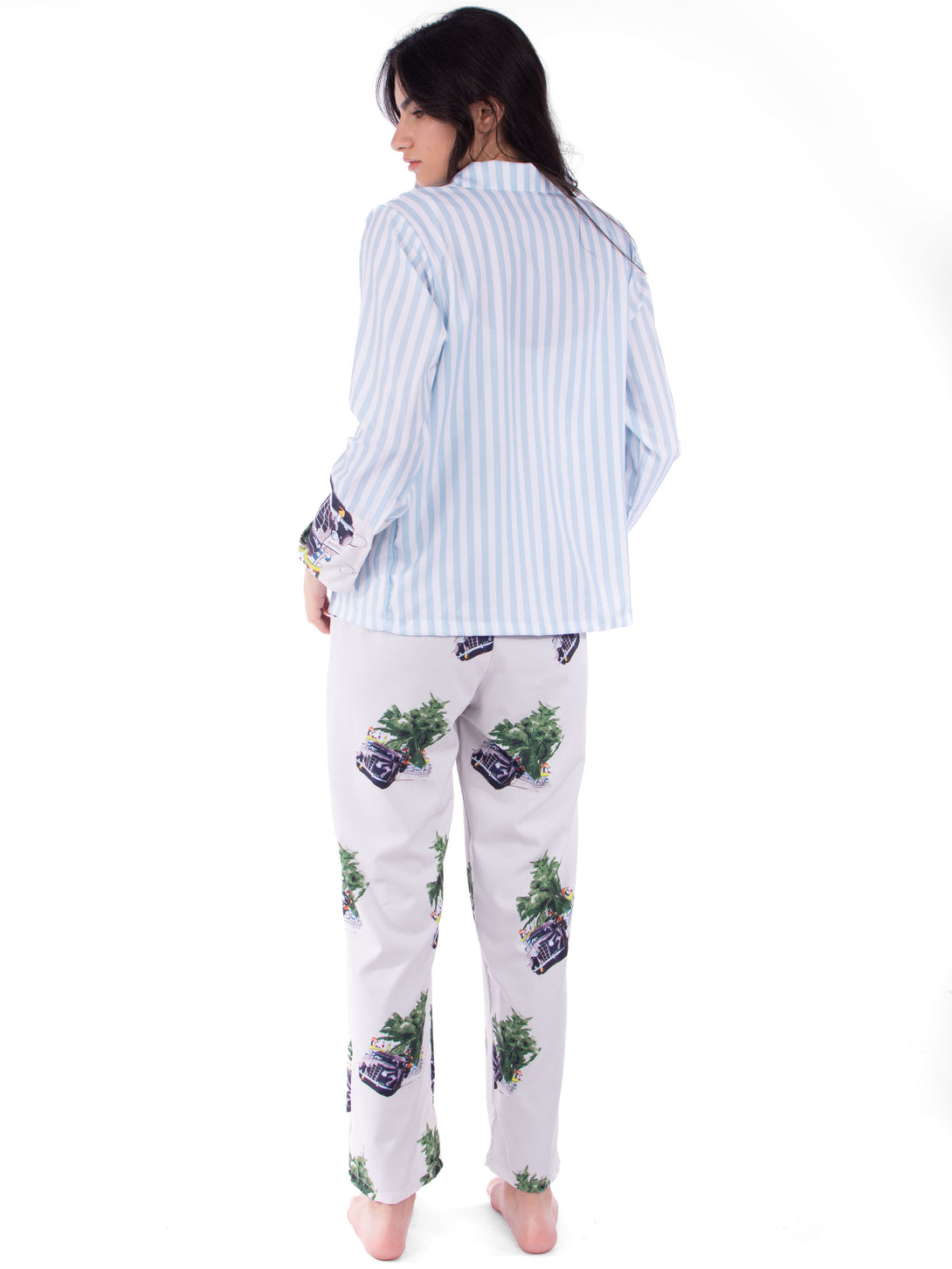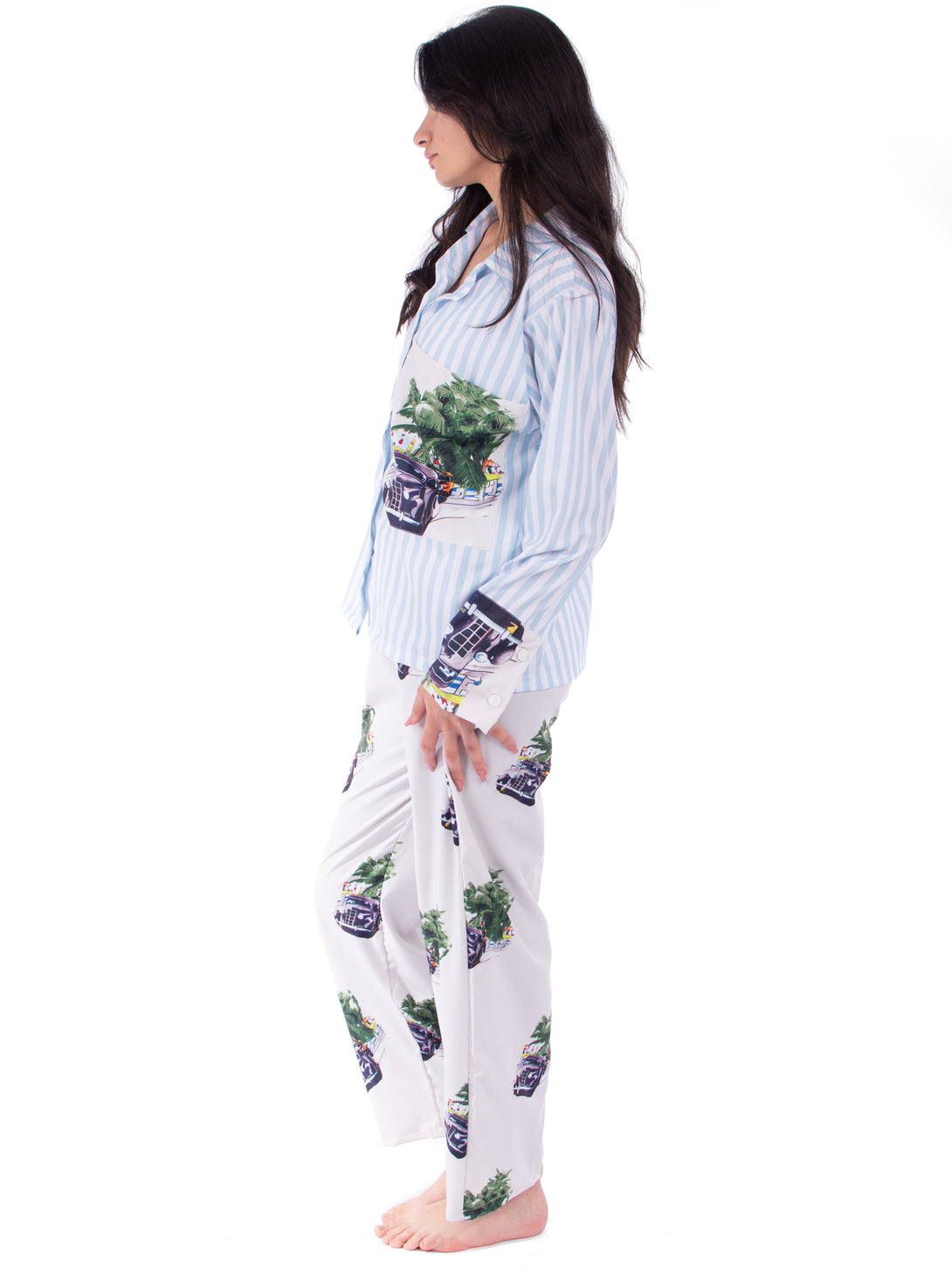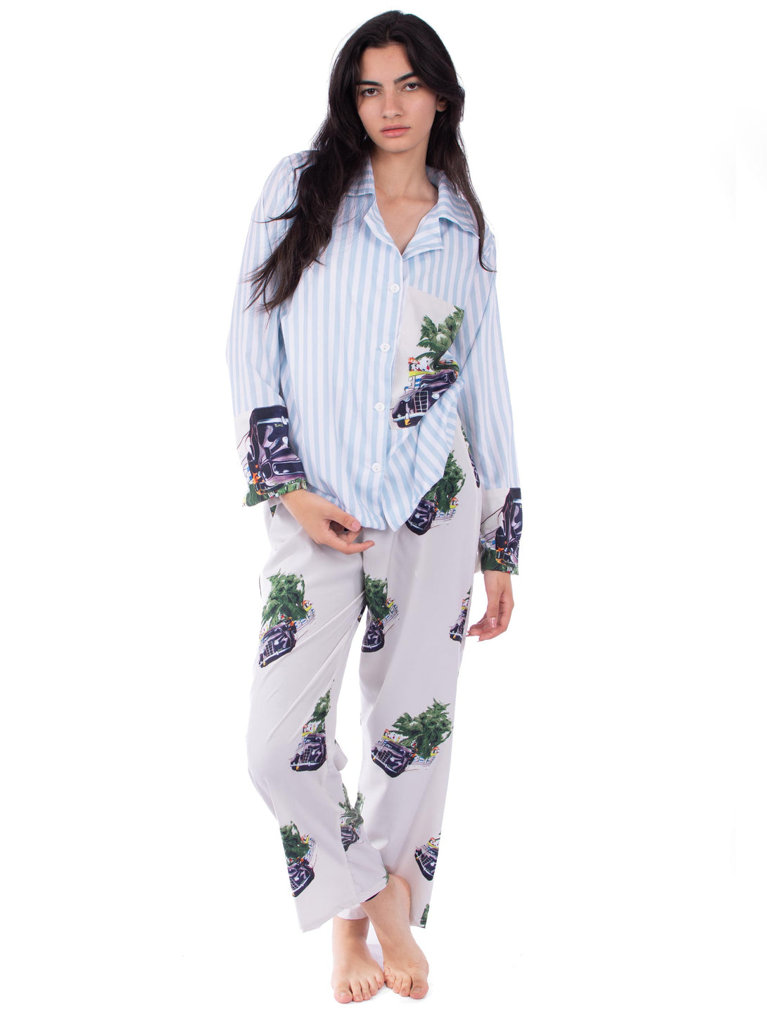 Pyjama Set, a Shirt with V-neckline and buttons down the front, chest pocket. Bottoms with an elasticated waist and straight legs.