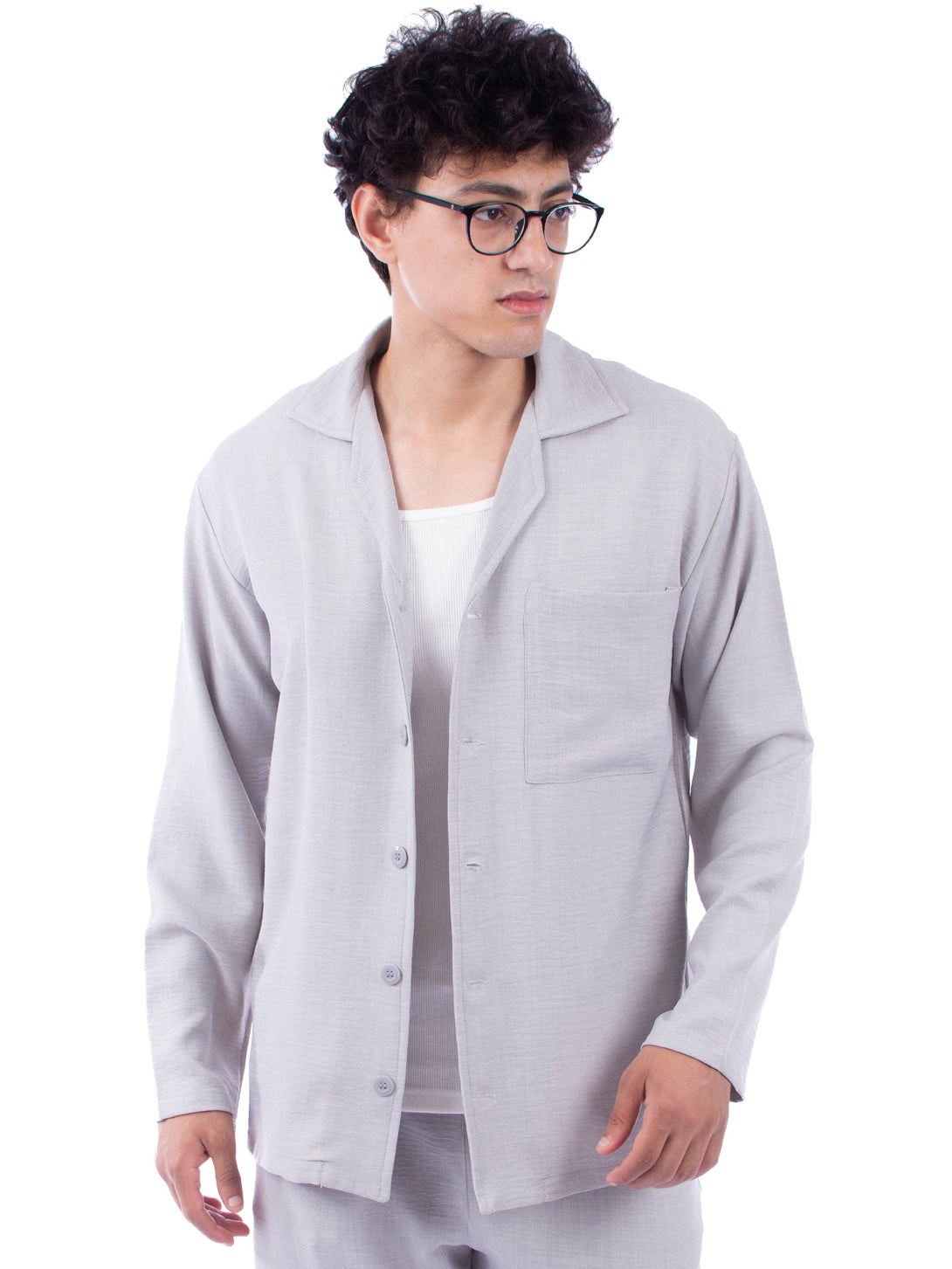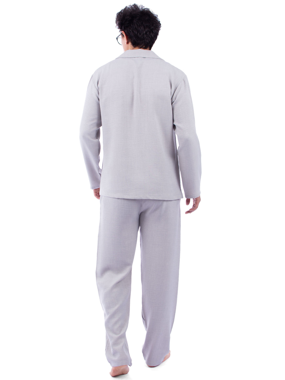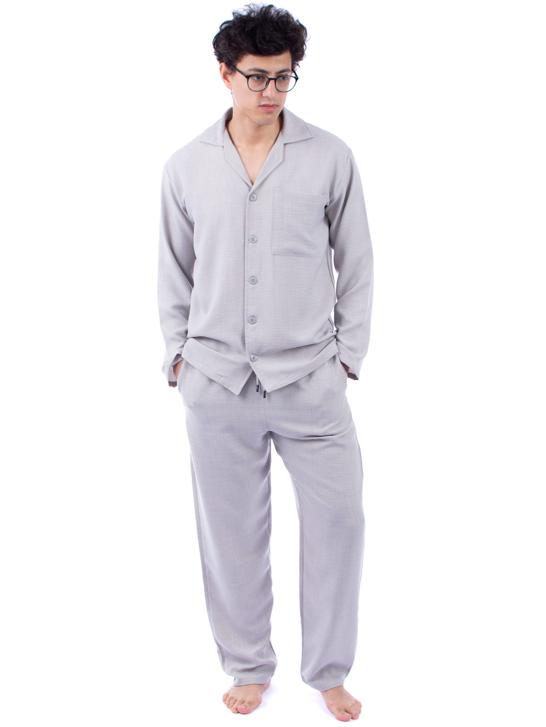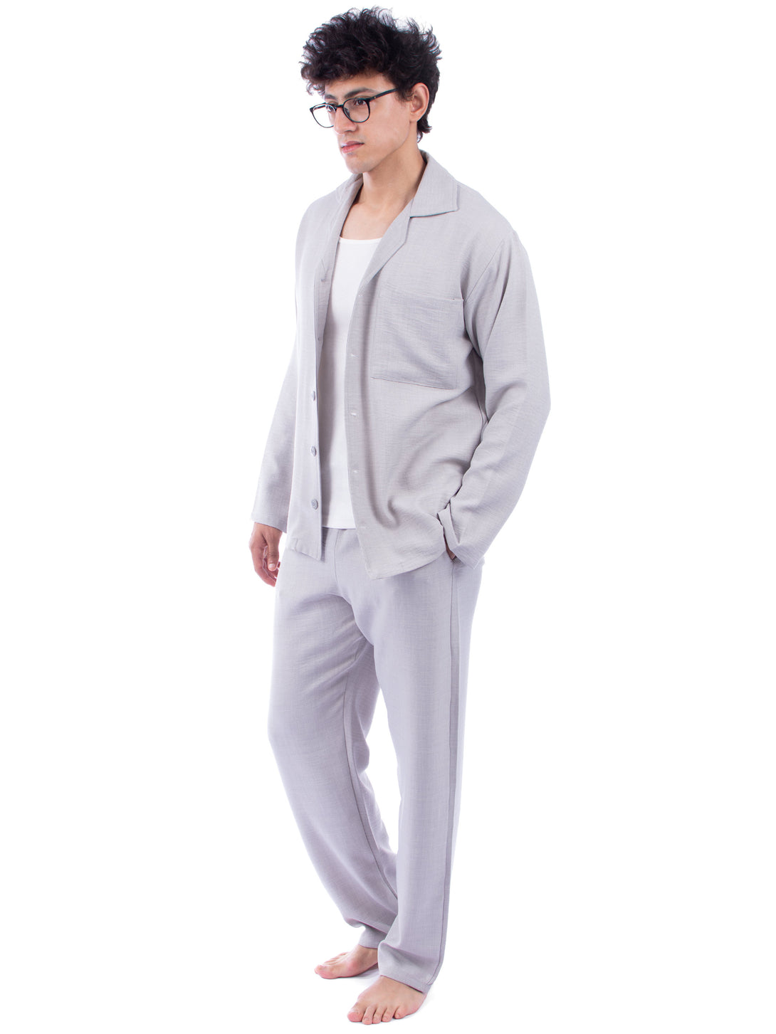 Long-sleeved shirt with notch lapels, buttons down the front and an open chest pocket. Straight-cut pants with an elasticated, drawstring waist, a fake fly, pockets in the side seams.