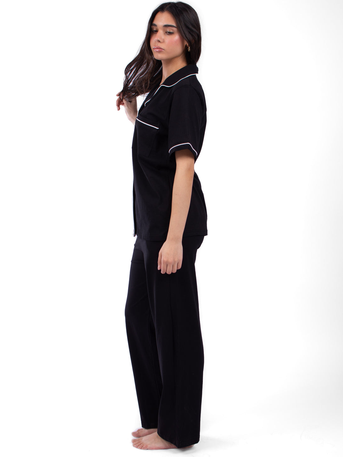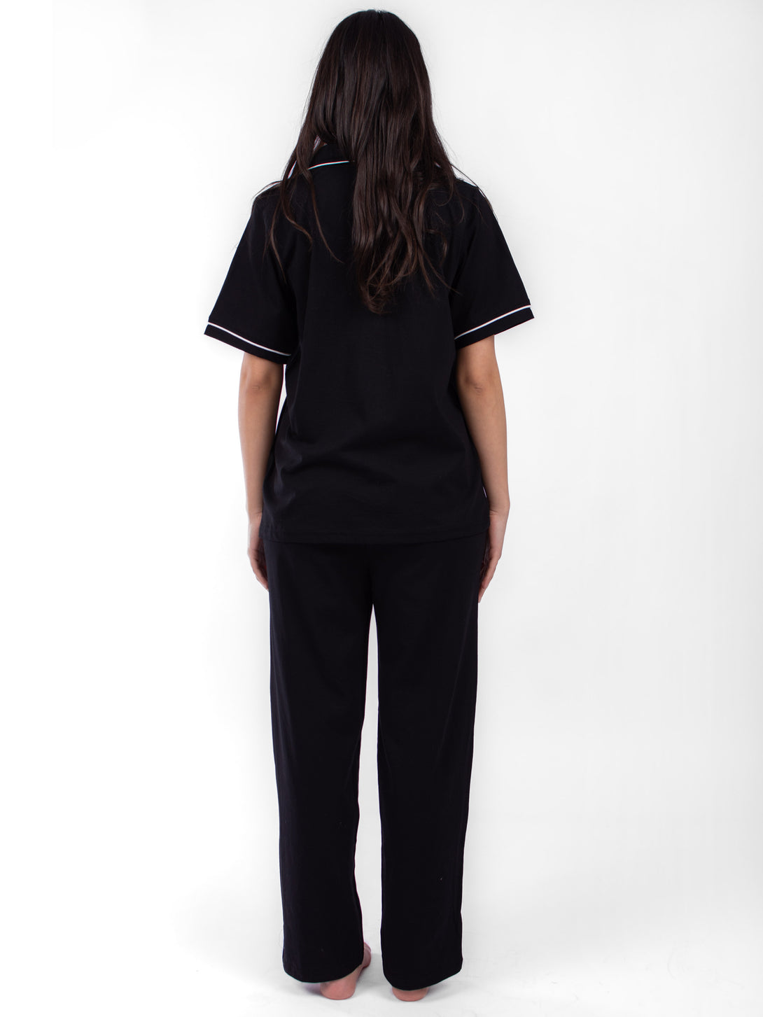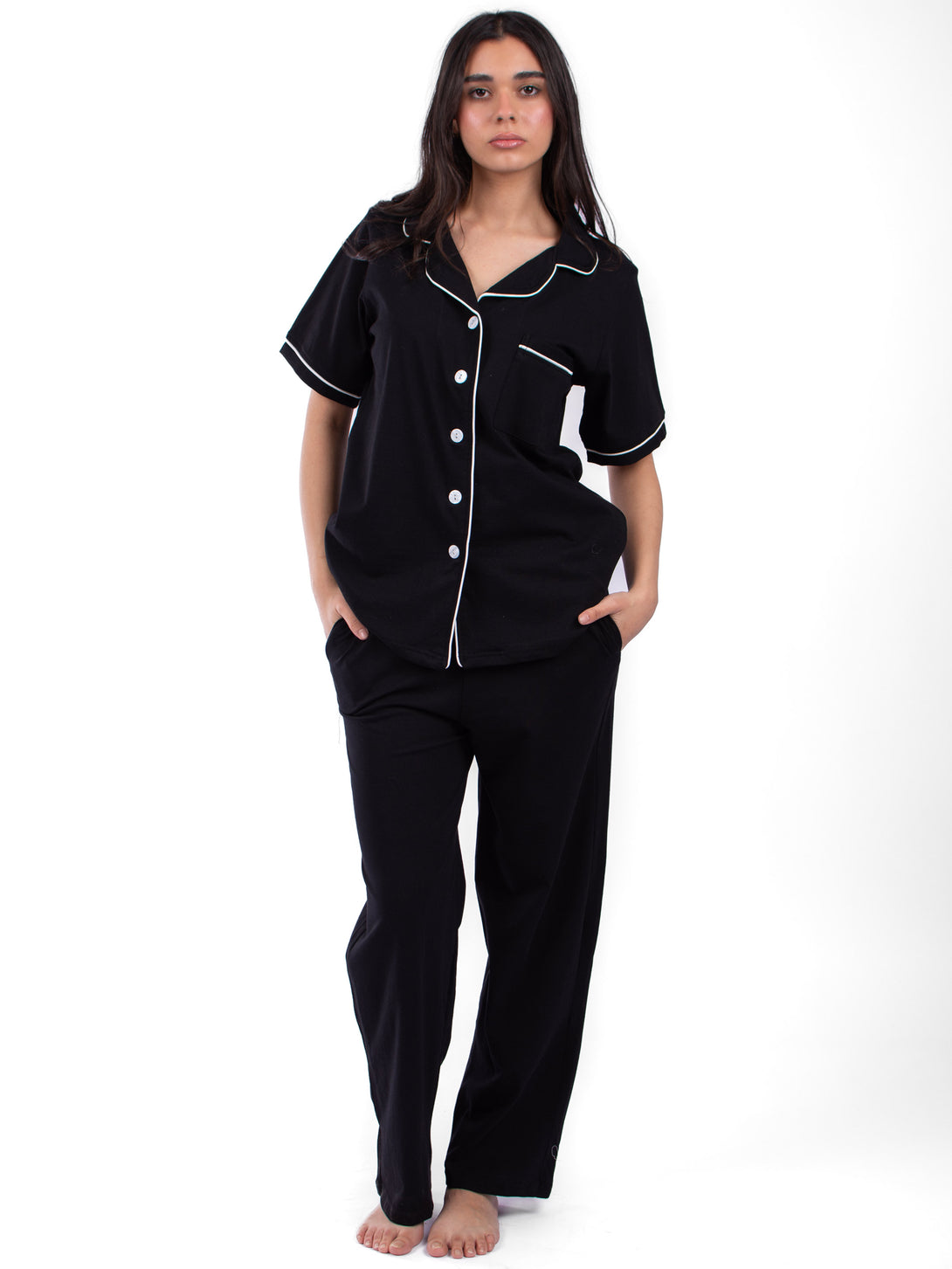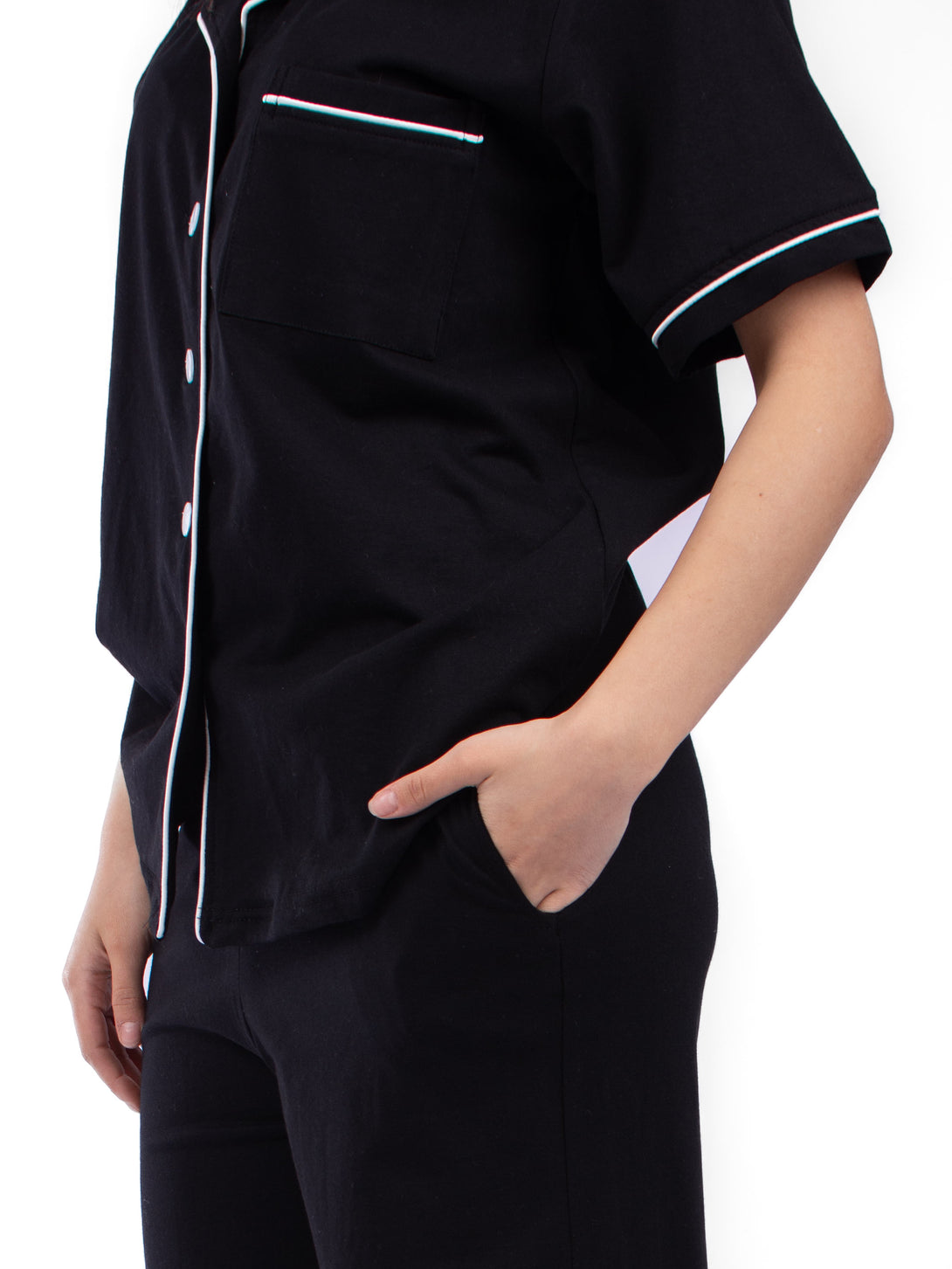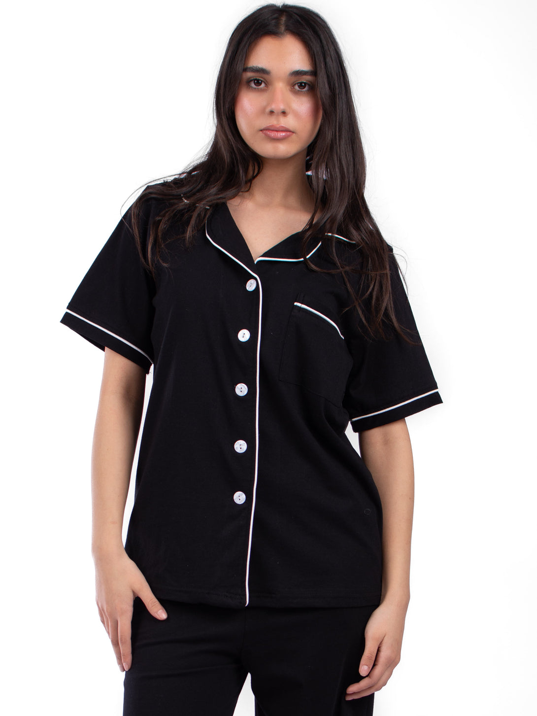 Pyjama Set, a Shirt with V-neckline and buttons down the front, chest pocket. Bottoms with an elasticated waist and straight legs.