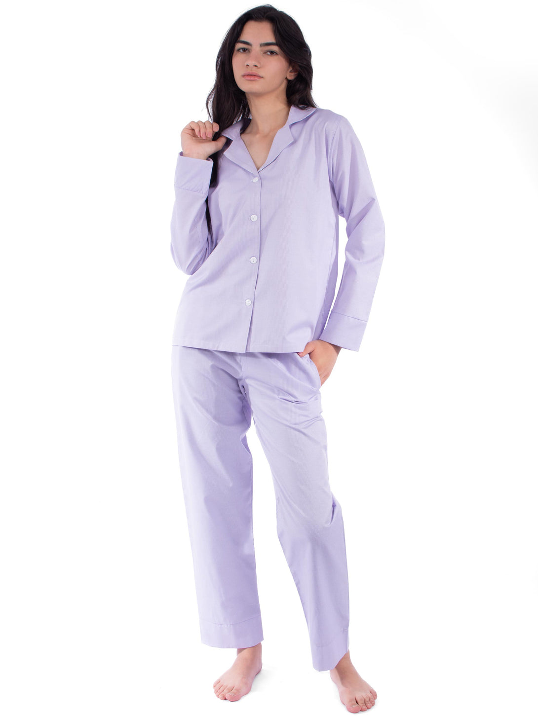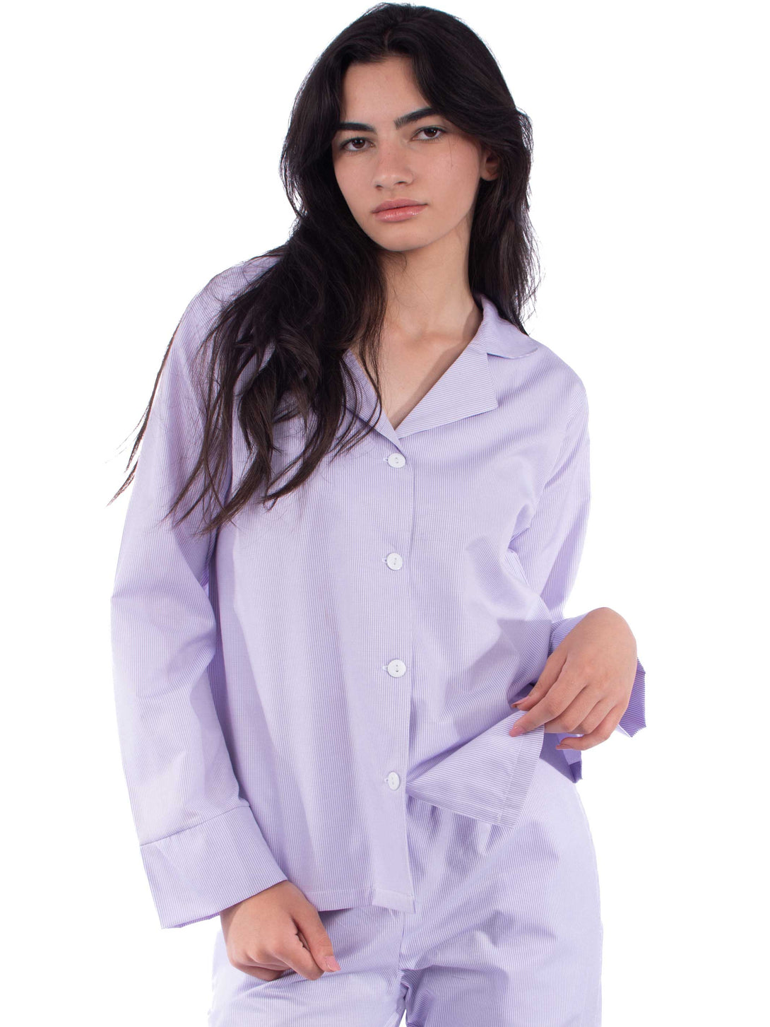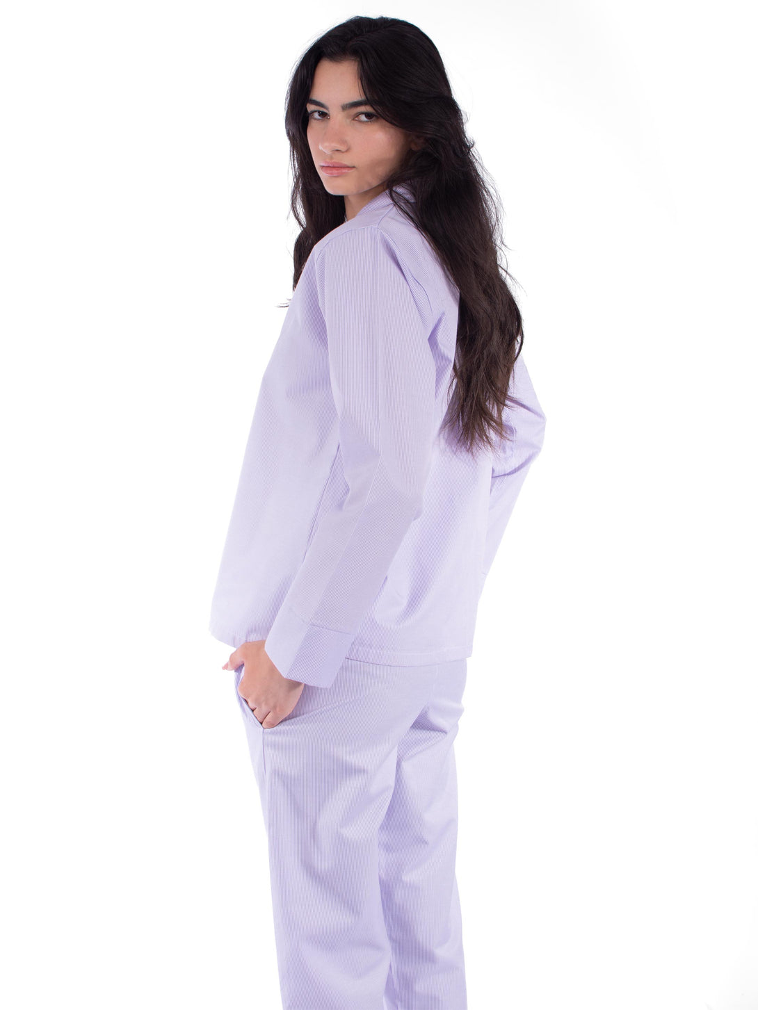 Pyjama Classic, long sleeve Shirt with V-neckline and buttons down the front , Bottoms with an elasticated waist with two side pockets, straight cut legs.