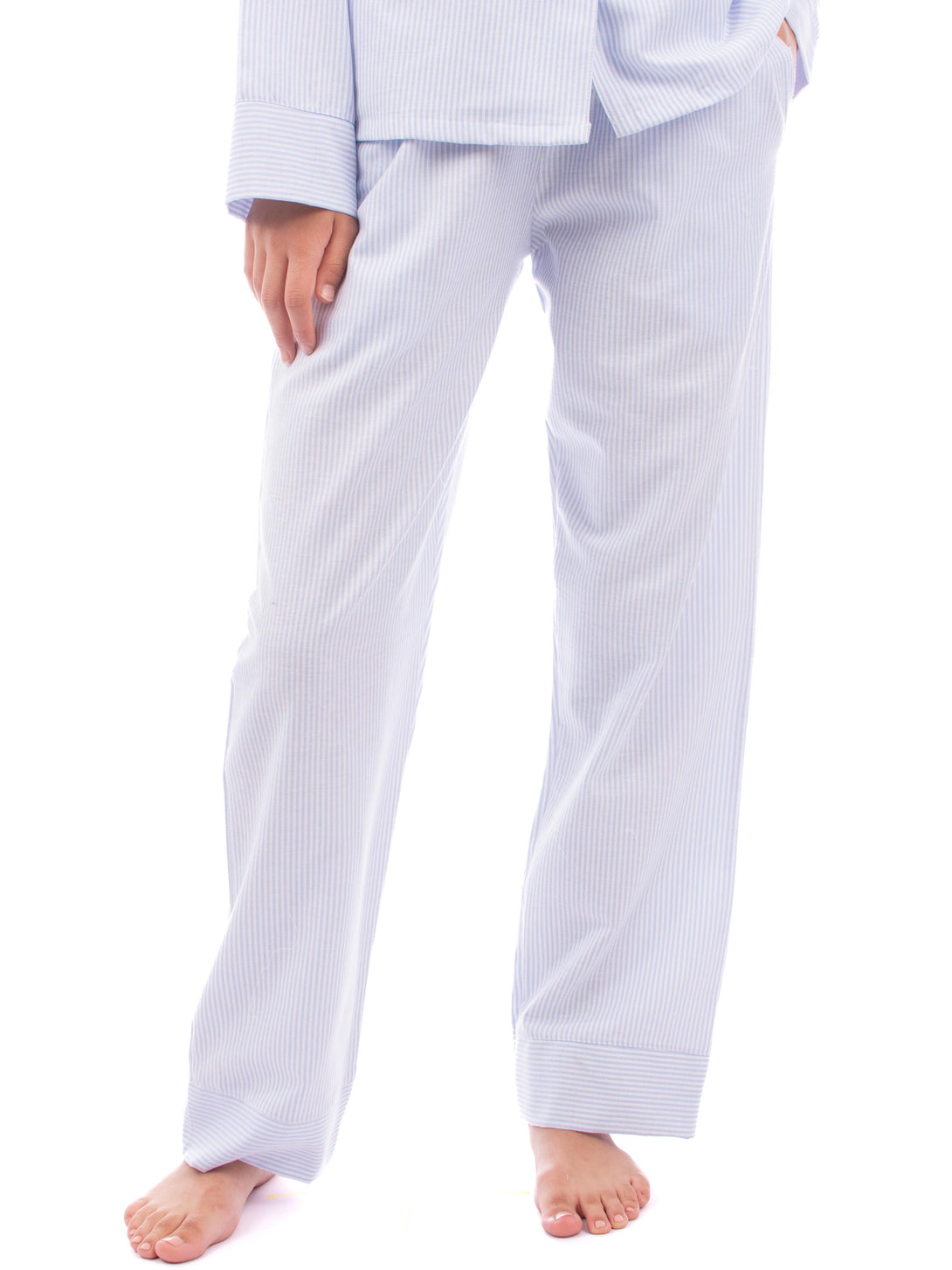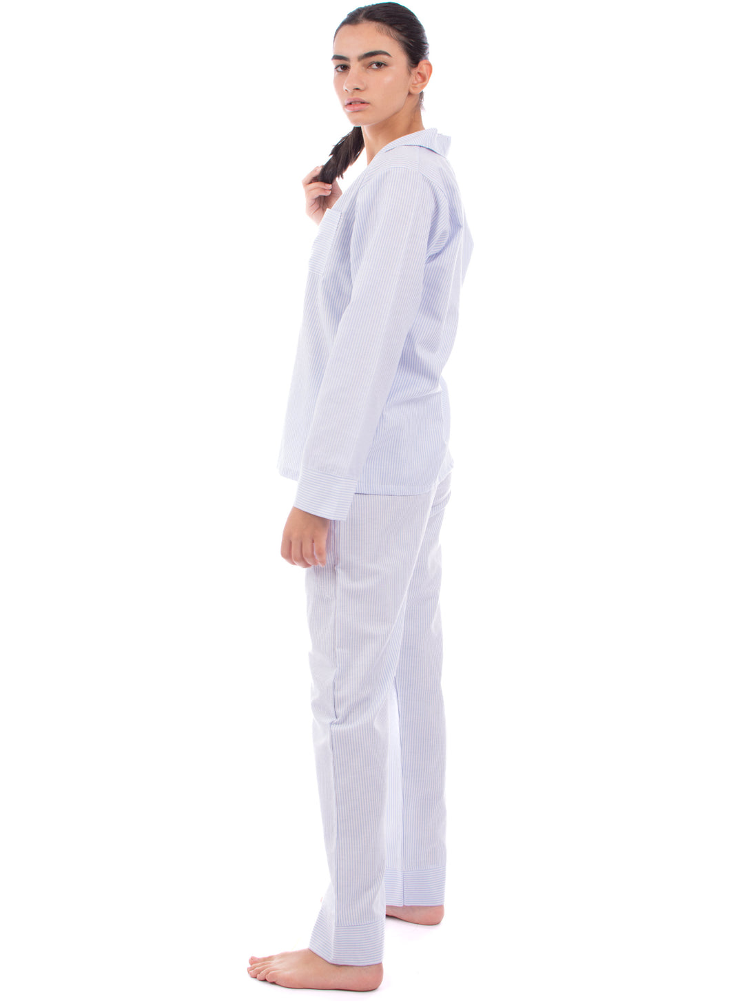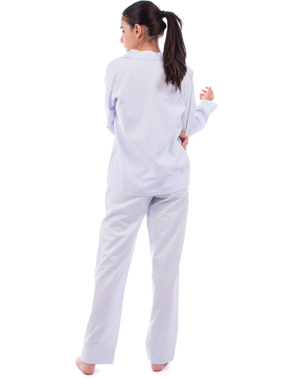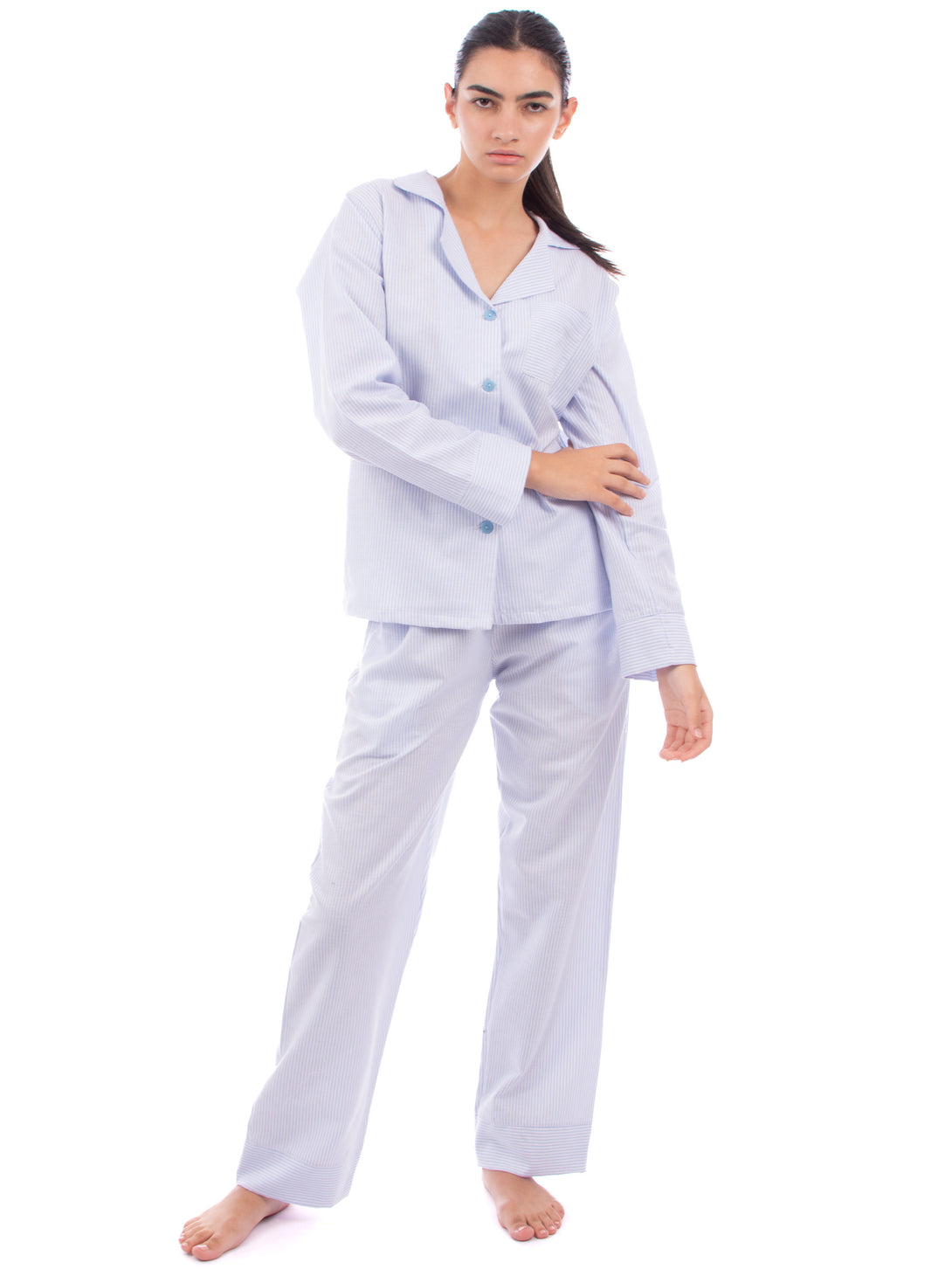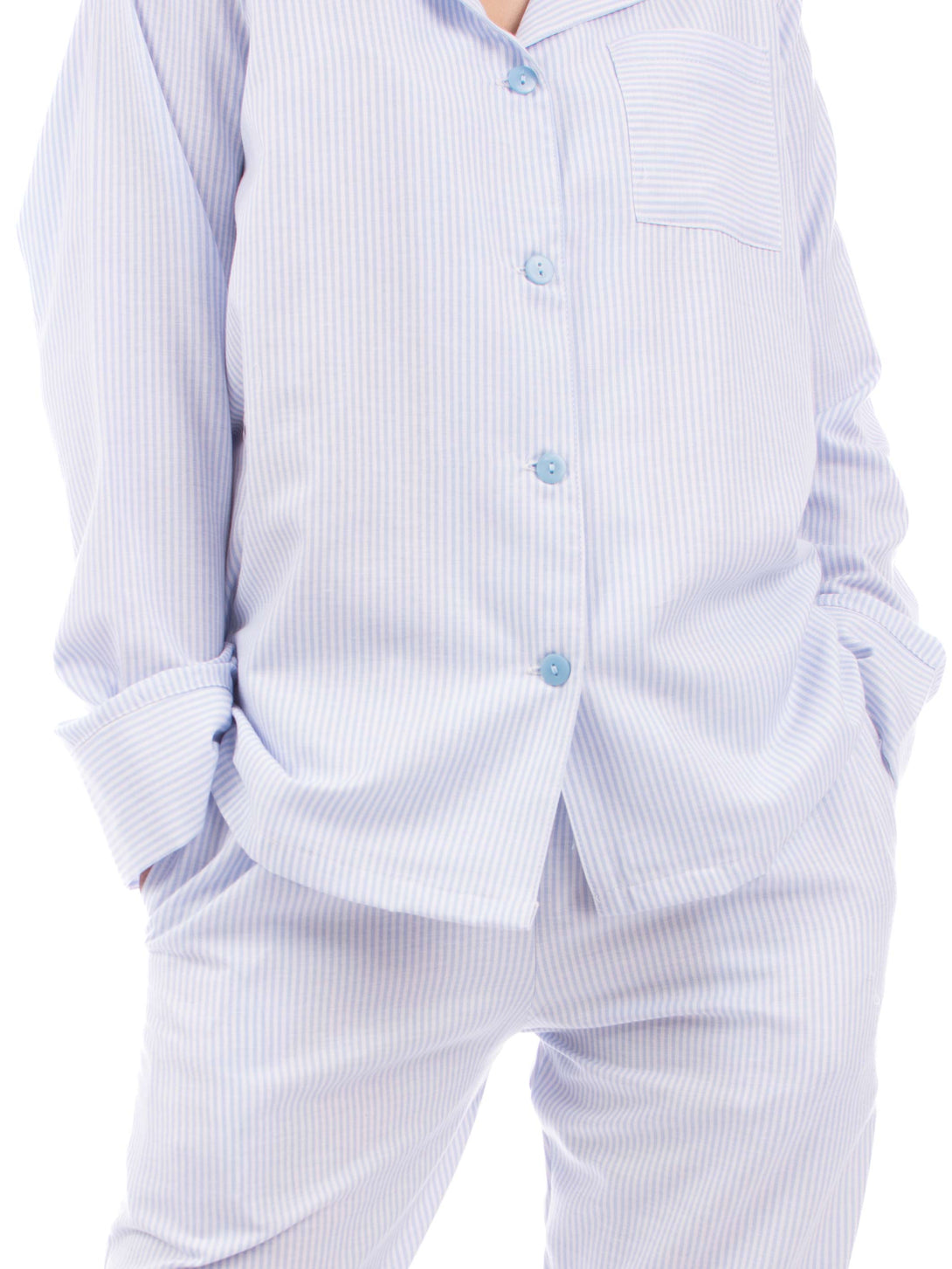 Pyjama Classic, long sleeve Shirt with V-neckline and buttons down the front , Bottoms with an elasticated waist with two side pockets, straight cut legs.