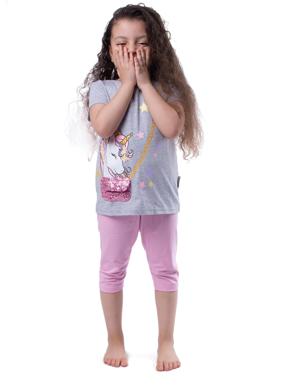 Pyjama crew neck Back cross t-shirt printed unicorn with glitter side bag, with slim fit bermuda.