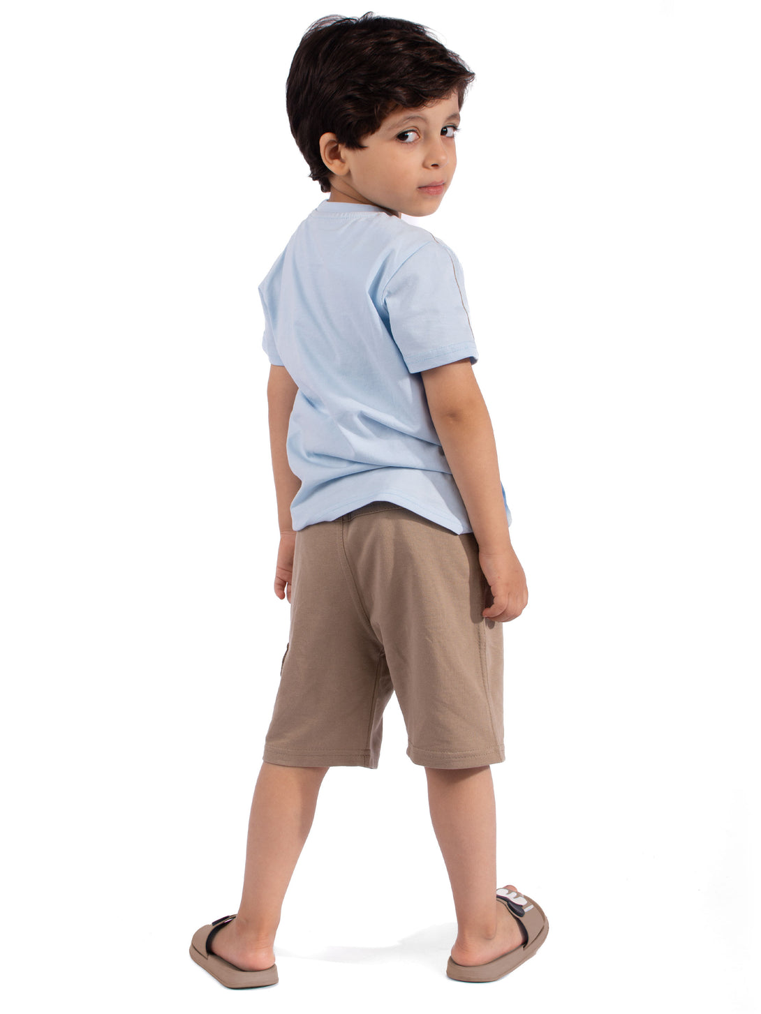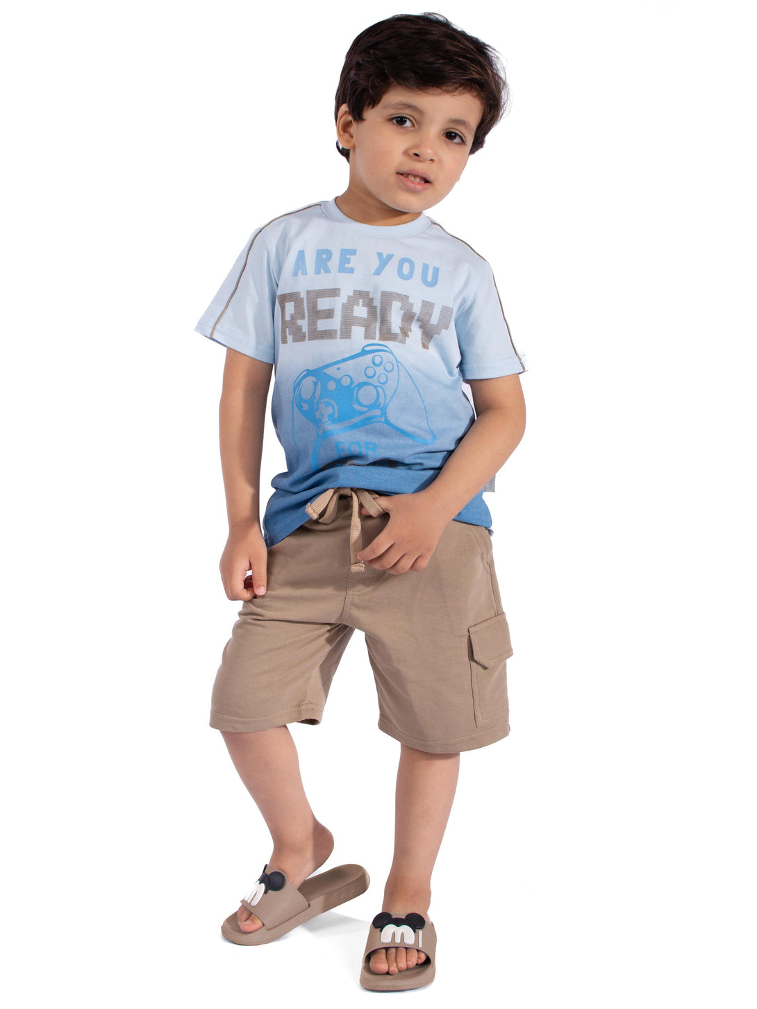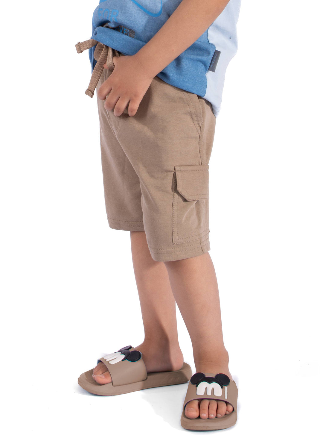 comfortable T-shirt with Cargo shorts in a sturdy cotton weave. Loose fit with an easy pull-on, elasticated waist with a drawstring and a fake fly. Diagonal front pockets, flap leg pockets.