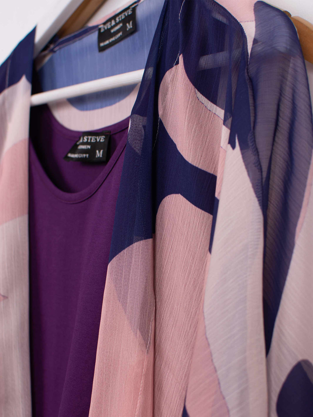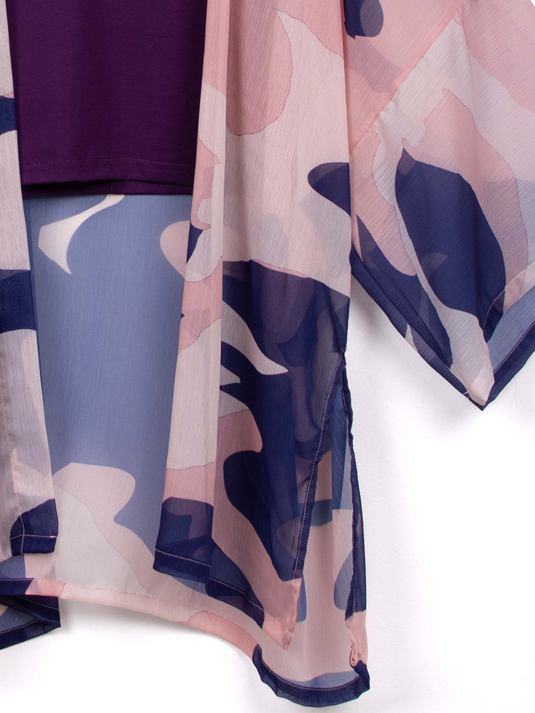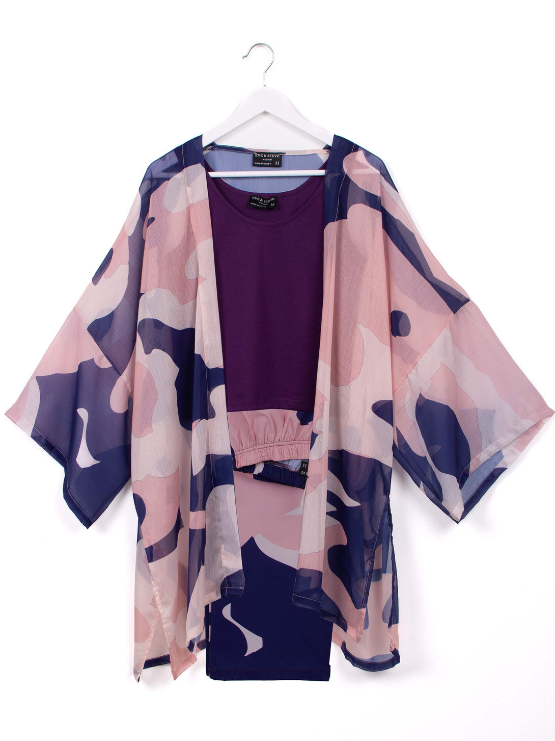 Matching Set of 3 pieces pyjama, Chiffon Kimono with split him, with strap cotton top and straight cut pants with elastic waist.