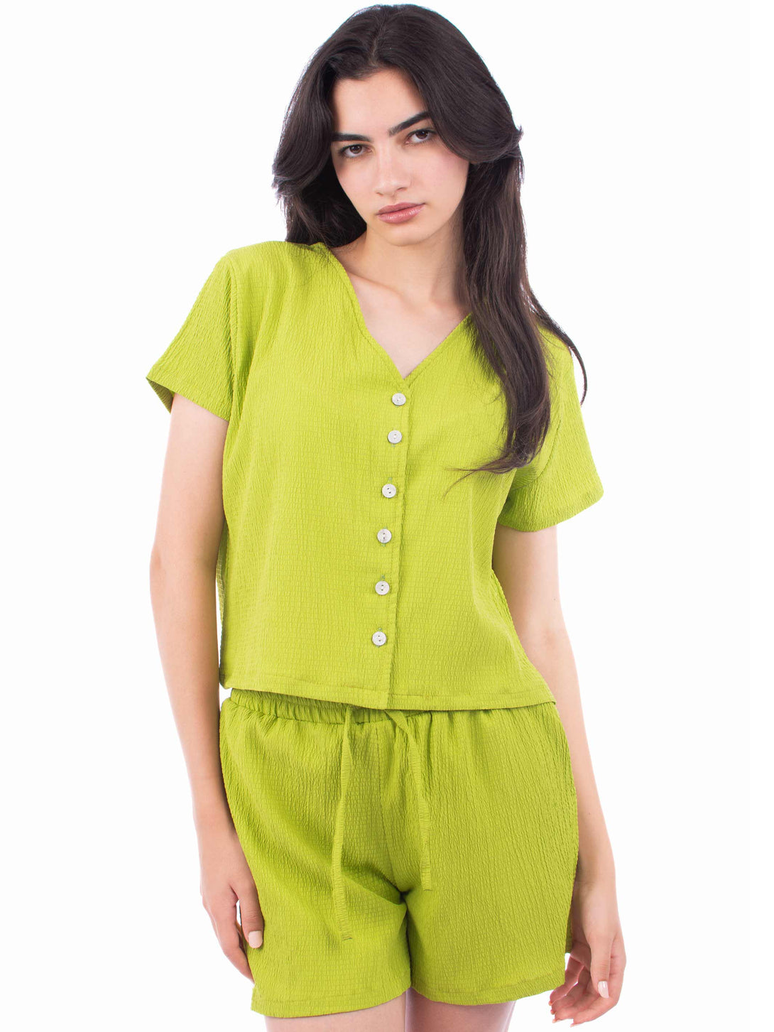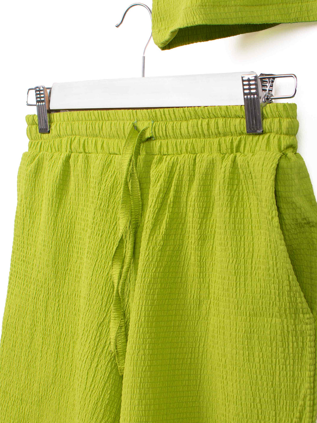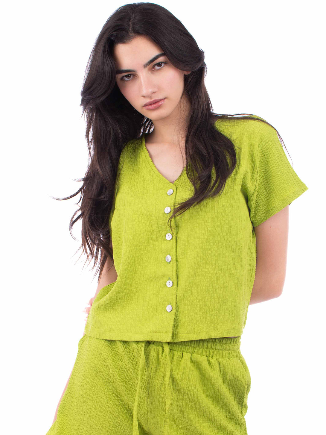 Cropped shirt in airy crepe fabric with buttons down the front. Loose-fit boxy model with dropped shoulders and short, wide sleeves. Loose-fit model with a high waist, covered elastication with a drawstring waist and discreet pockets in the side seams.