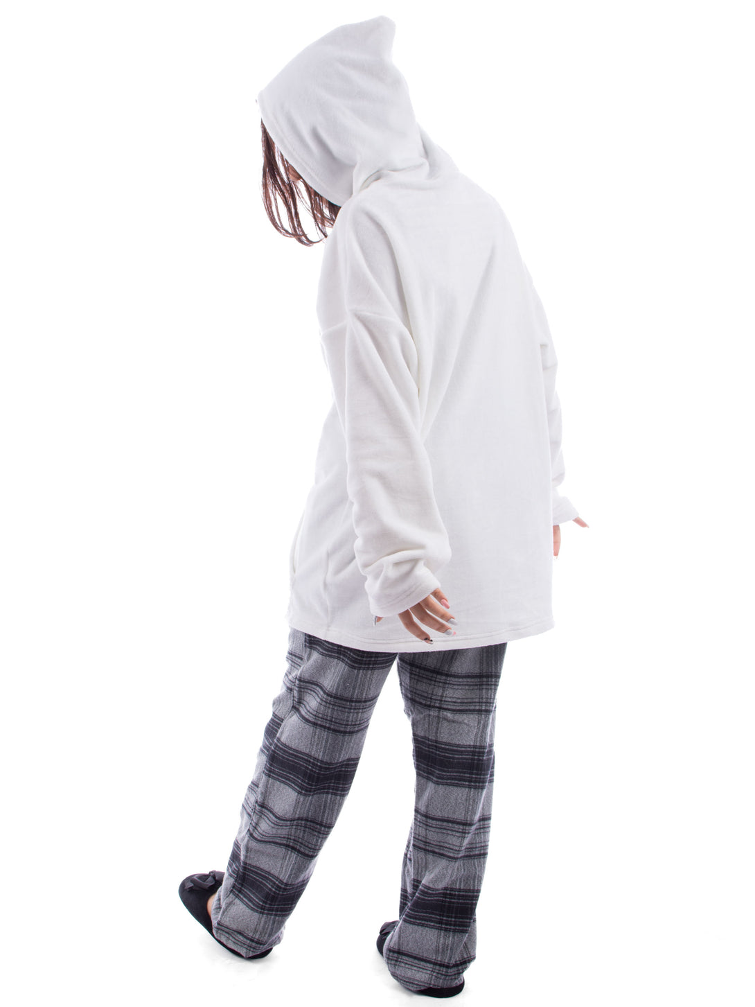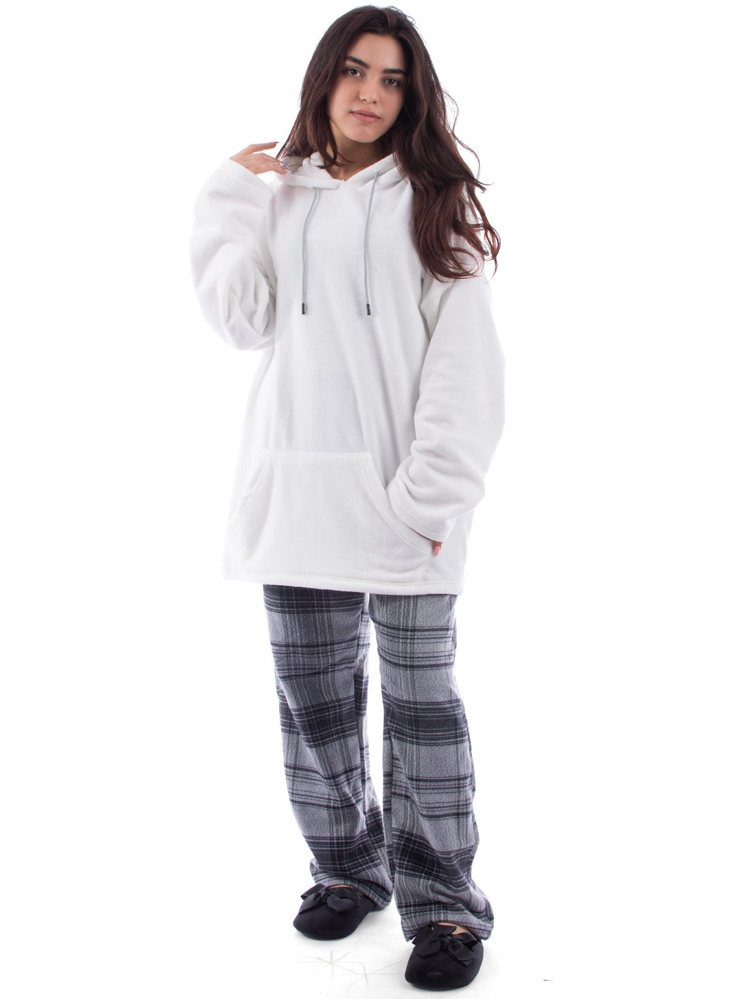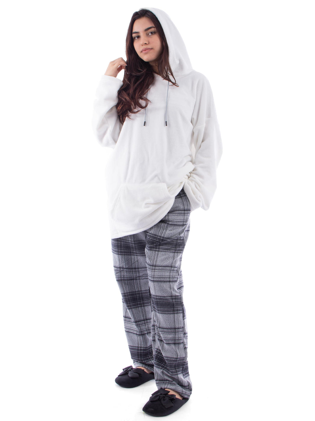 Pyjama set, Fleece hoodie with front big pocket. Checkered comfortable straight cut trousers, elastic at the waist with two side pockets.