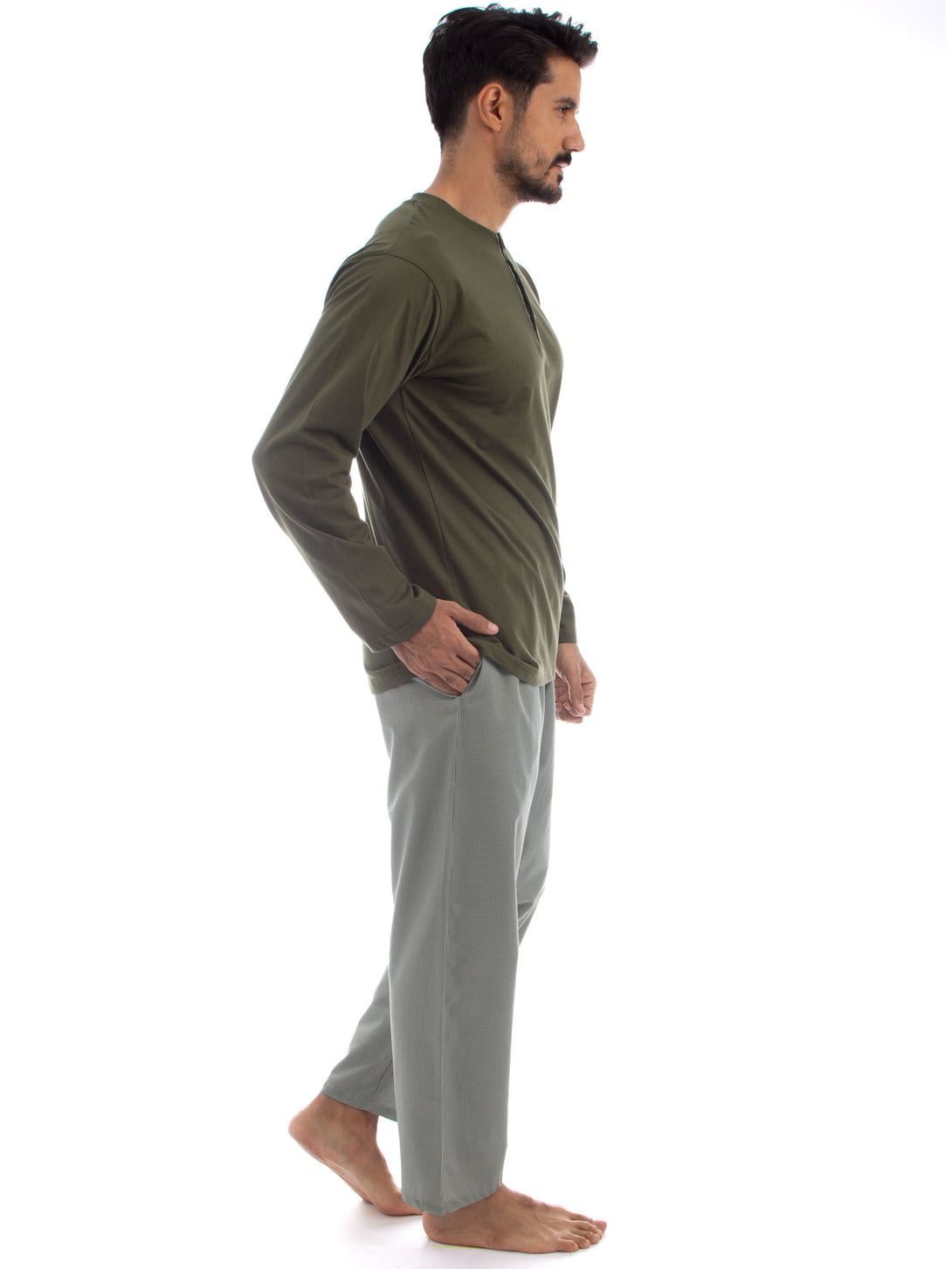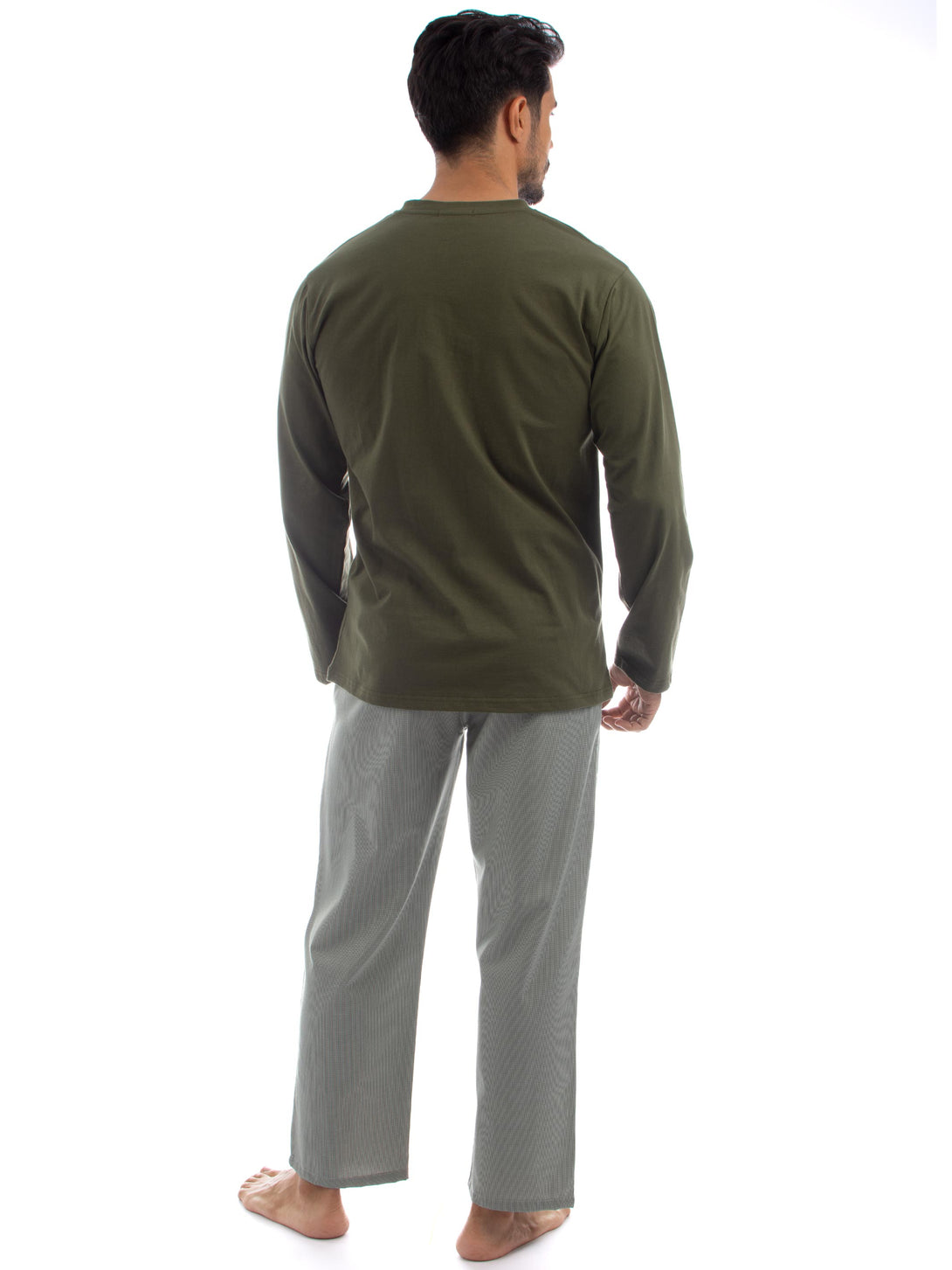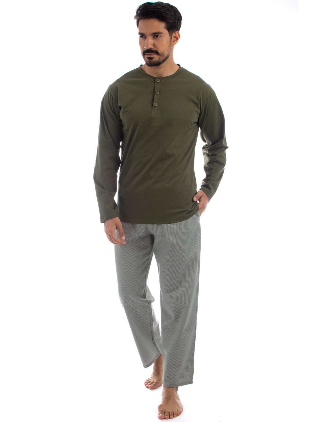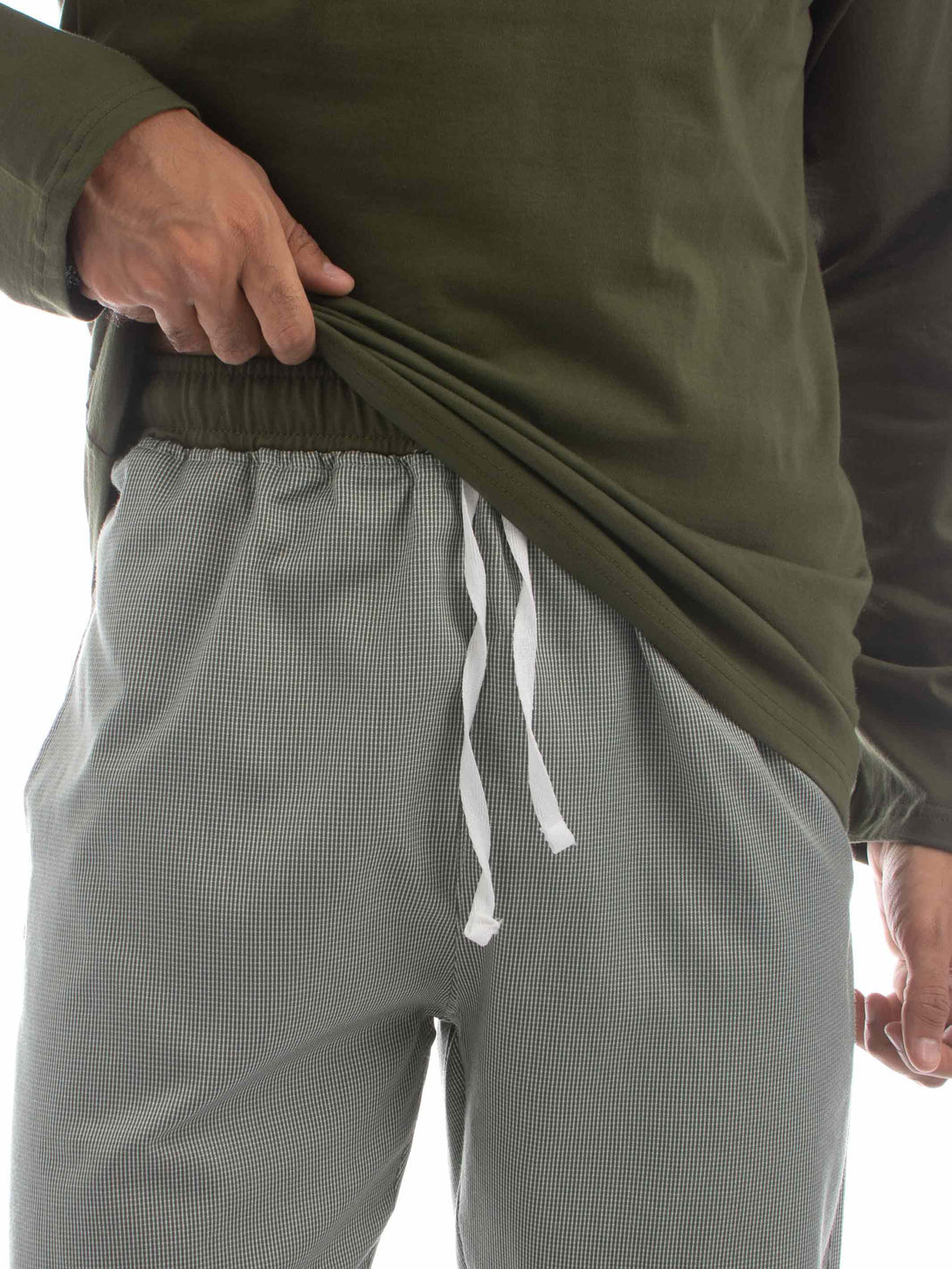 Relax in comfort and style with these cotton-rich pyjamas. Regular fit. Two-piece set comprises a long-sleeved top and full-length bottoms. Button fastening on the top and a drawstring waist with a mock fly on the bottoms. Handy side pockets.