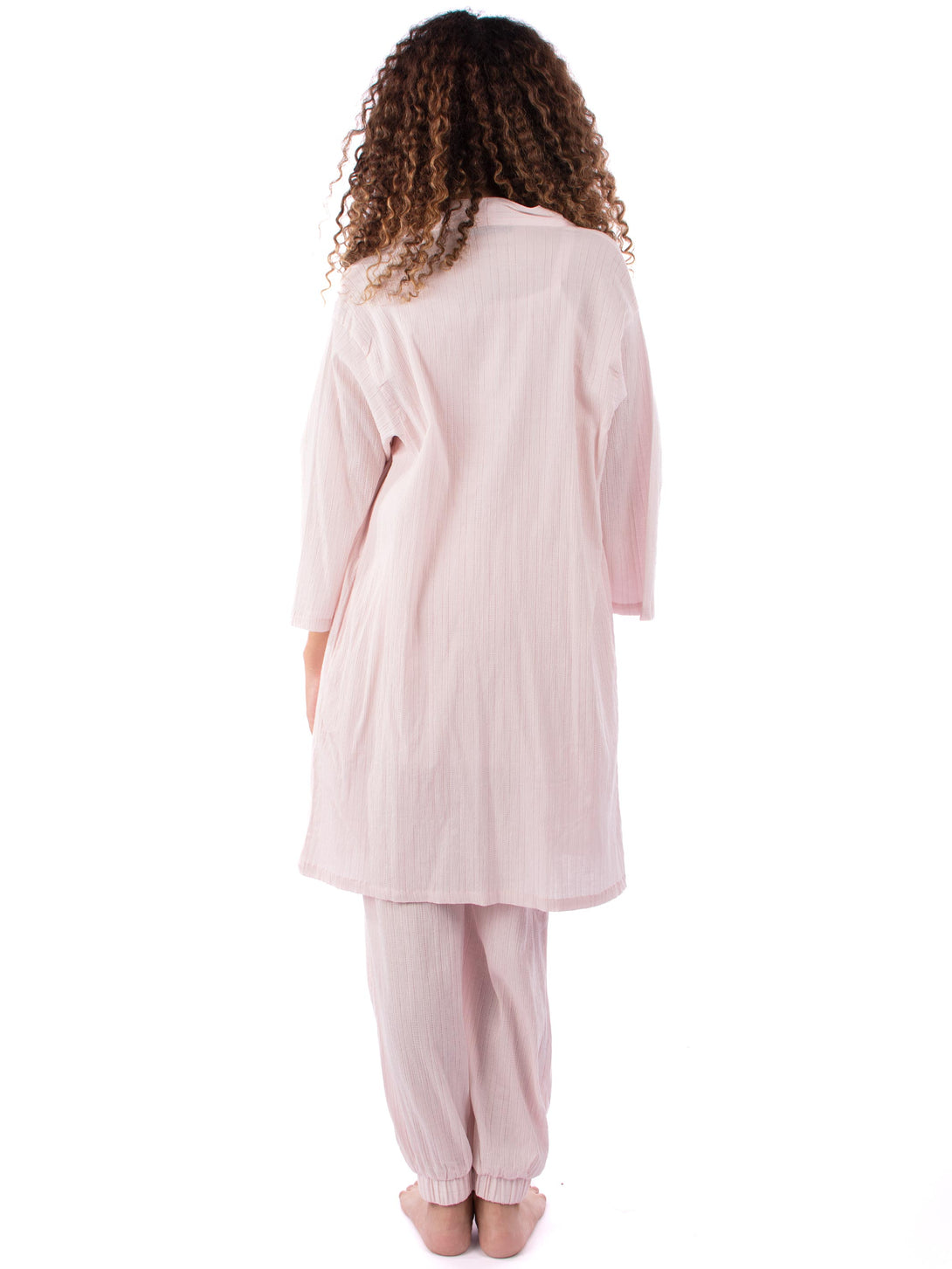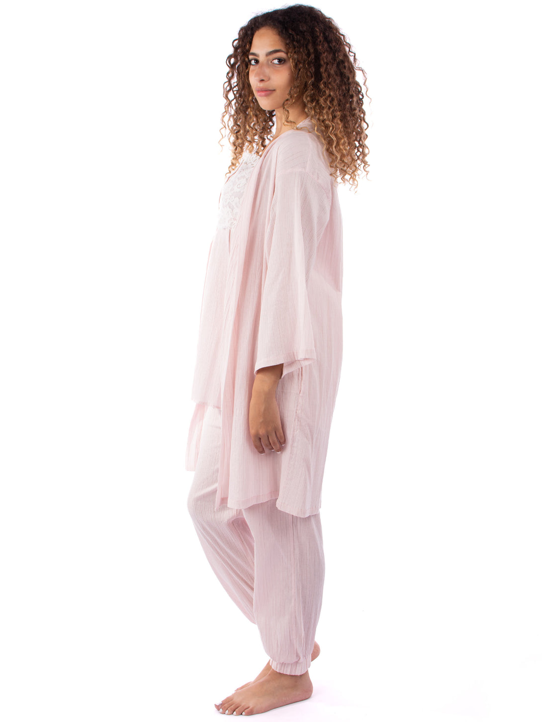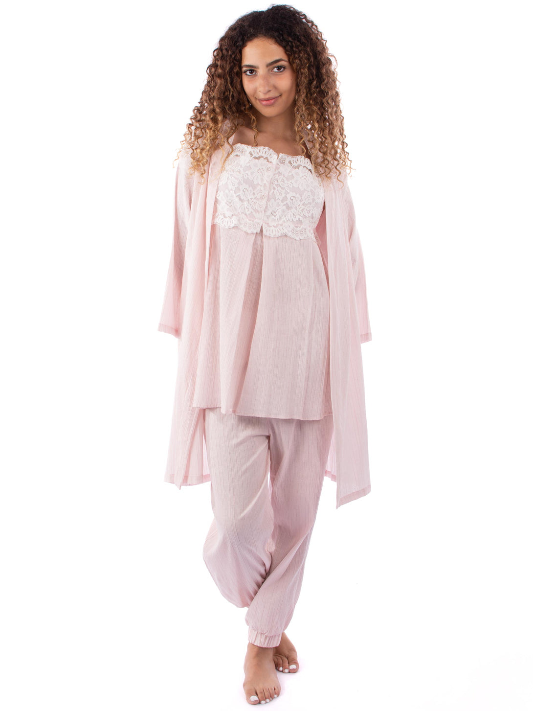 Super Soft Dress with Lace Details and transparent Button with lace details Front Opening for Easy Nursing with Matching Long Sleeved Robe with 2 side pockets and comfortable pants with adjustable elastic on waist.