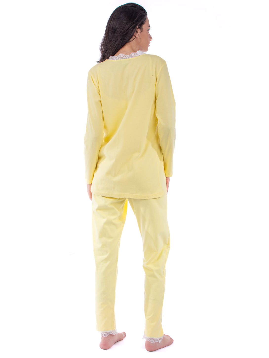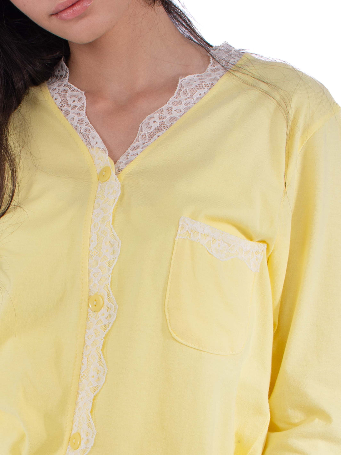 Pyjama set, Shirt with V-neckline and buttons down the front, chest pocket with small embroidered lace in detailed edges . Pants with an elasticated waist and straight legs.