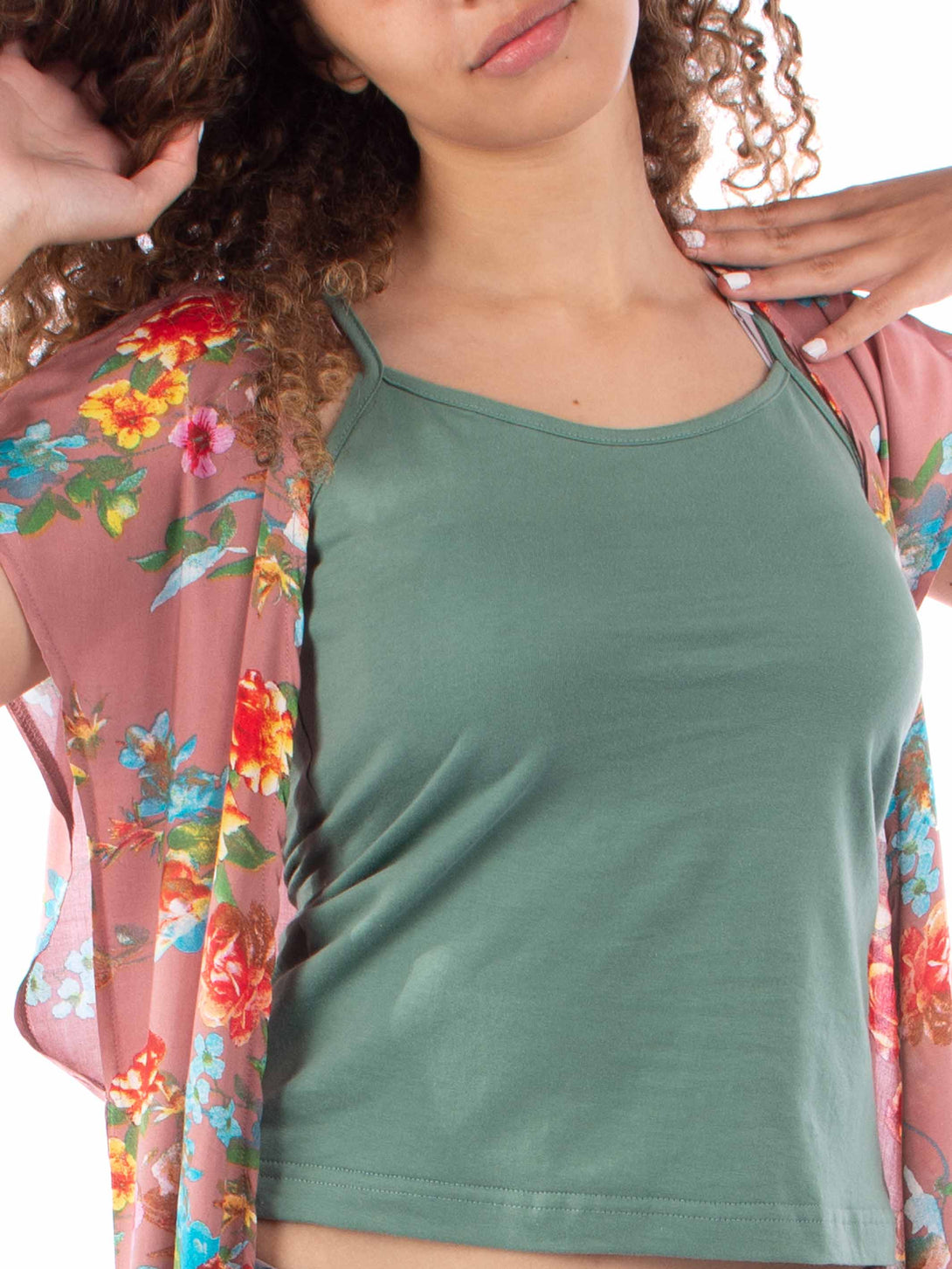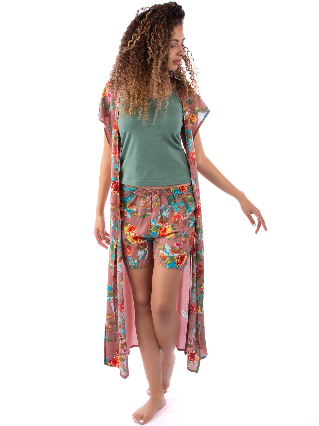 Matching Set of 3 pieces pyjama, long Kimono, cotton strap top and comfy shorts with elastic waist.