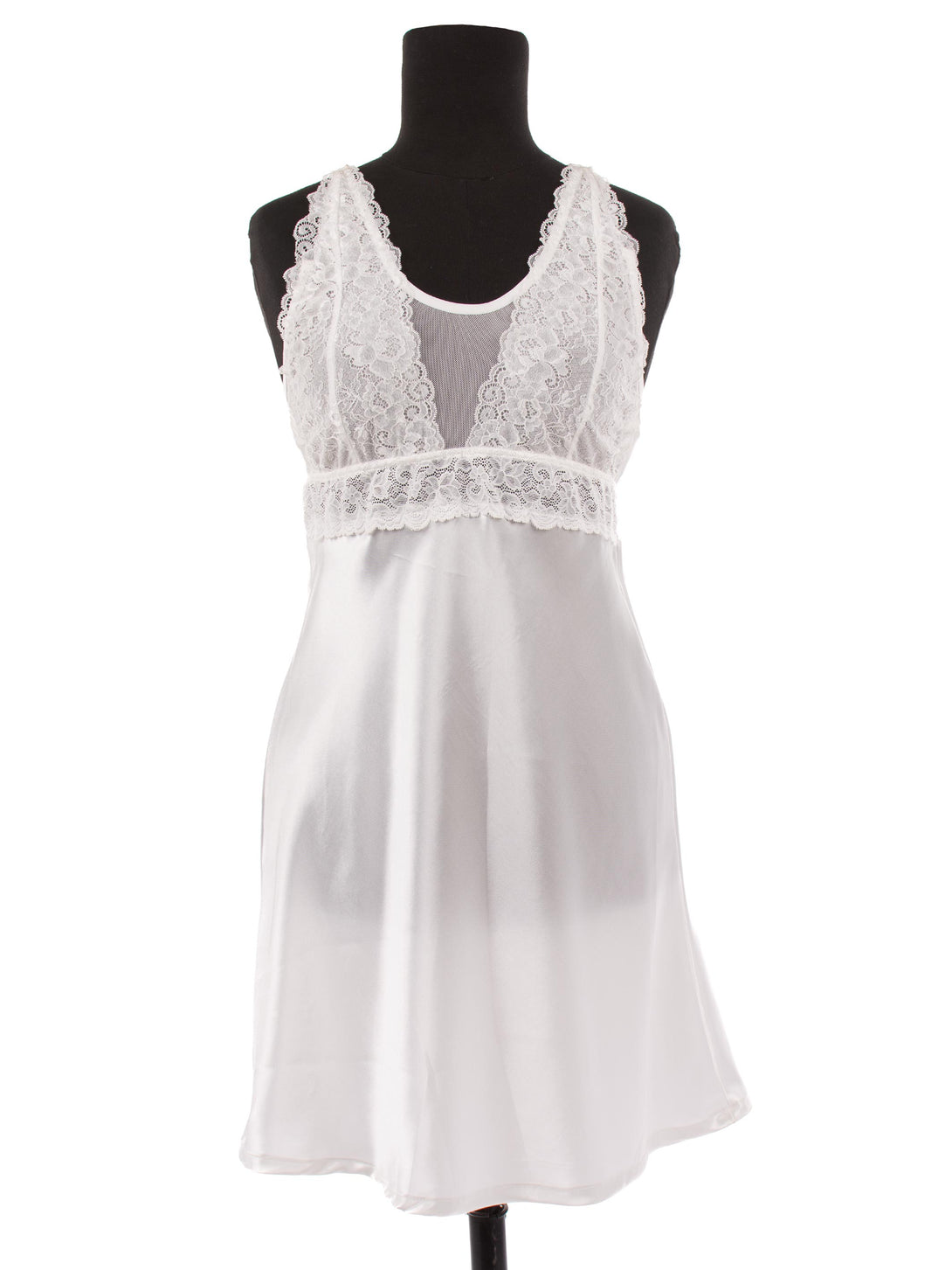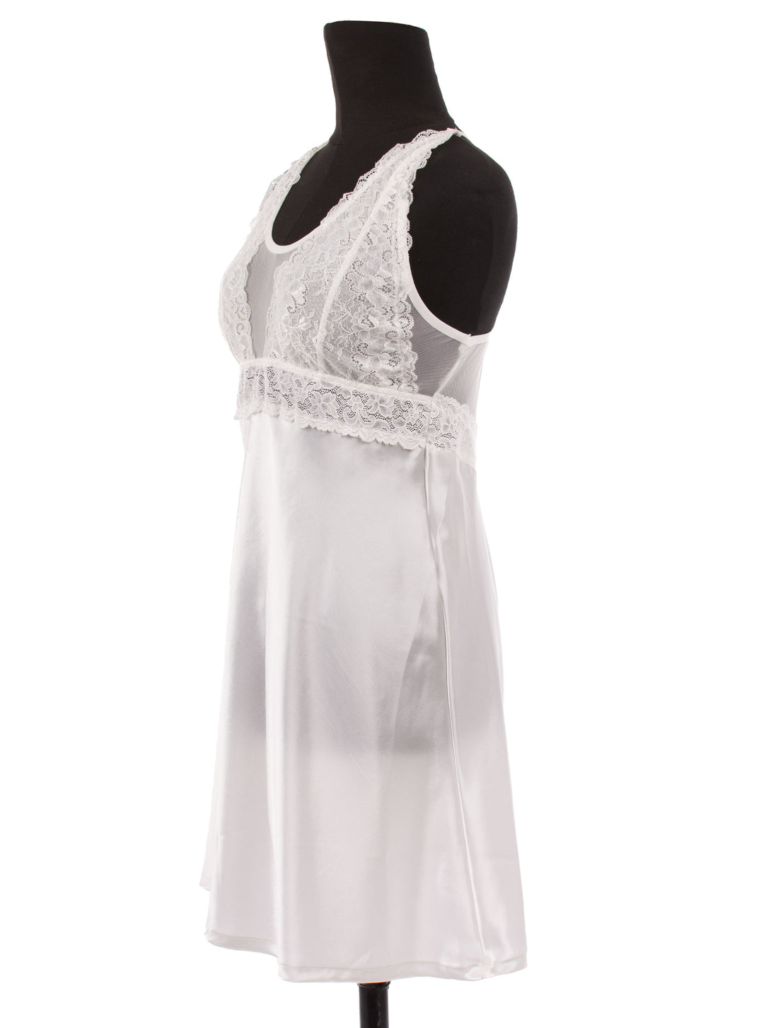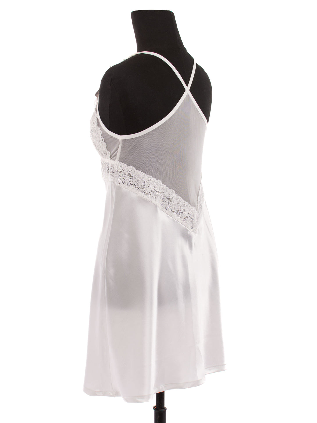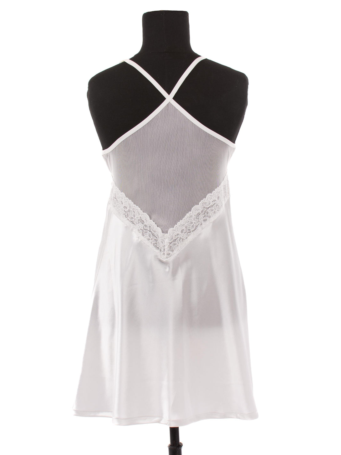 Mini Nightgown, soft shinny Satin with Lace cup, low Back transparent Tull with cross Straps.