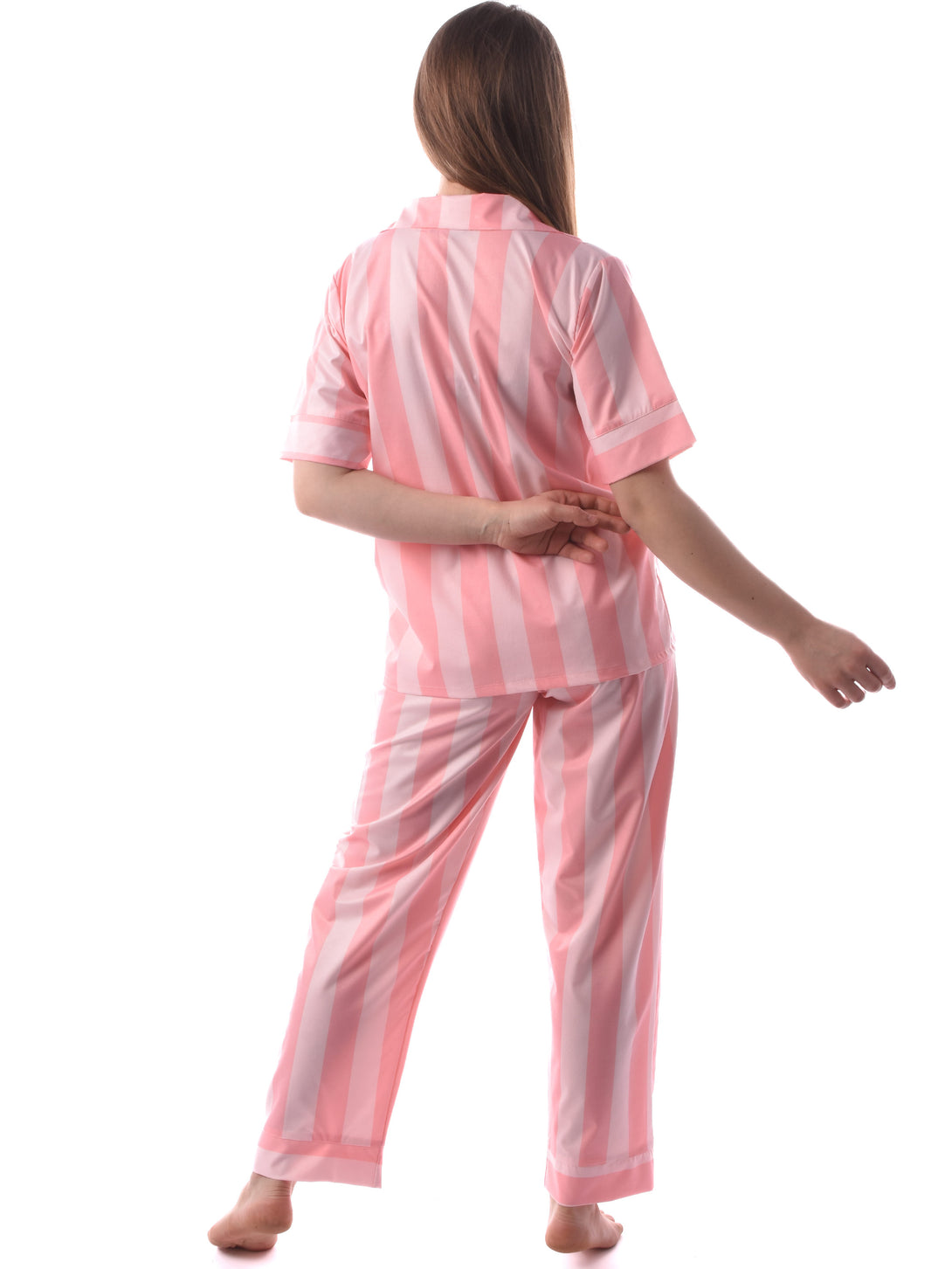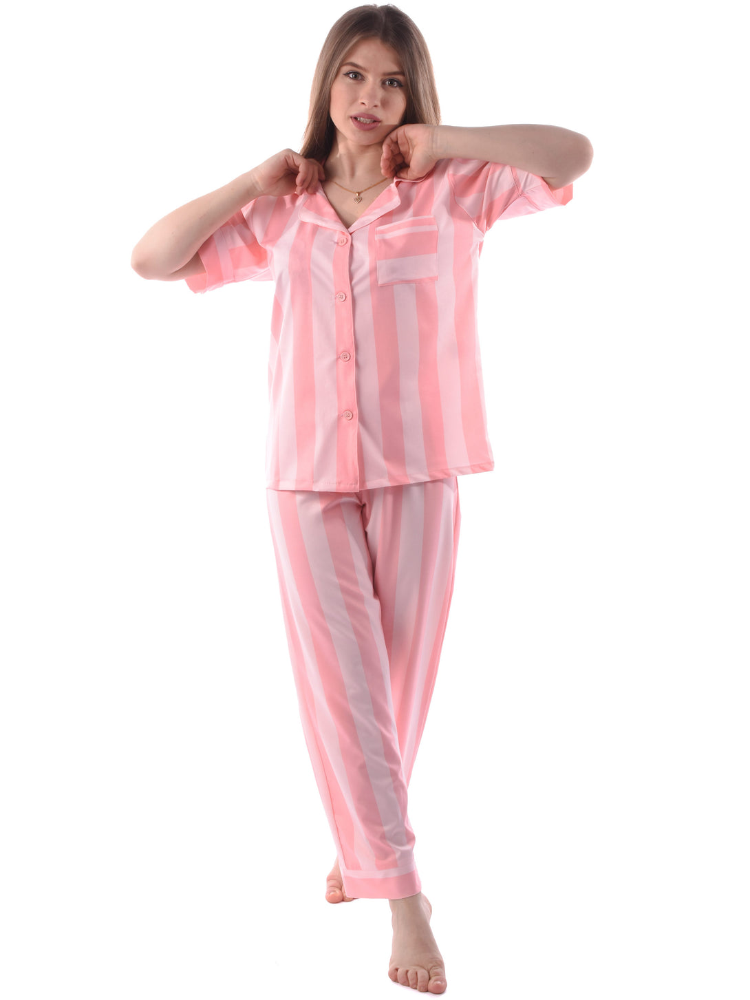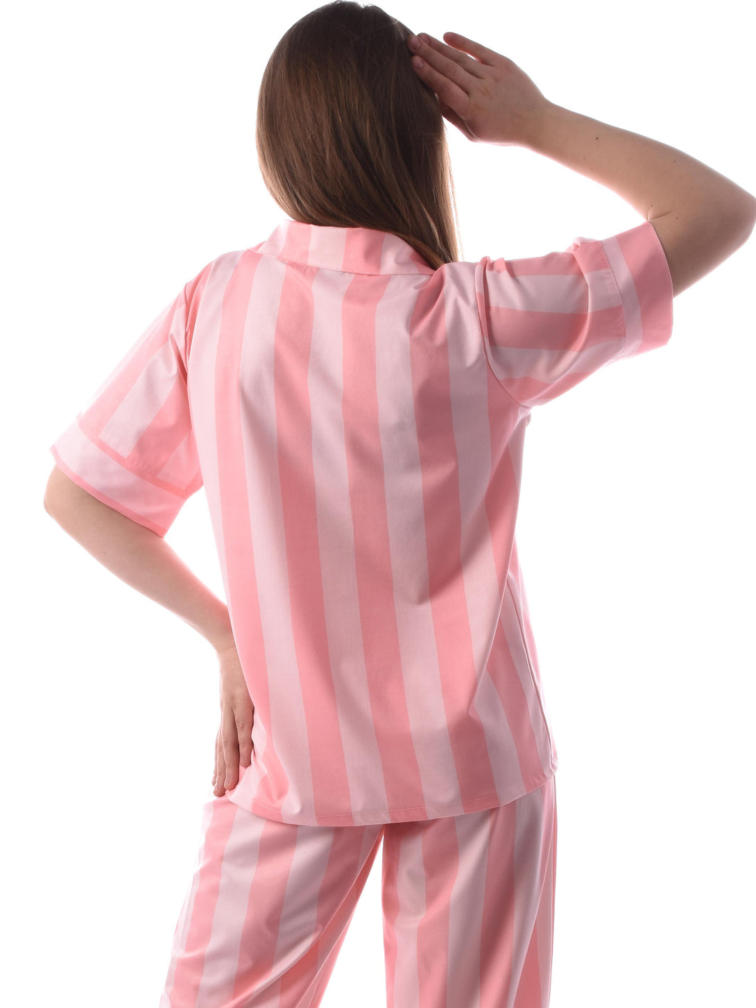 Pyjama Set, a Shirt with V-neckline and buttons down the front, chest pocket. Bottoms with an elasticated waist and straight legs.