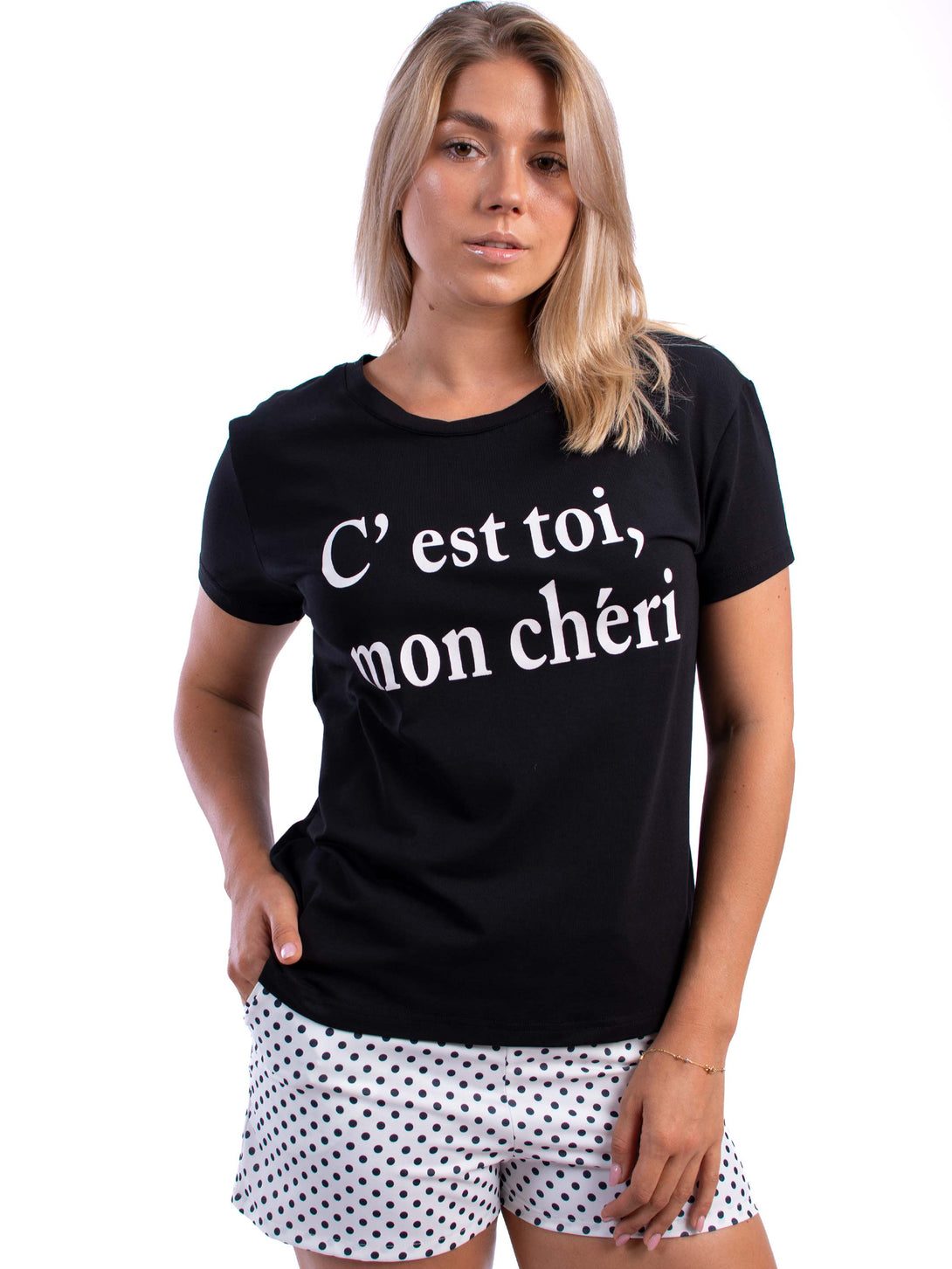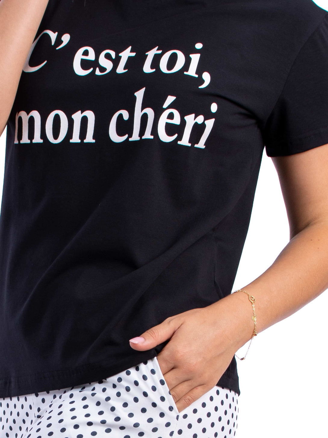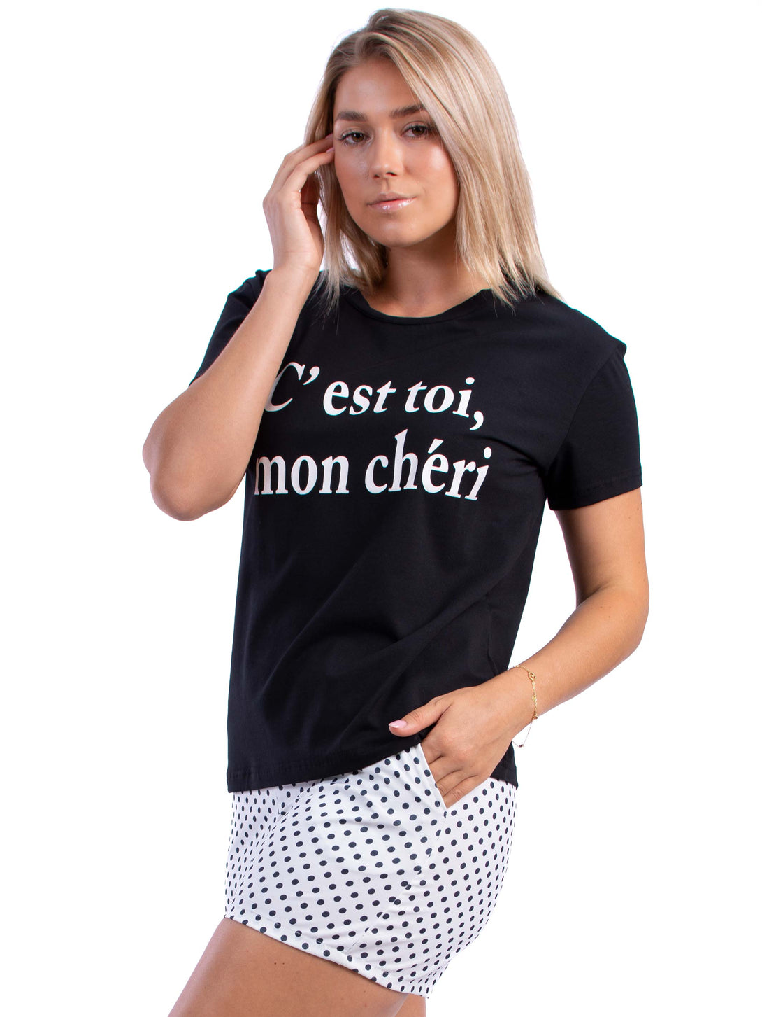Pyjama set, Short-sleeved straight-cut top with a round, rib-trimmed neckline and a text on the front. Polka dots shorts with covered elastic at the waist and two side pockets.