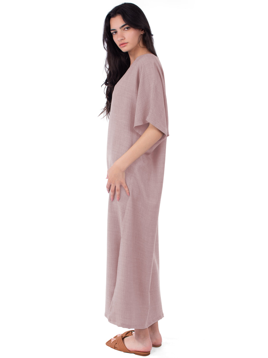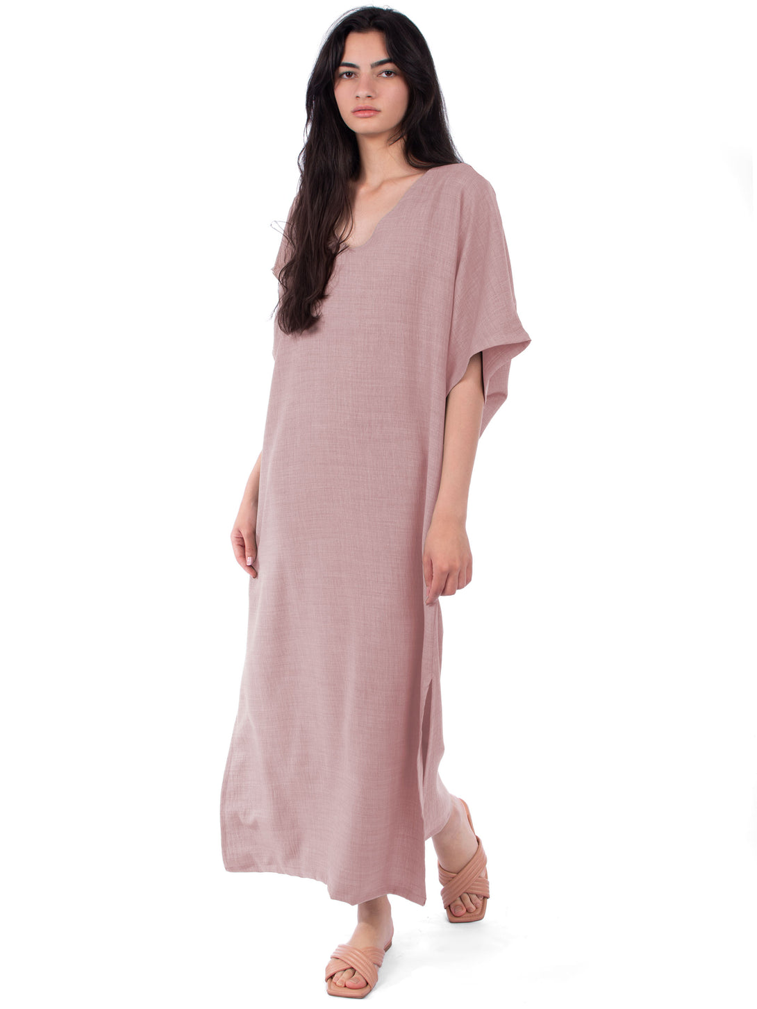 Short-sleeved tunic dress with V-neck. Side slits. Stone details on the neckline.