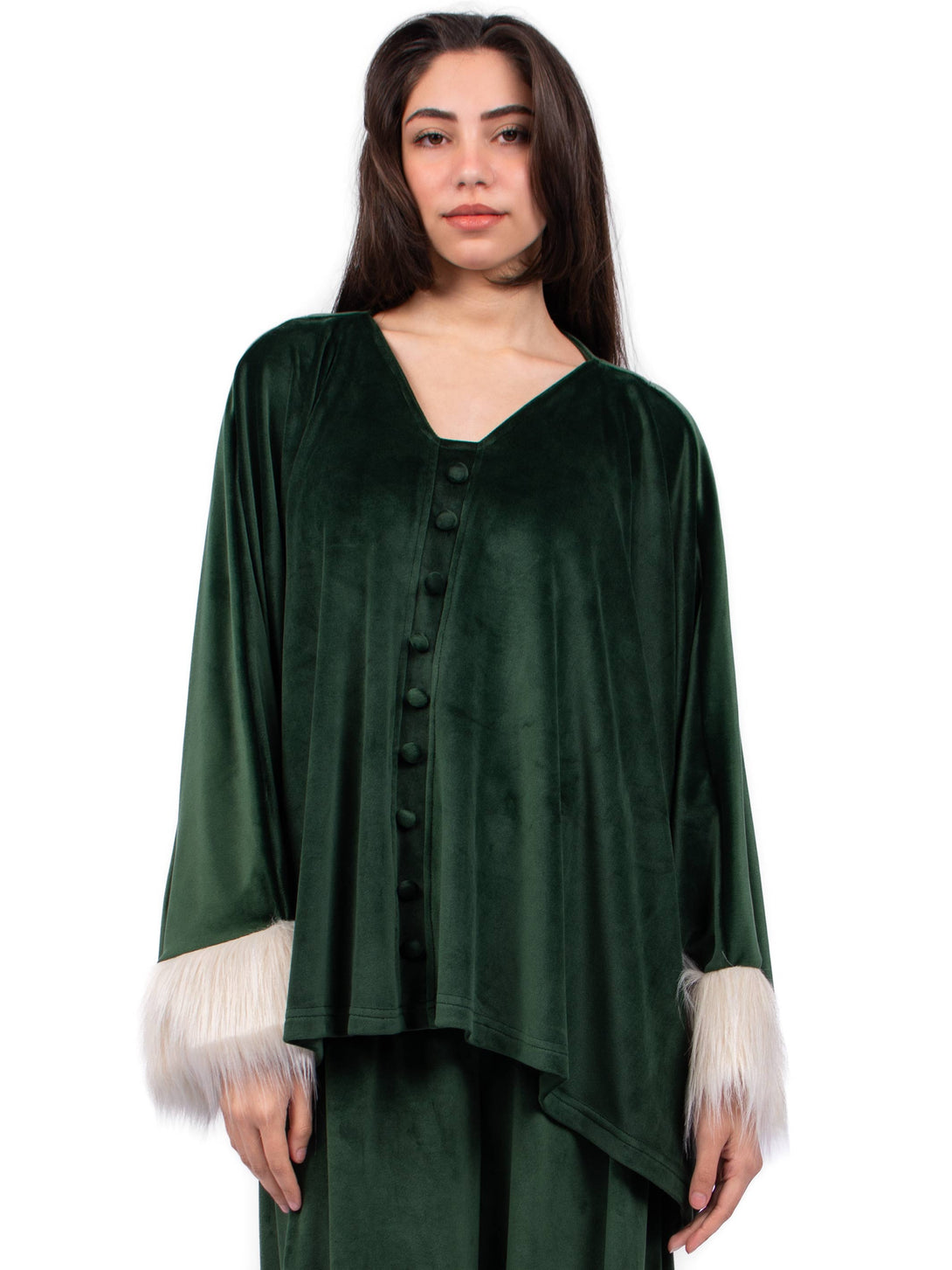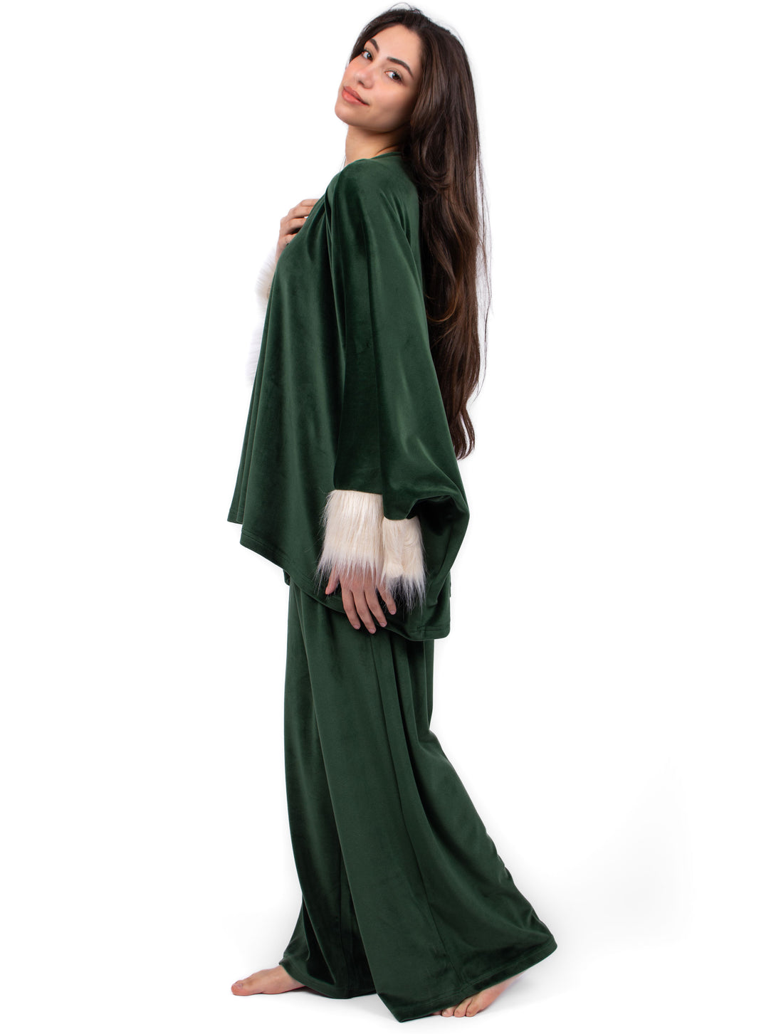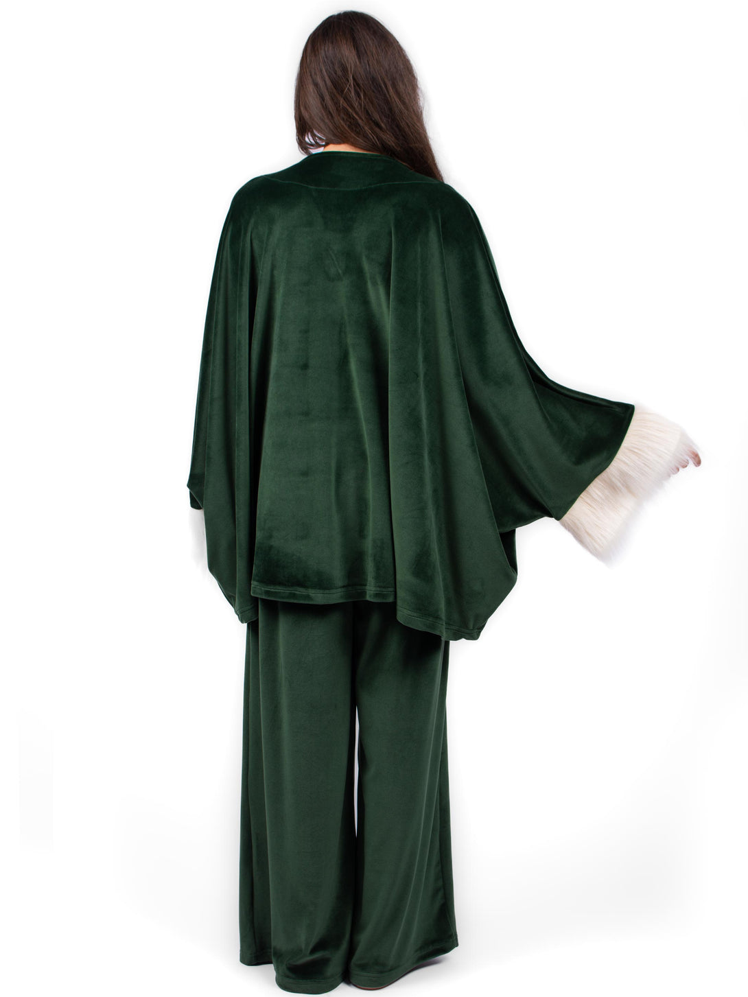 Velvet pyjama, A fluffy fleece set of Pancho with faux buttons and Wide-leg cut pants with elastic waist.